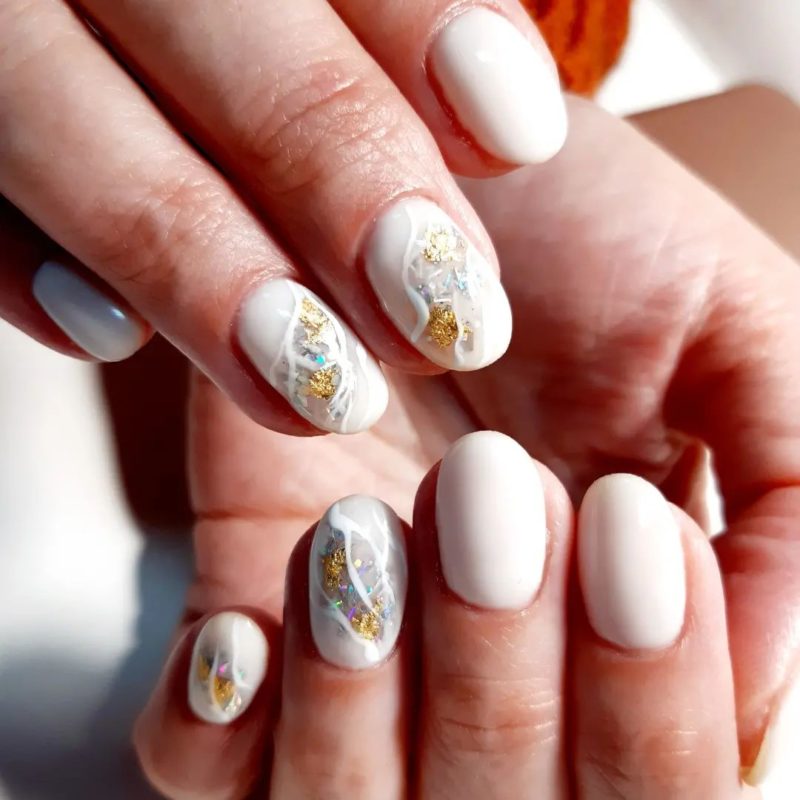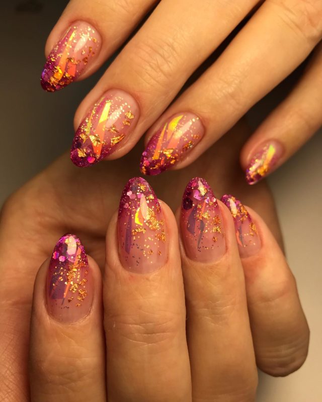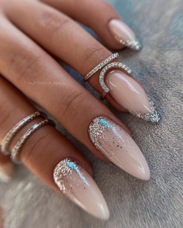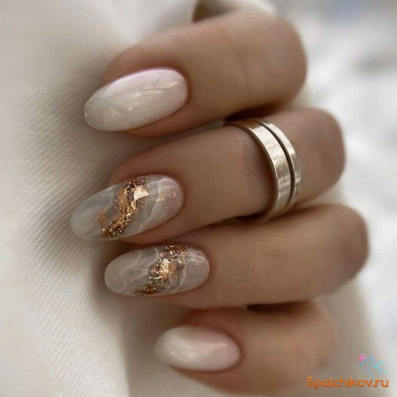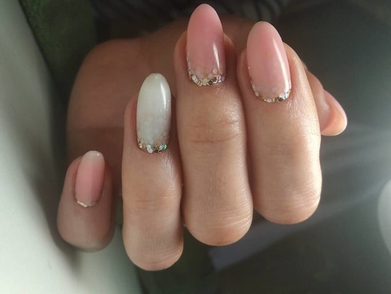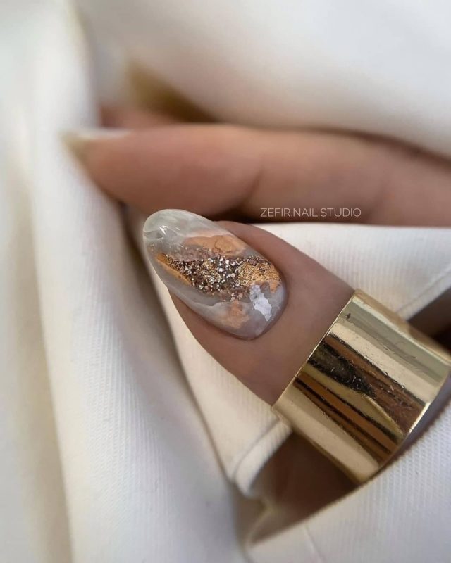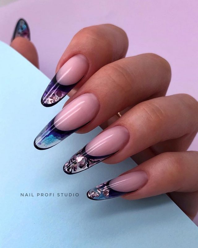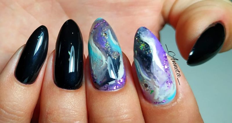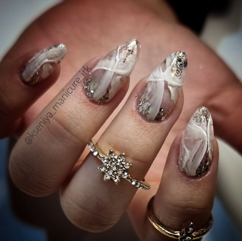 Лунный аквариумный маникюр очень выгодно смотрится на миндалевидных ногтях. Его можно делать с помощью не только лака, но и фольги, мелких бусин, песка или страз. В любом случае лунный маникюр уже давно стал классикой, а аква-техника помогает обновить устоявшийся дизайн.