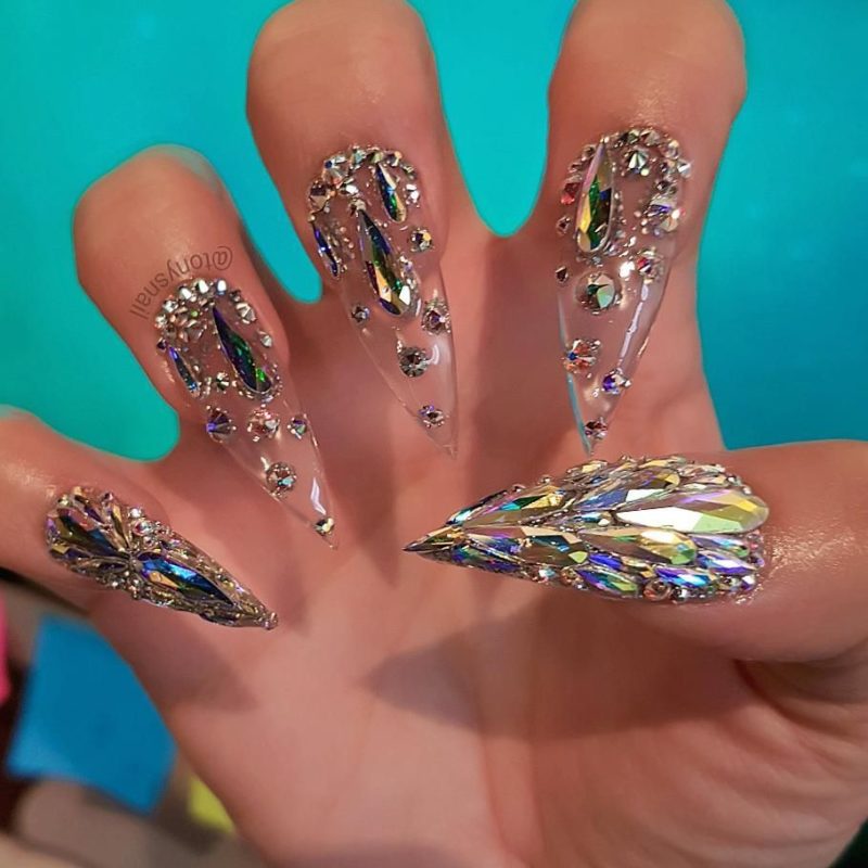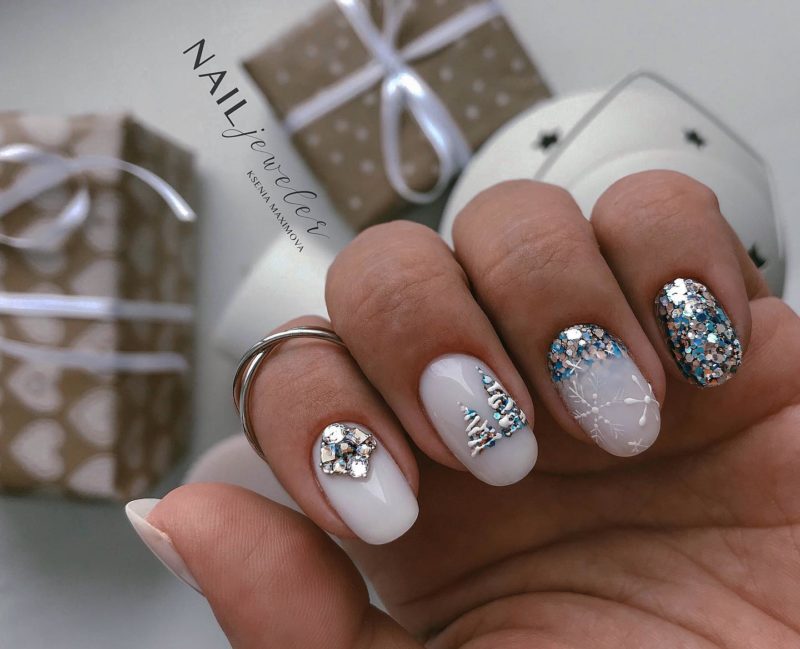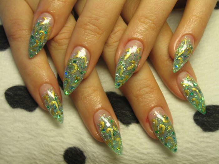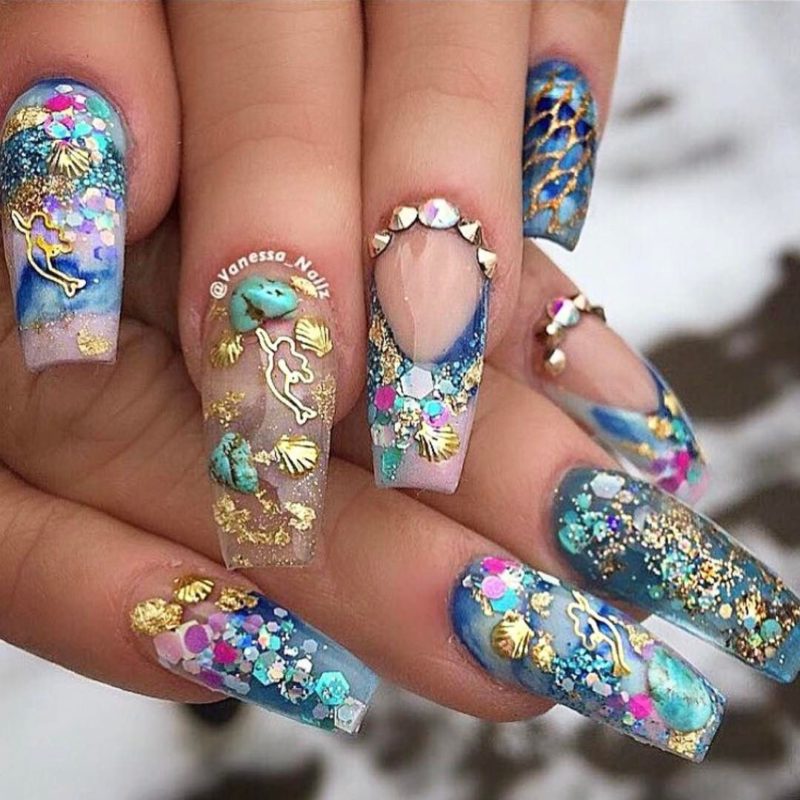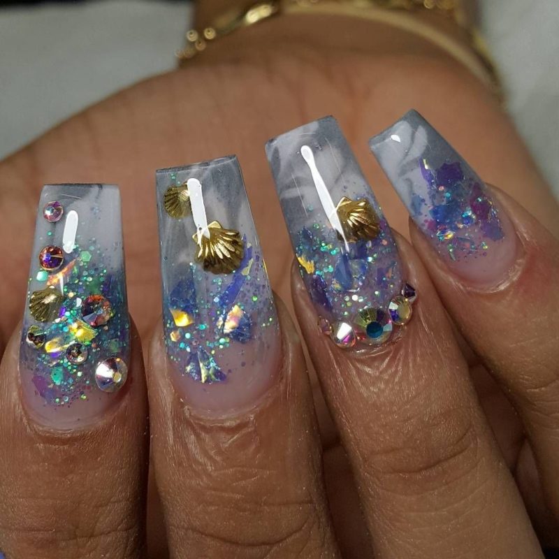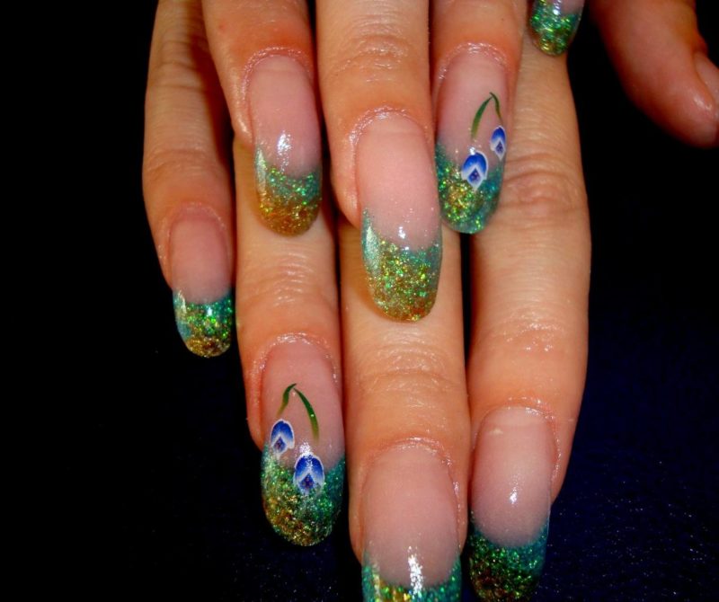 Блёстки и стразы лучше всего подойдут для вечерних вариантов аквариумного маникюра, однако их можно использовать и для повседневных вариаций. Перья же не сильно распространены в качестве элементов декора маникюра, однако аквариумный маникюр с ними никого не оставит равнодушным.