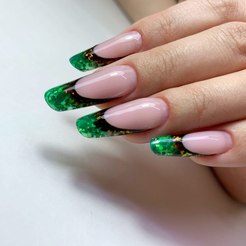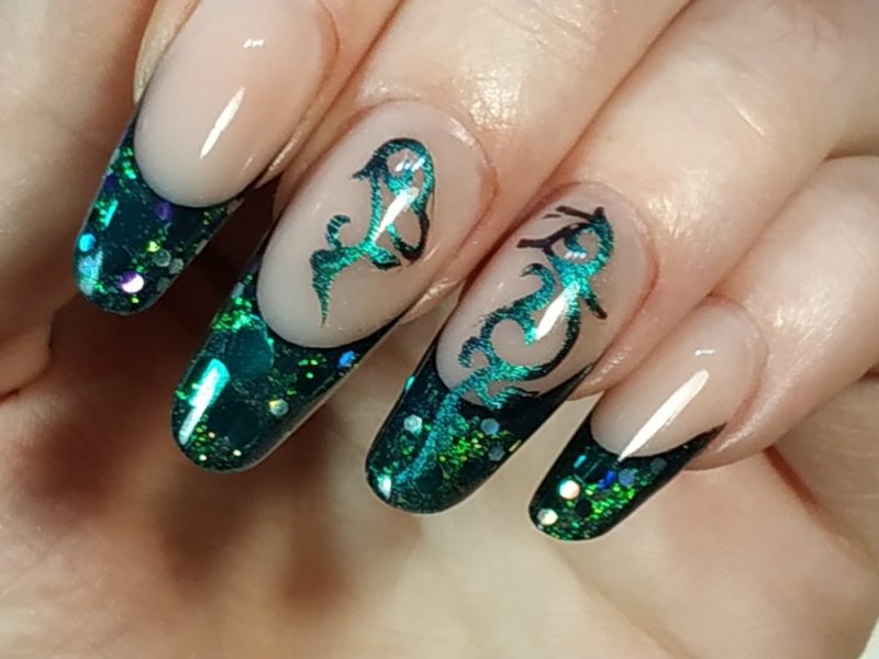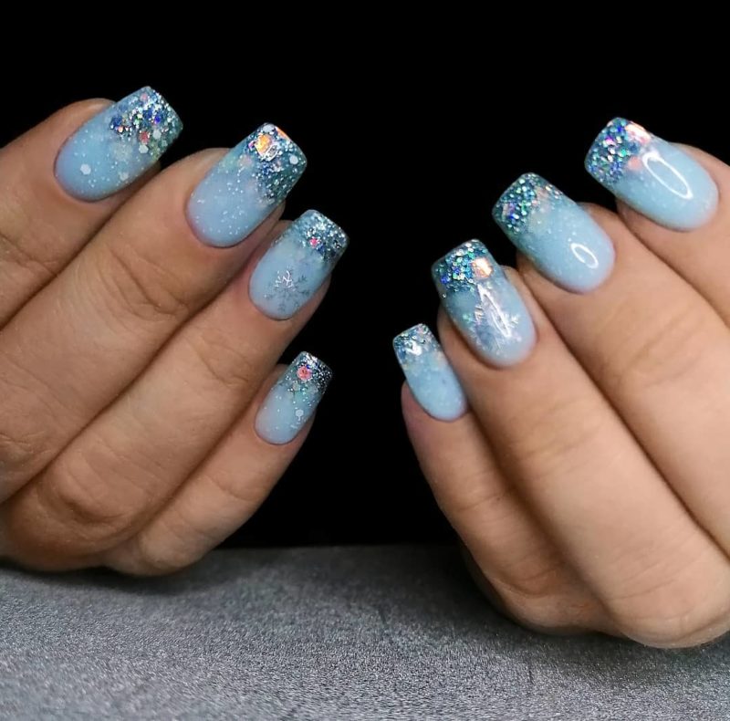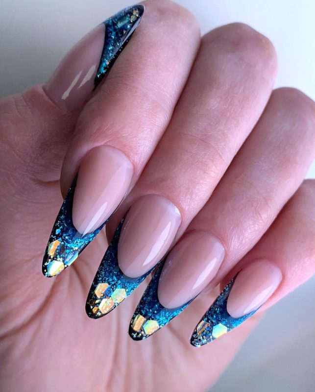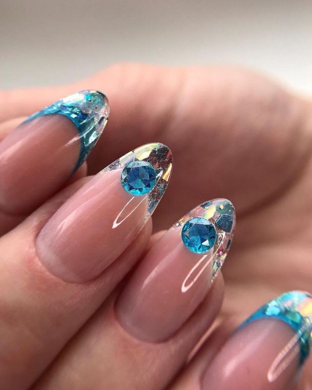 Аквариумный френч это довольно быстрый в реализации вид аквариумного маникюра. Он выглядит свежее классического, но не сильно броско. Отличный вариант для повседневности или на новогодний аквариум дизайн ногтей.