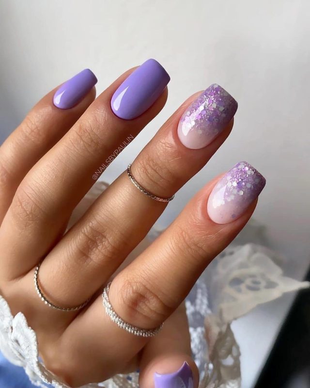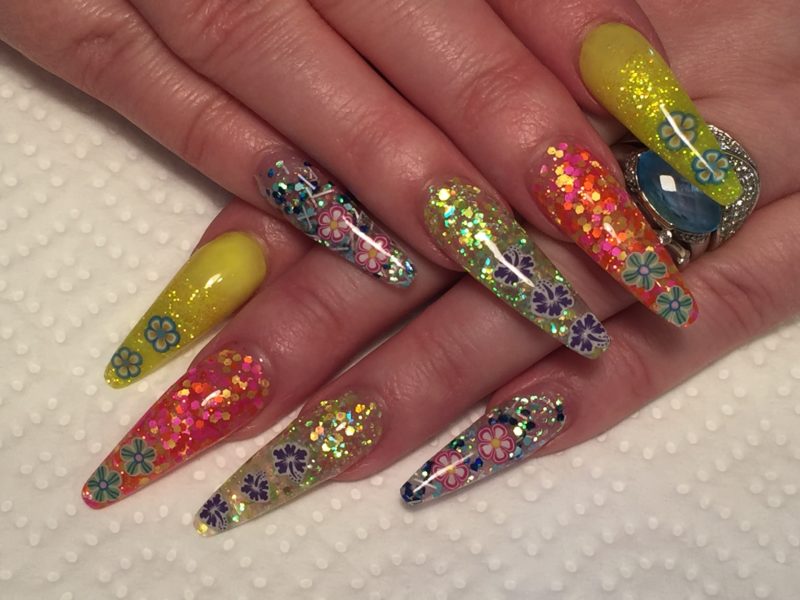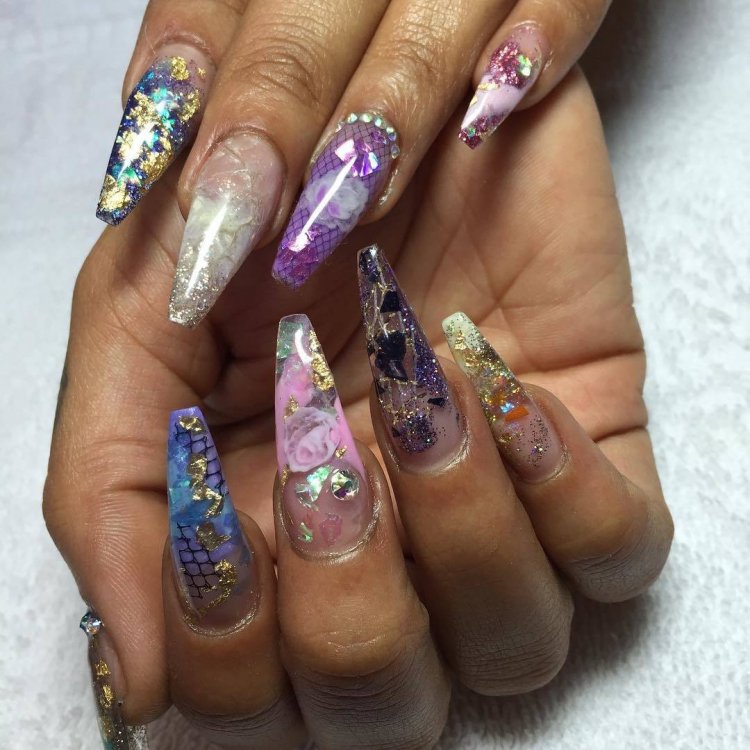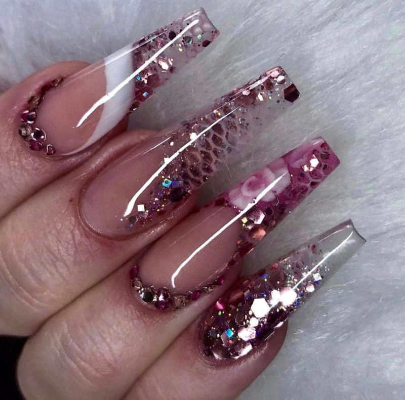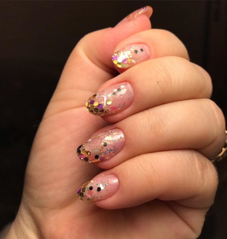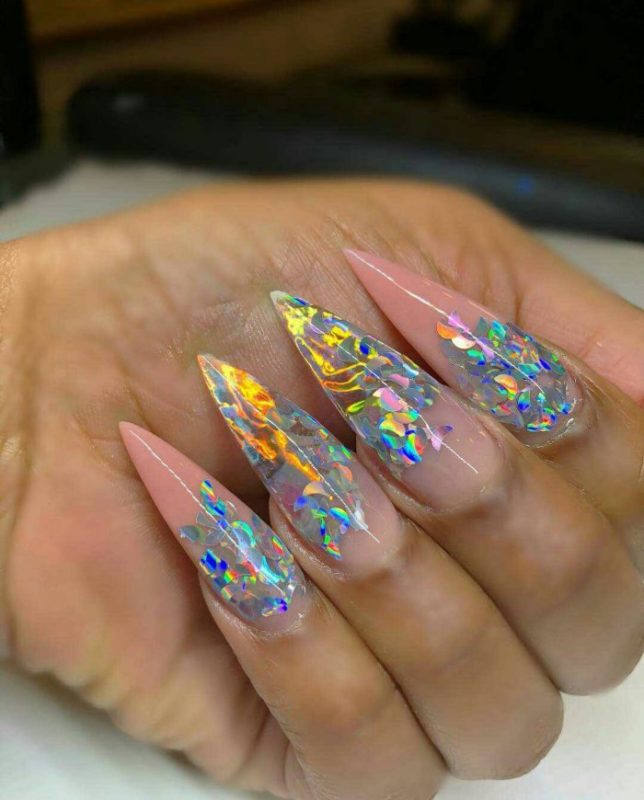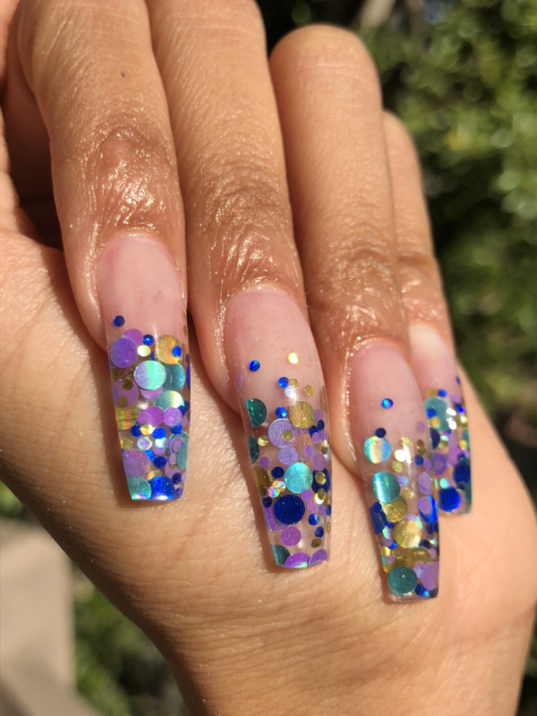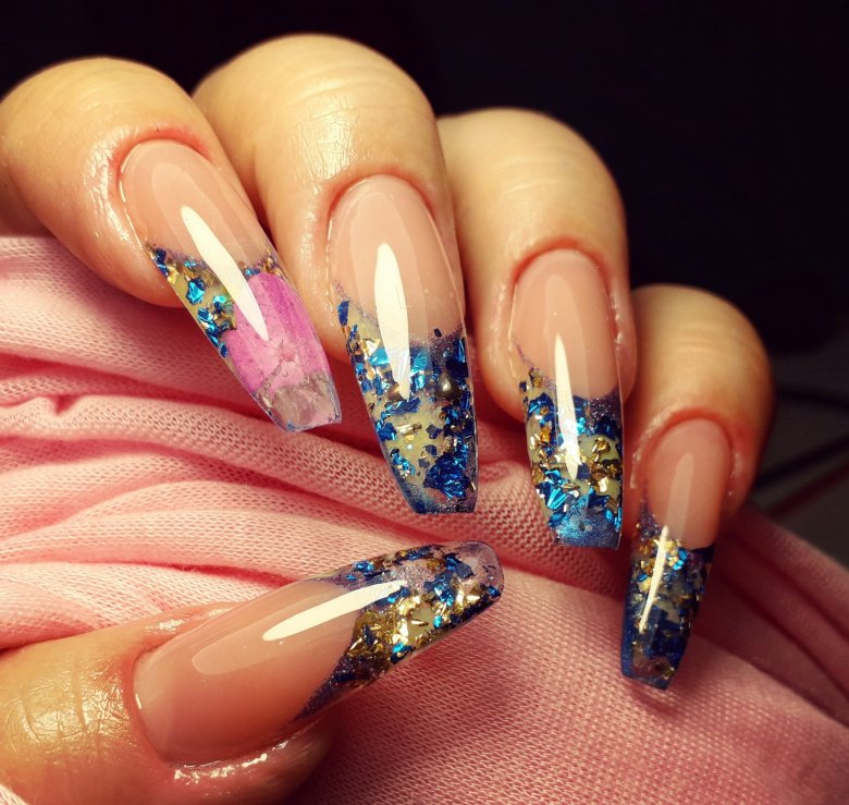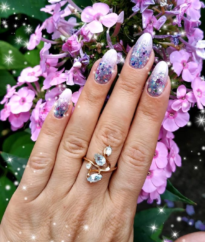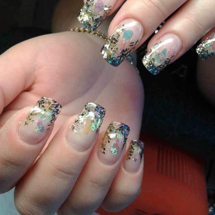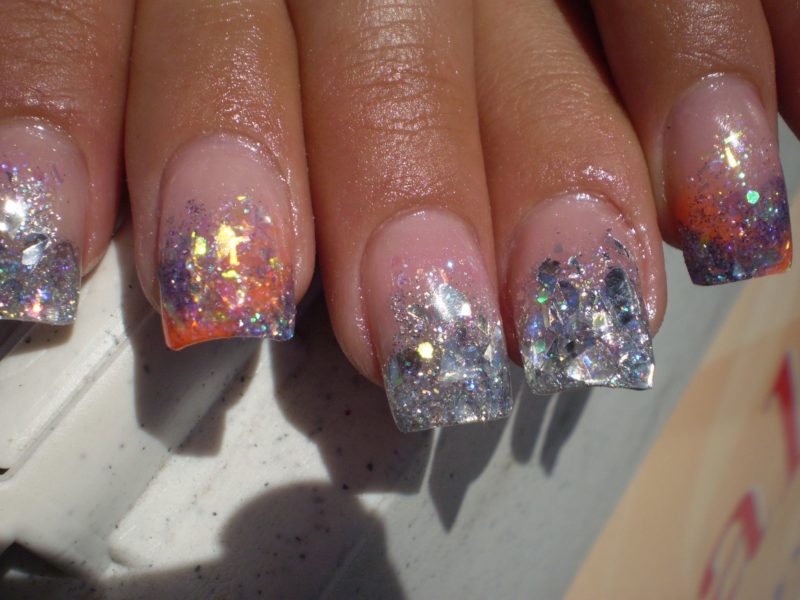 - послойное наложение блёсток разного размера, цвета и формы;