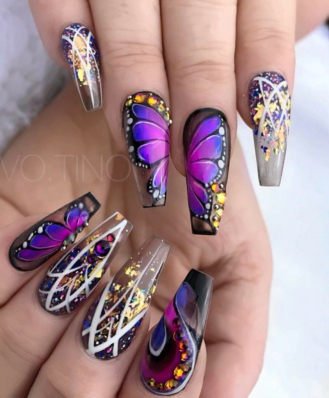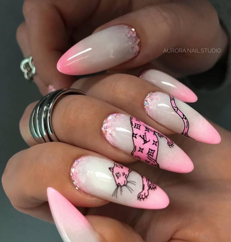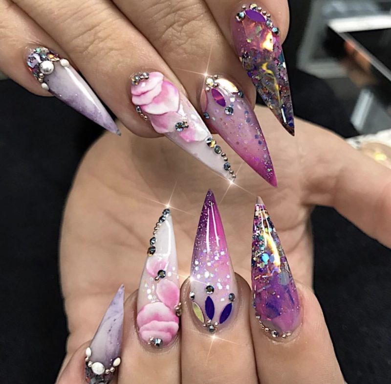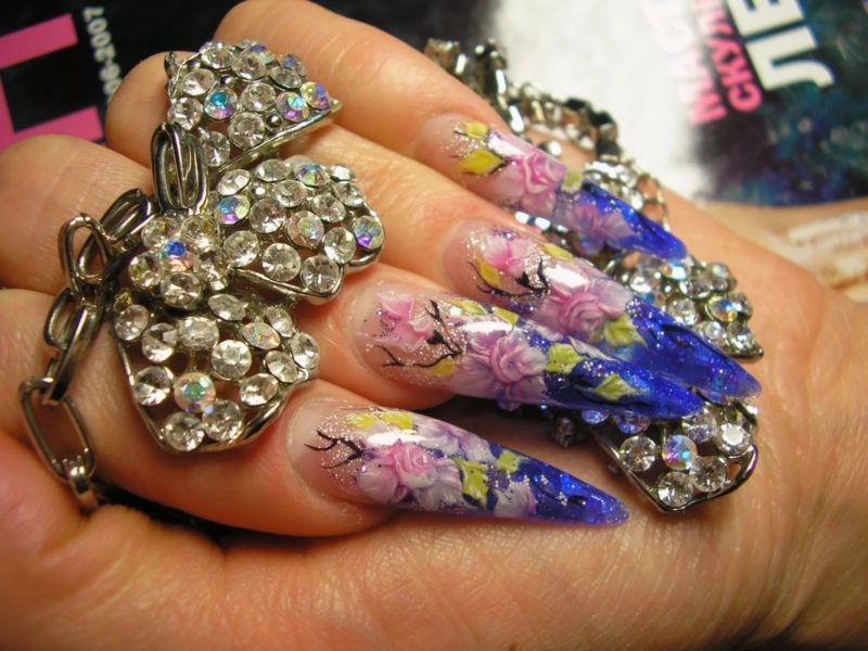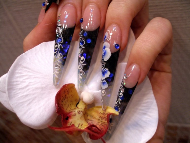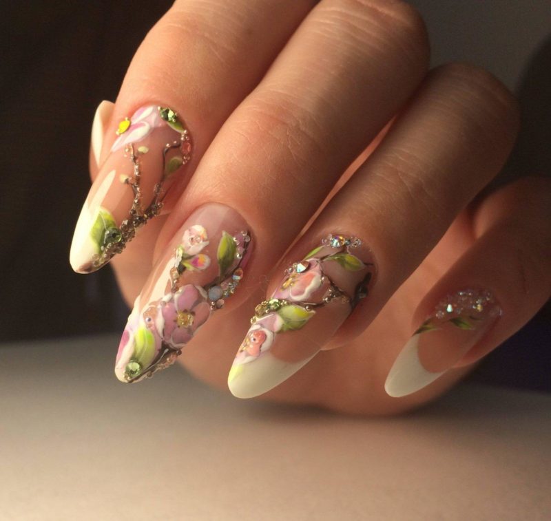 На длинных делать этот вид маникюра крайне удобно. Тут есть место поэкспериментировать с различными цветами, техниками, узорами и украшениями.