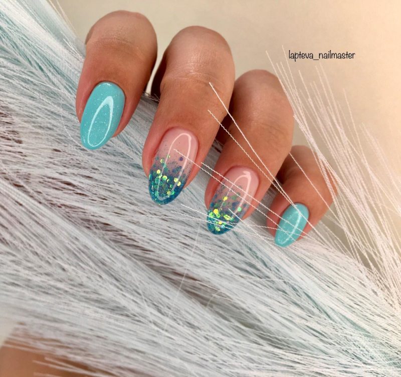 На миндалевидной форме хорошо смотрится лунный маникюр с аква-эффектом. С помощью тонких кисточек, иголок, палочек и декоративных песков создается необычный аквариумный дизайн на миндальных ноготках.