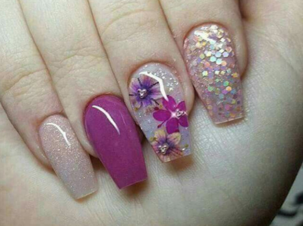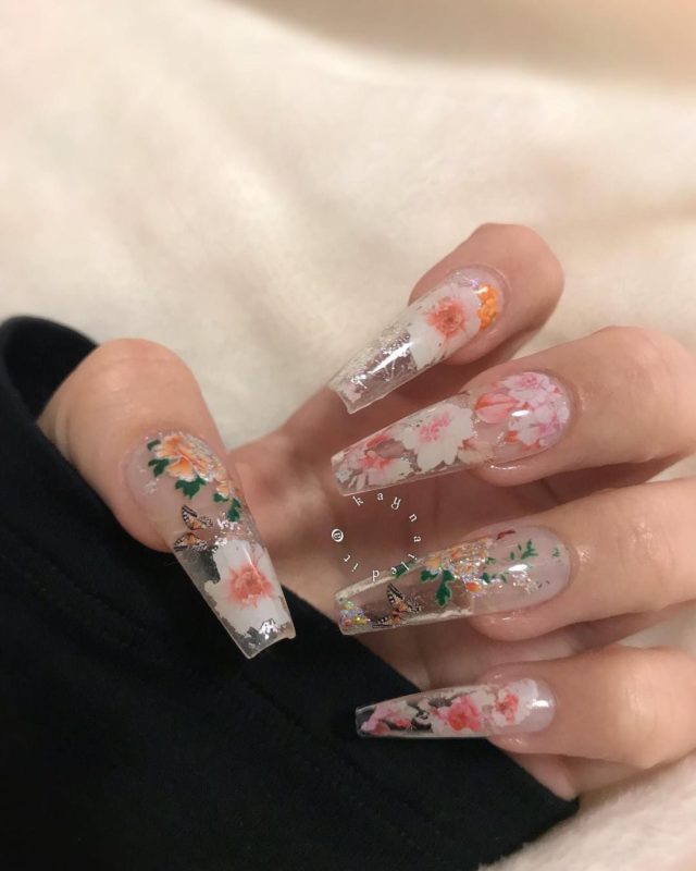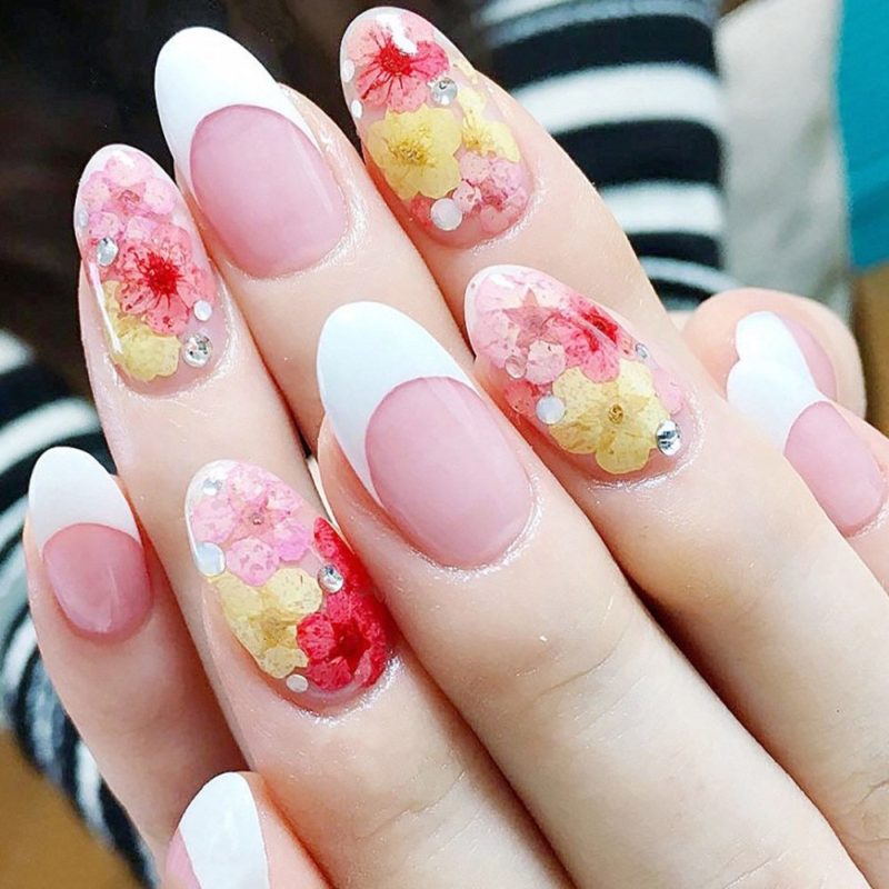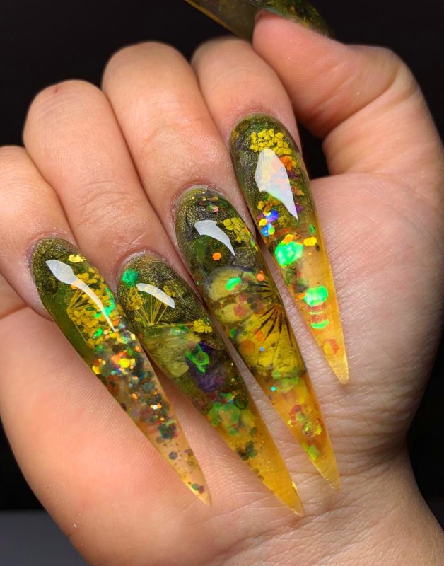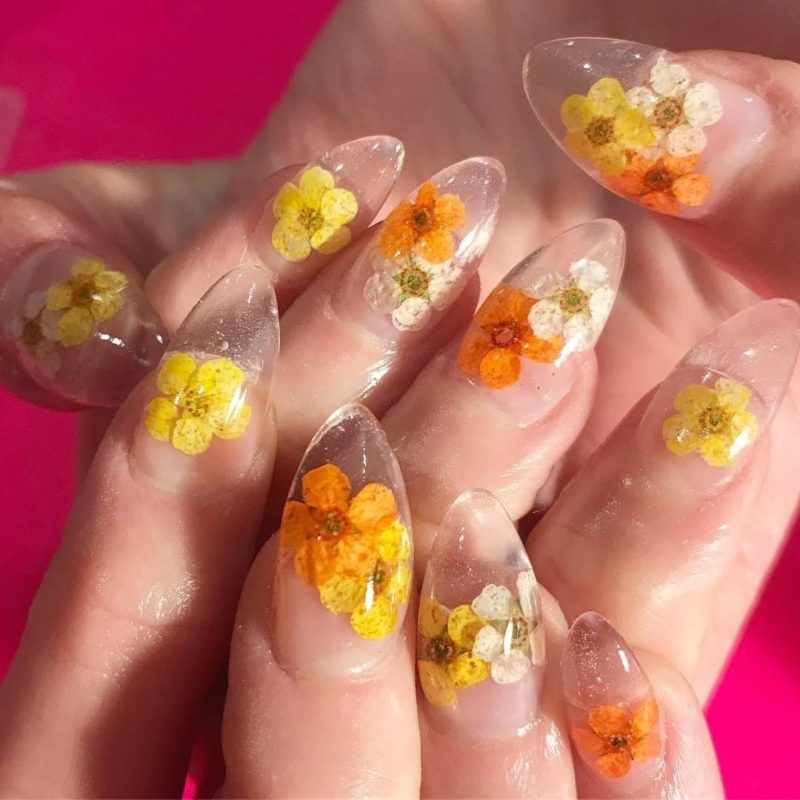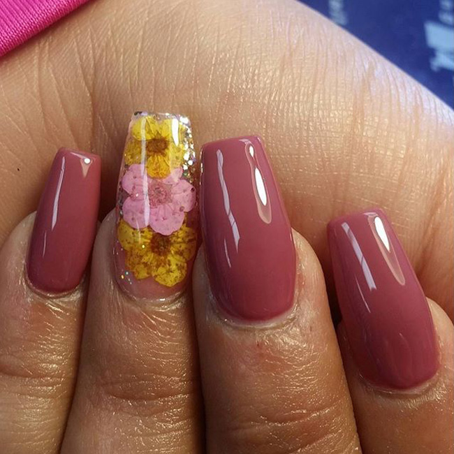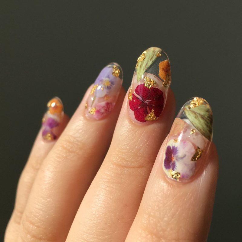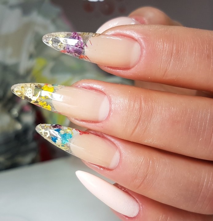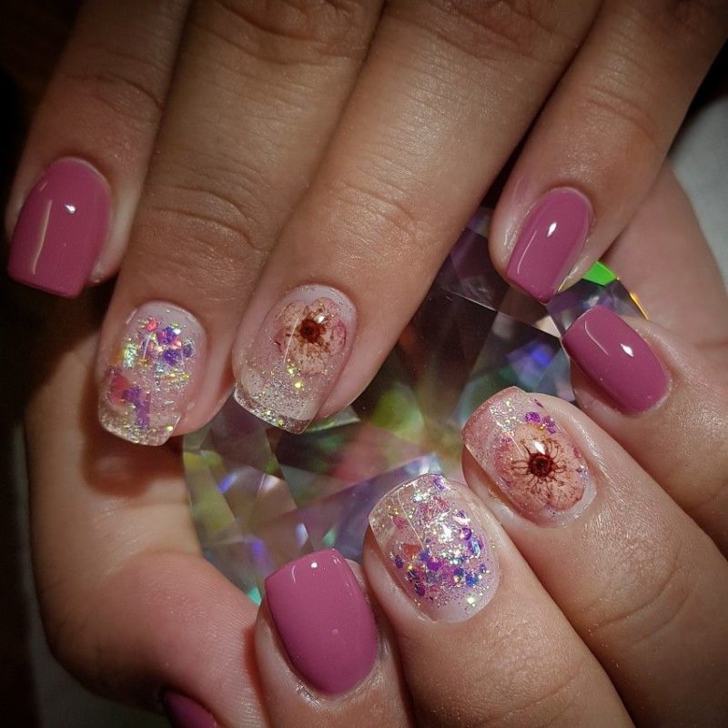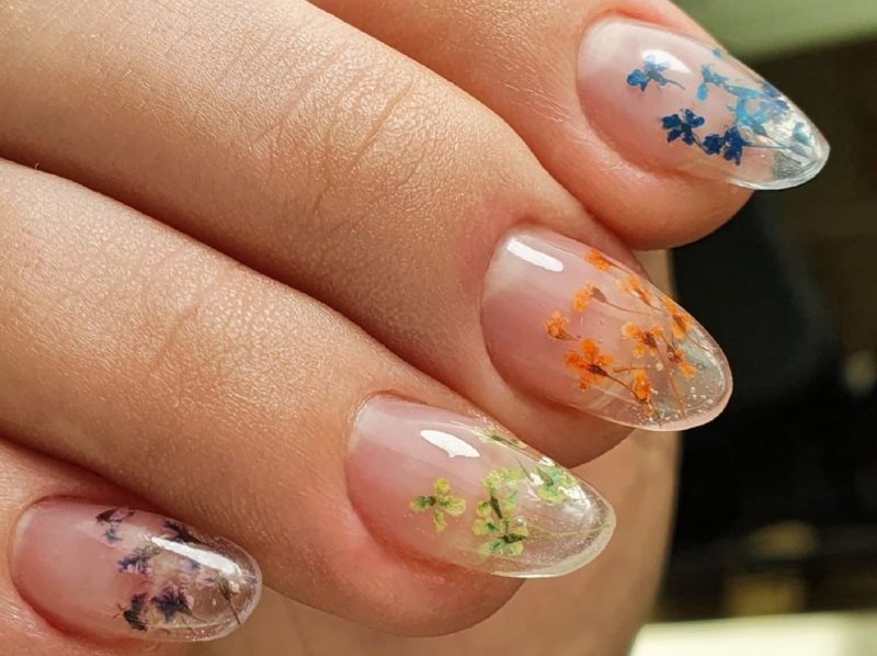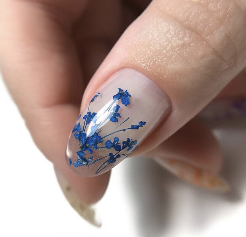 Сухоцветы и гербарий довольно новая ветвь в дизайне маникюра, а в сочетании с трёхмерным аквариумным эффектом получается очень интересный результат. Основу под такой маникюр принято делать прозрачной и нюдовой, дополнениями же служат блёстки или мелкий глиттер, также используют песок или другие рассыпчатые материалы.