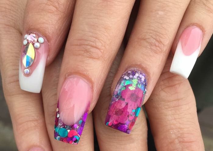 Акриловая пудра неплохо сочетается с другими ногтевыми украшениями, но не стоит перебарщивать.