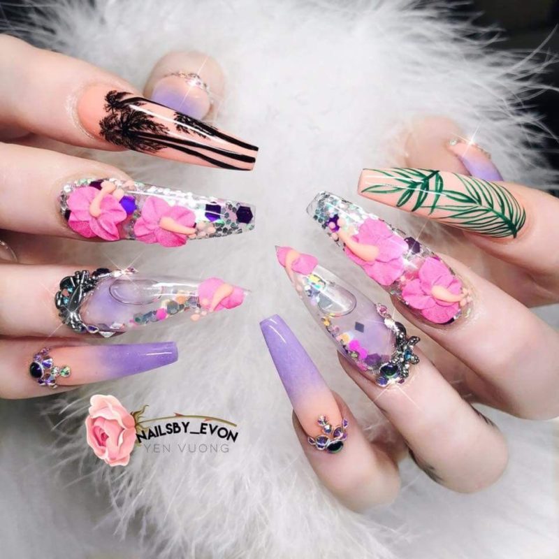 Техникой аквариумного маникюра воплощаются в жизнь самые смелые дизайны. От классического французского маникюра до неординарных объёмных фигурок по всей пластине ноготка.