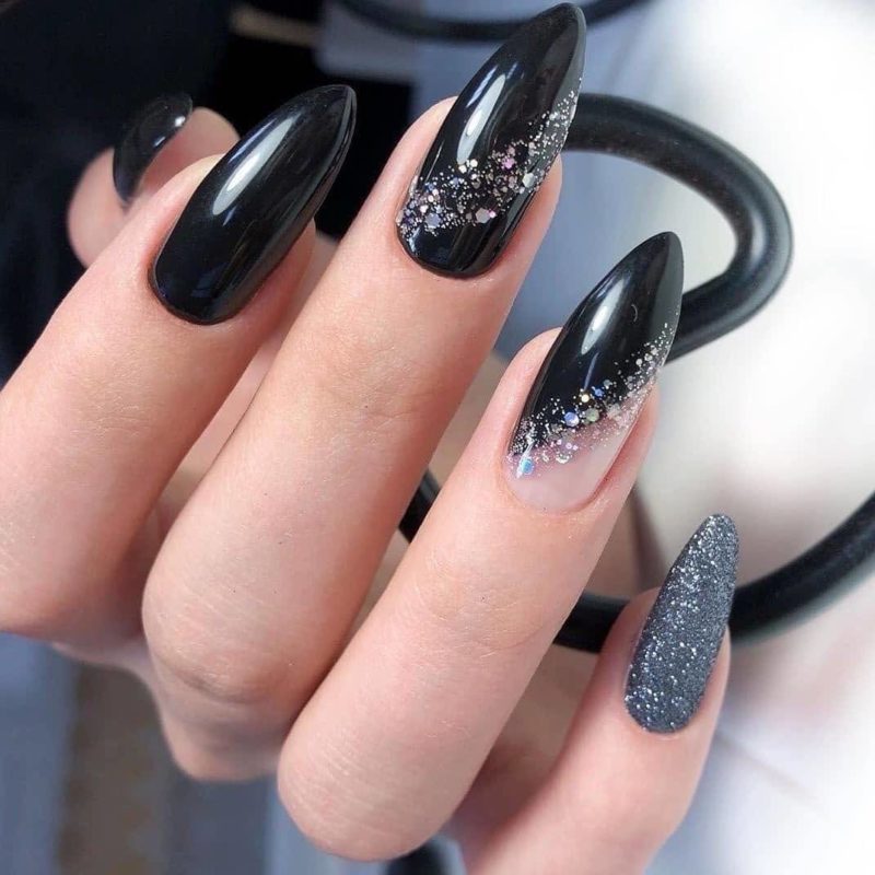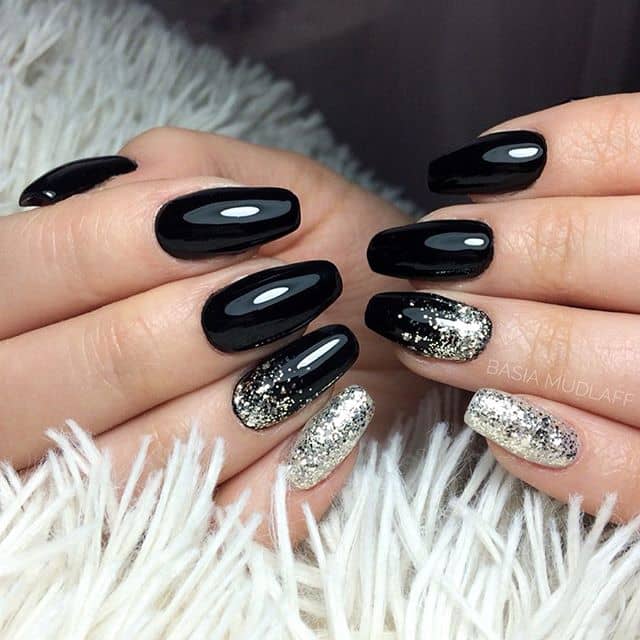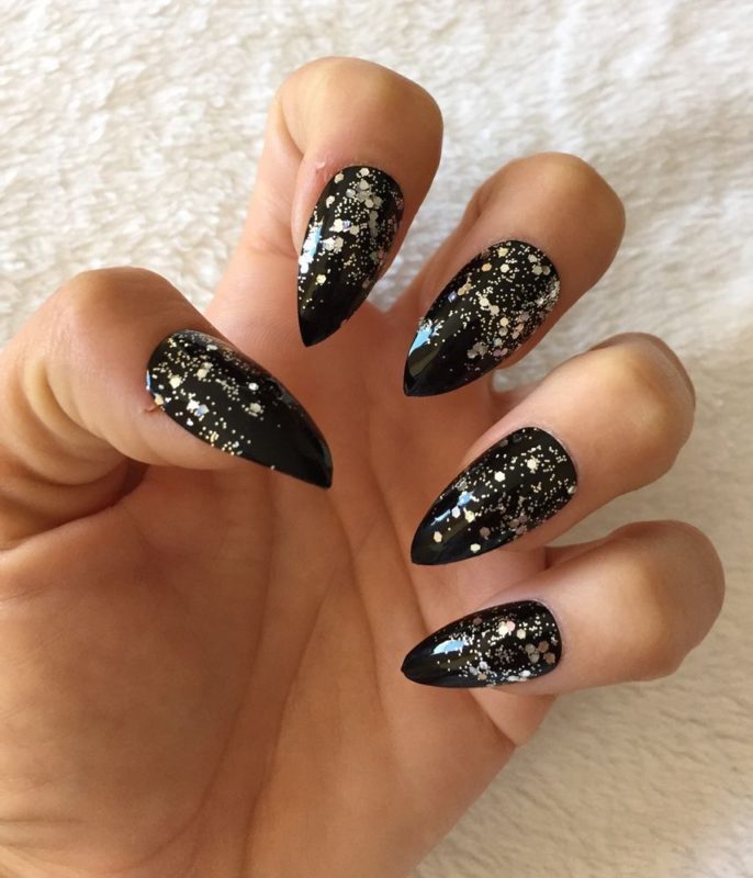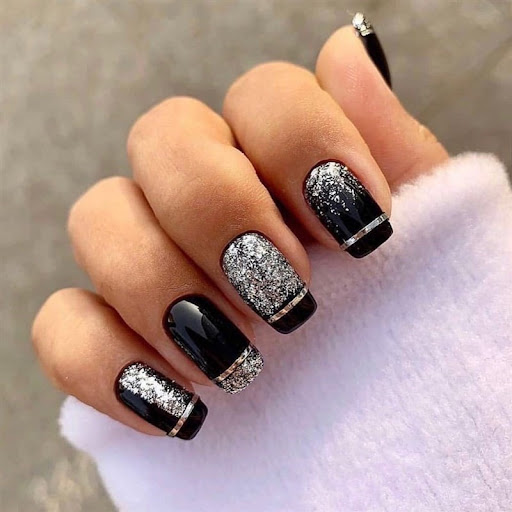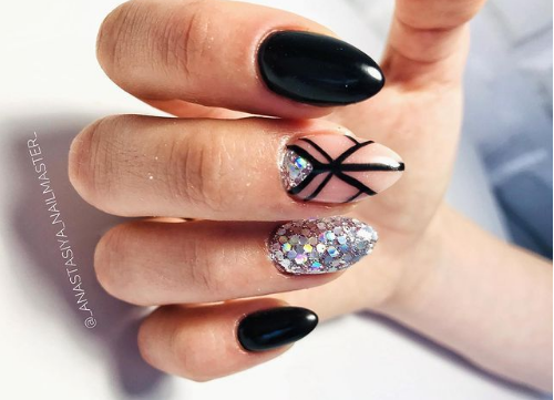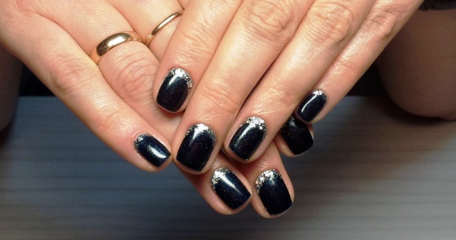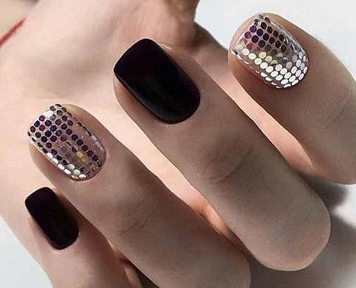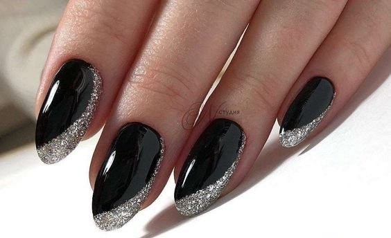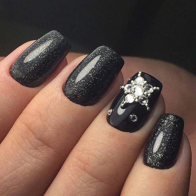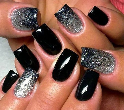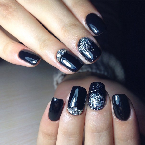 Если черный лак украсить серебристыми блестками маникюр получится более ярким и заметным. На темном лаке блестки смотрятся красивее, чем с любыми другими цветами. Черный цвет усиливает блеск и создает хорошее фоновое покрытие для украшения блестками.