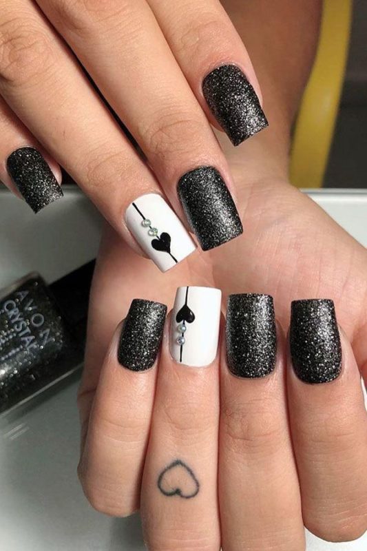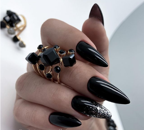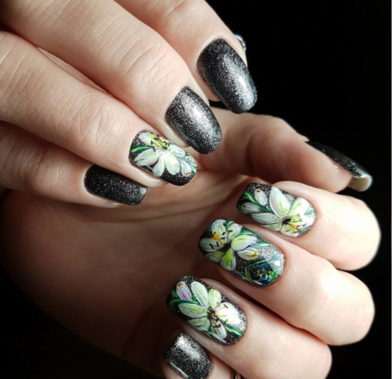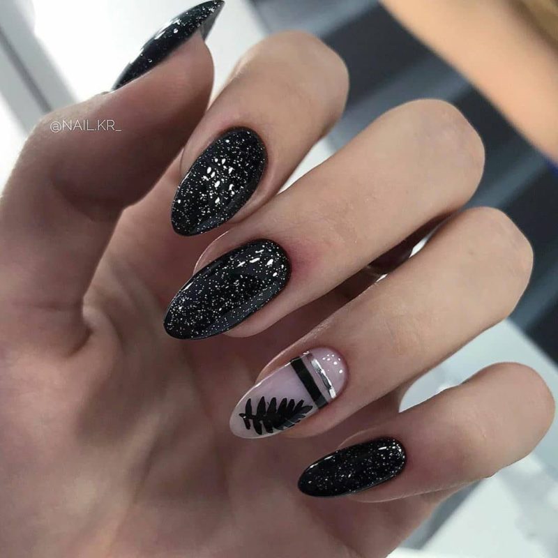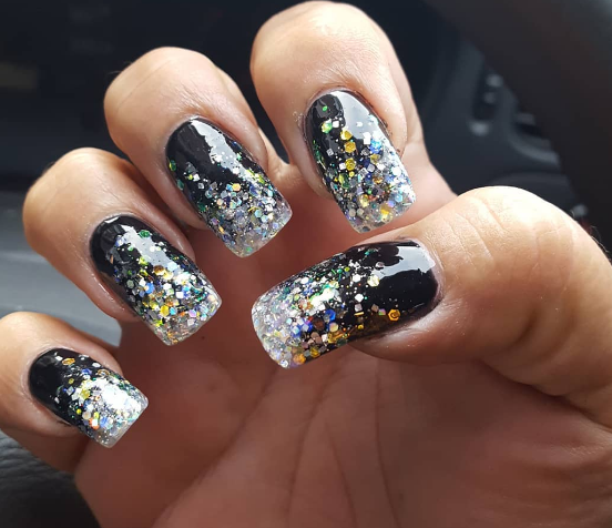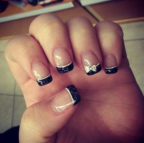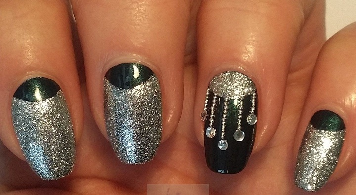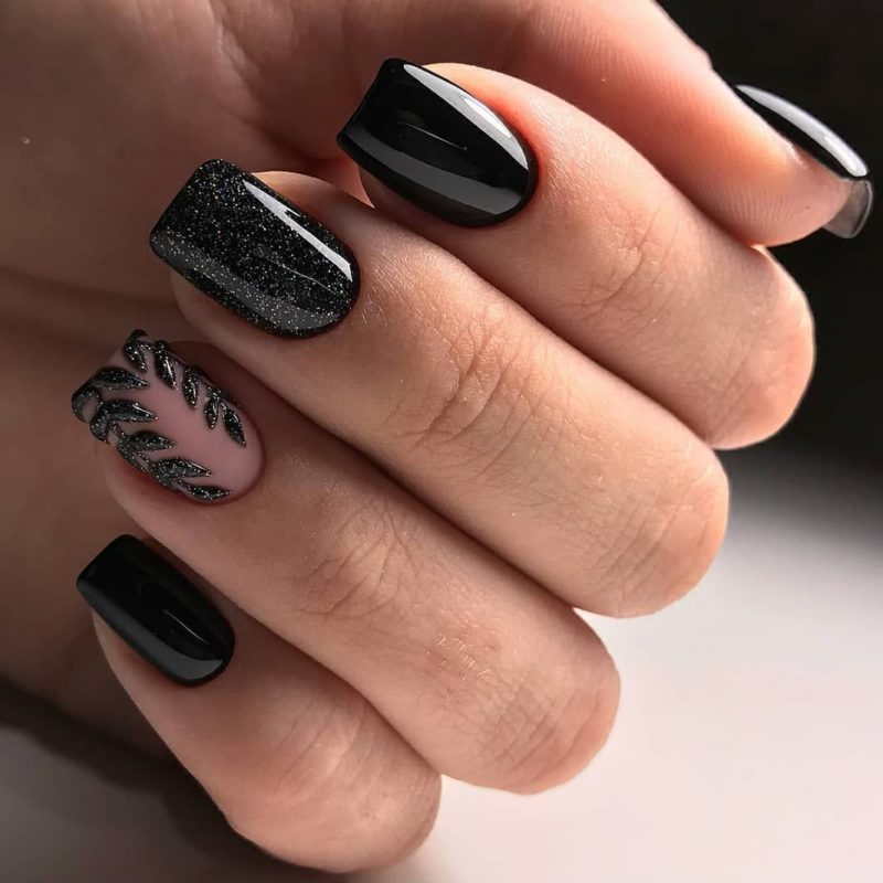 Если черный лак украсить серебристыми блестками маникюр получится более ярким и заметным. На темном лаке блестки смотрятся красивее, чем с любыми другими цветами. Черный цвет усиливает блеск и создает хорошее фоновое покрытие для украшения блестками.