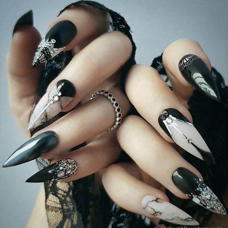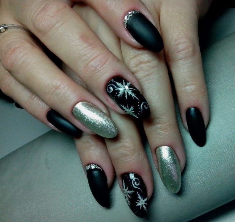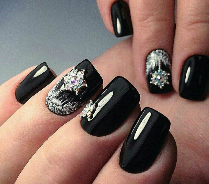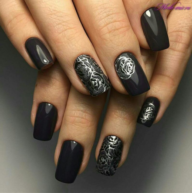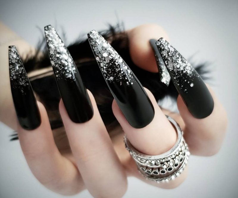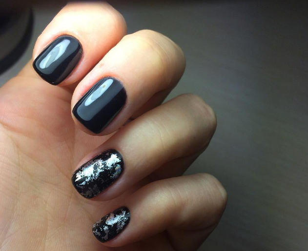 Черный лак на длинных ногтях выглядит мрачно, поэтому преобладающим цветом должен быть серебристый. Серебро на черном фоне можно позволить себе на особое мероприятие. Однако это дело вкуса и личных предпочтений.