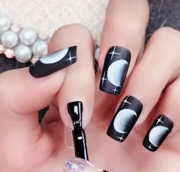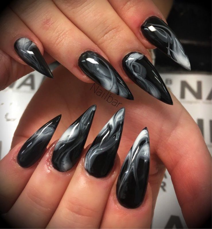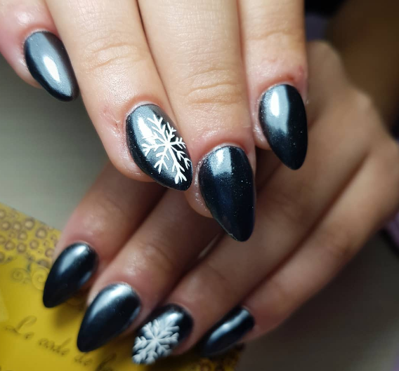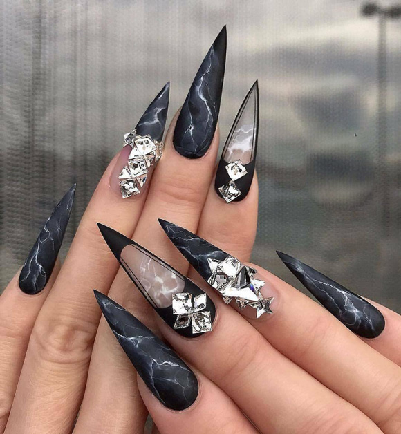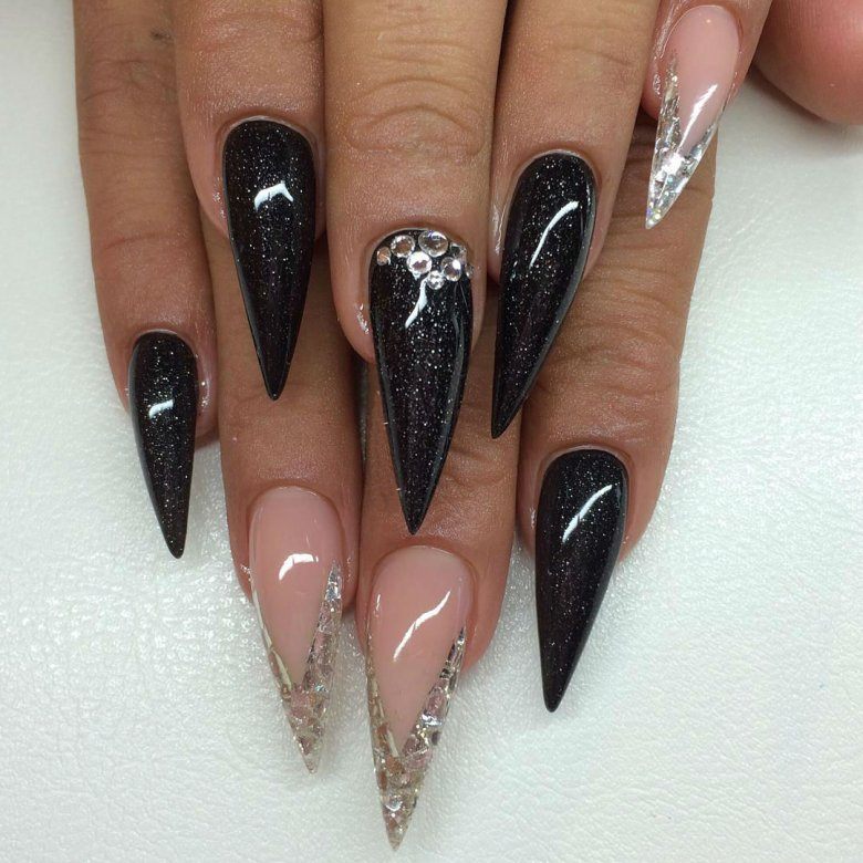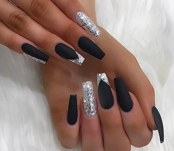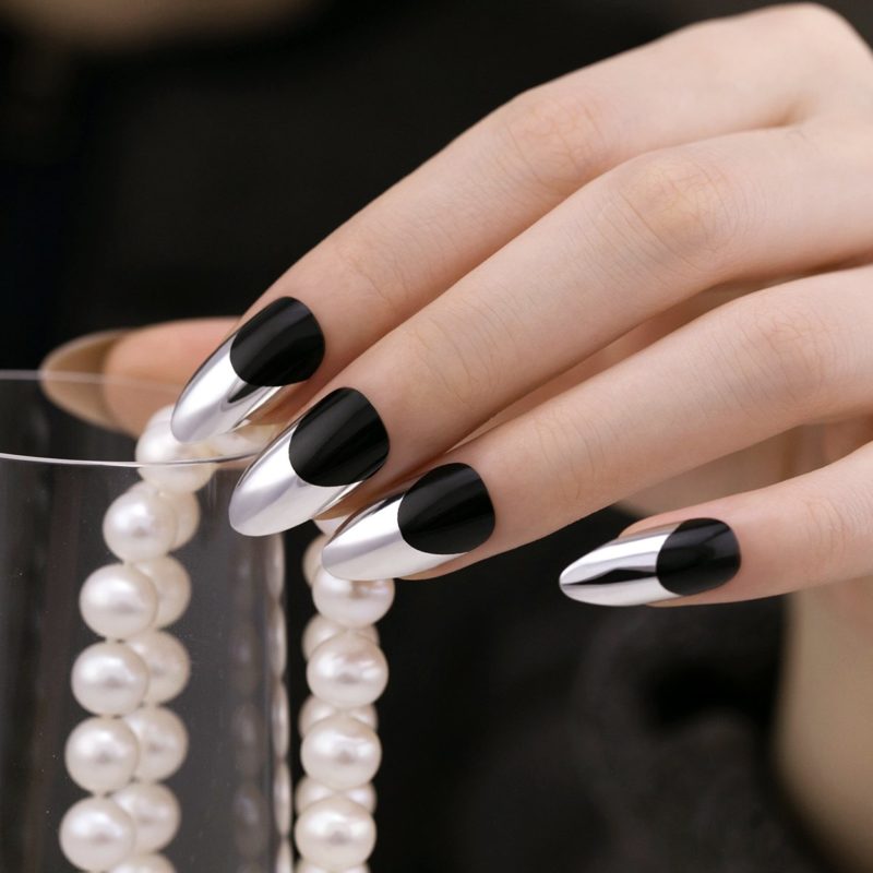 Черный лак на длинных ногтях выглядит мрачно, поэтому преобладающим цветом должен быть серебристый. Серебро на черном фоне можно позволить себе на особое мероприятие. Однако это дело вкуса и личных предпочтений.
