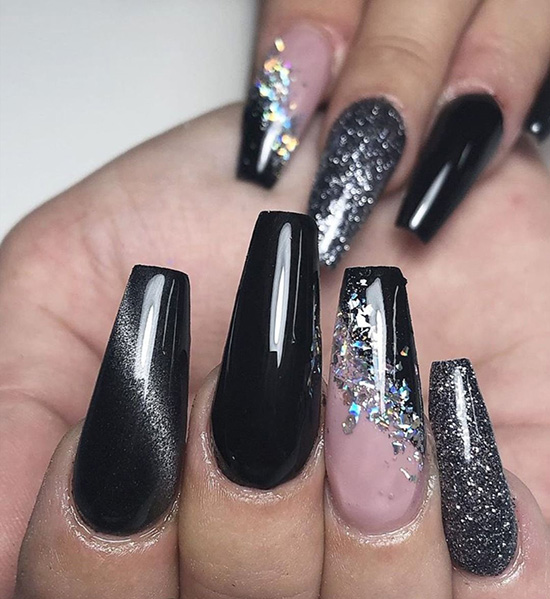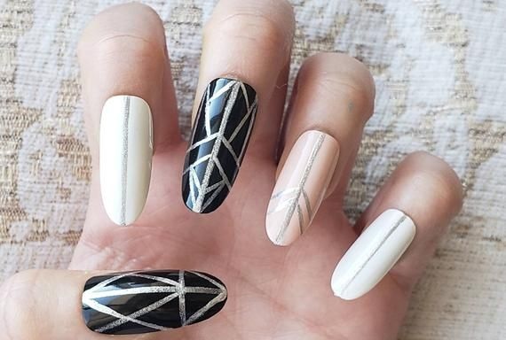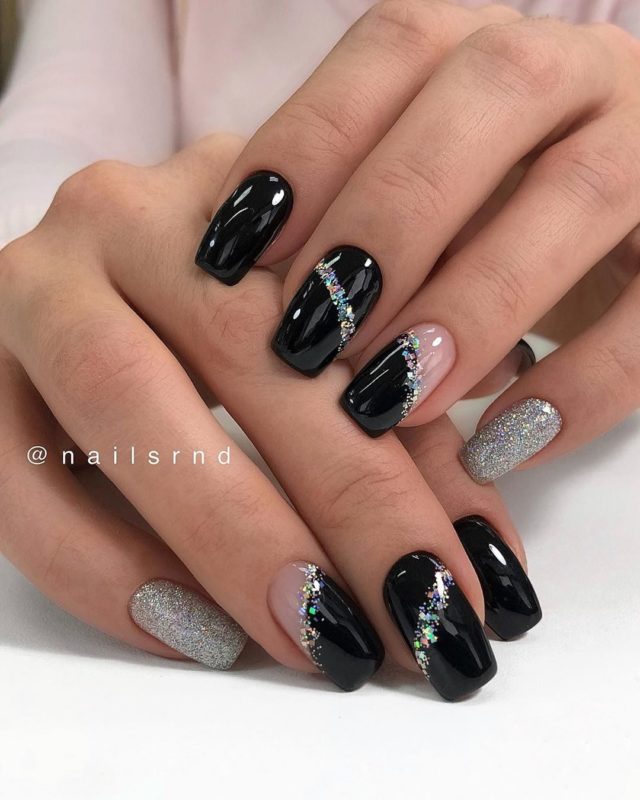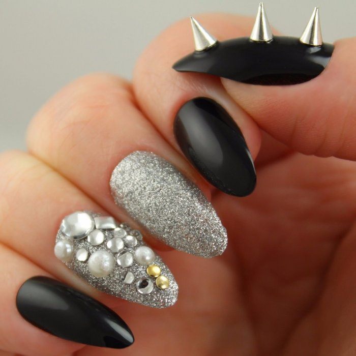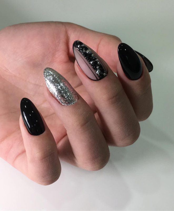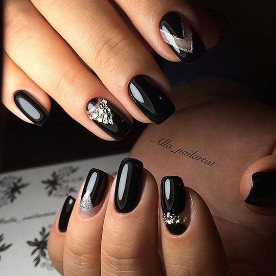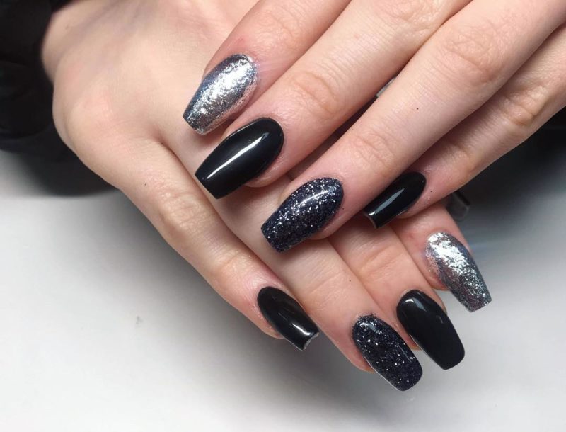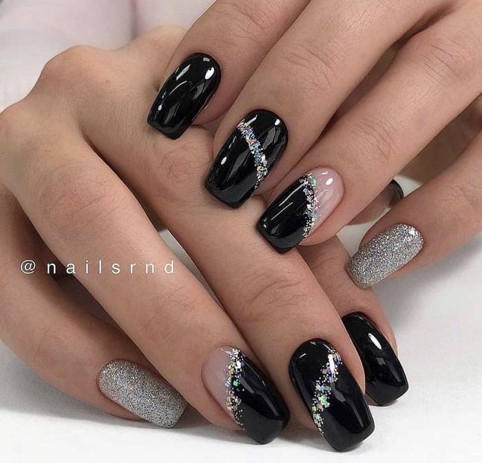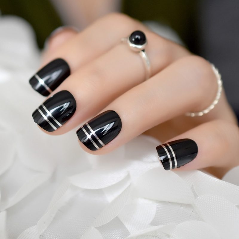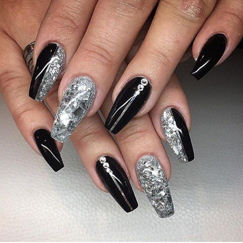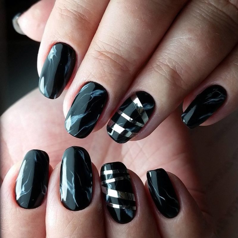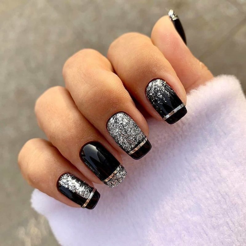 Черный дизайн ногтей с серебром на разную длину ногтей