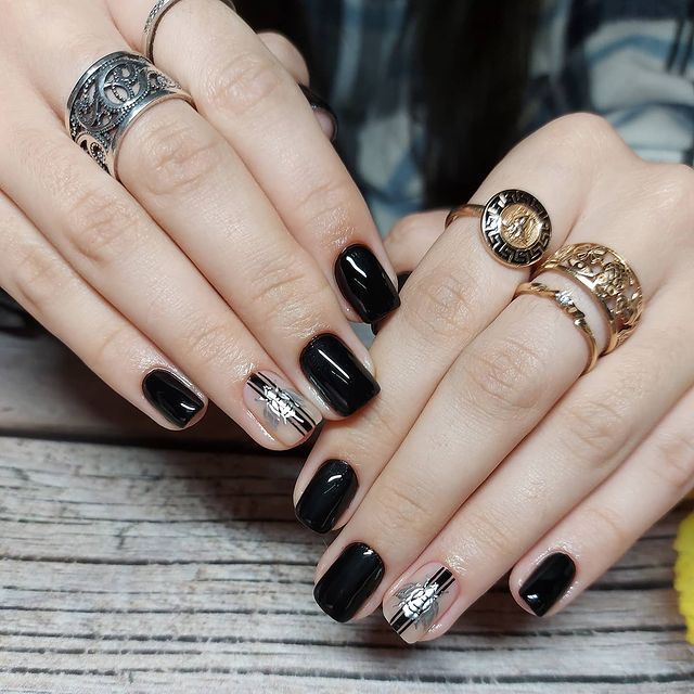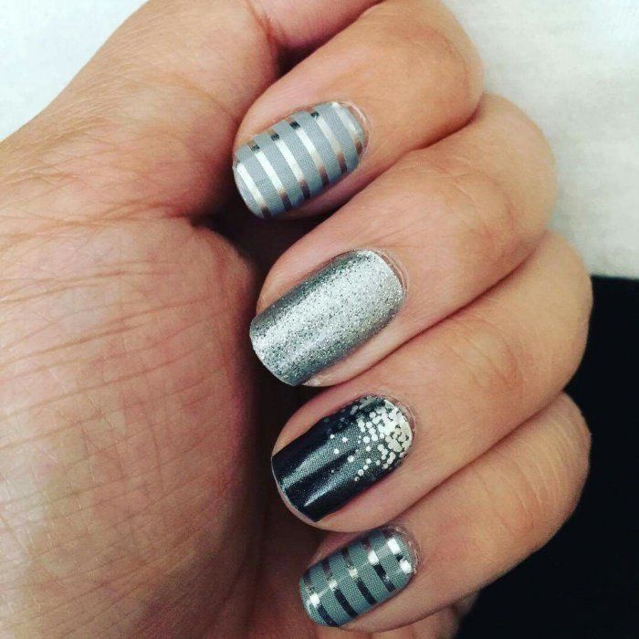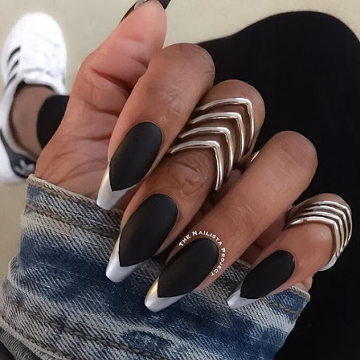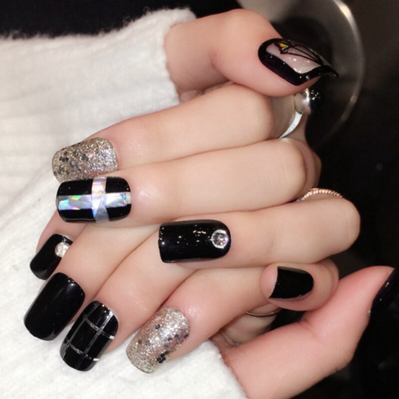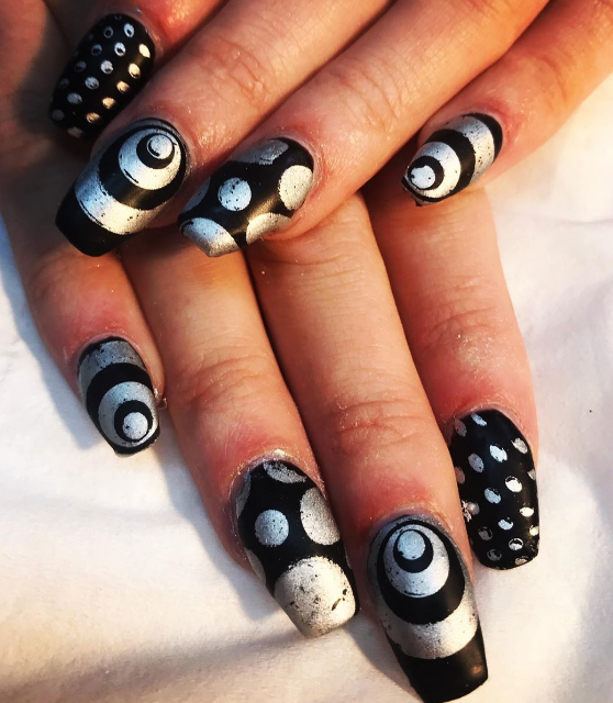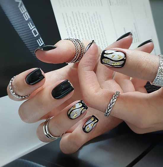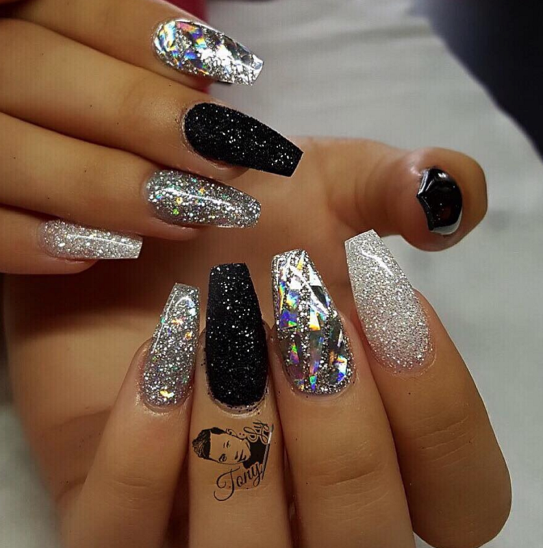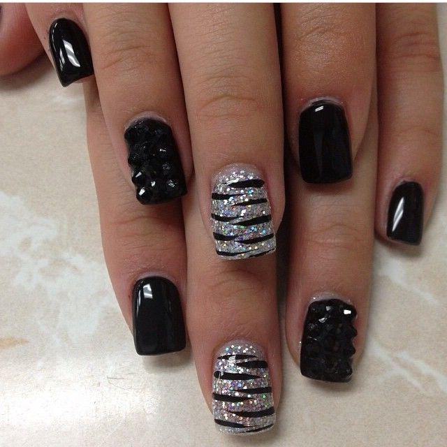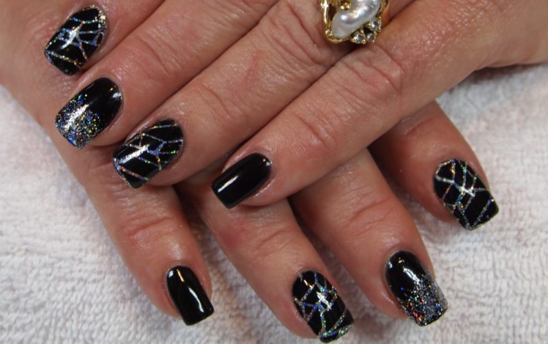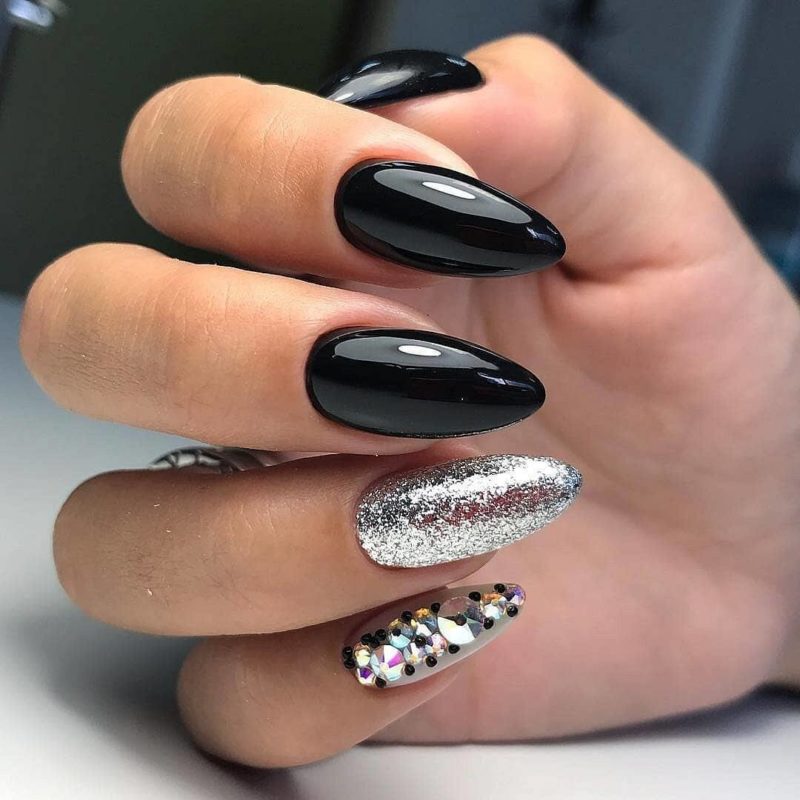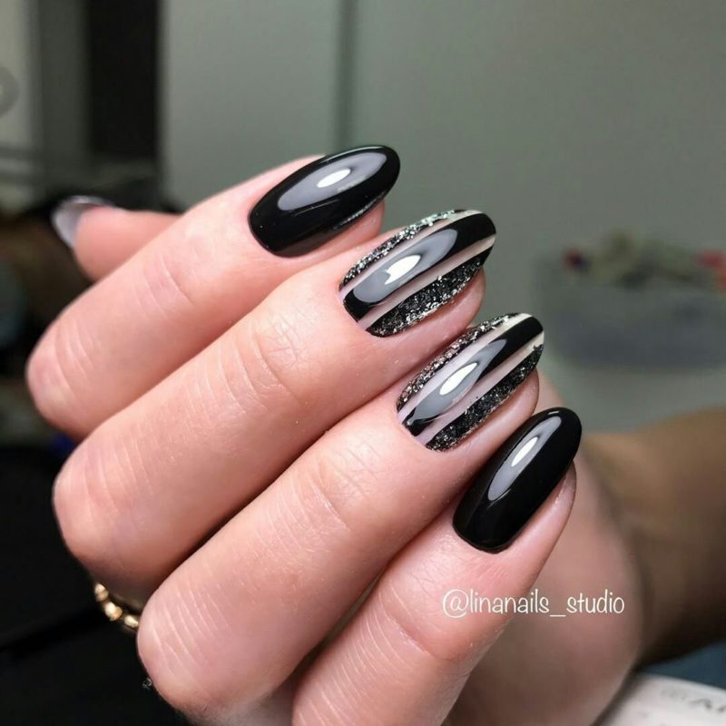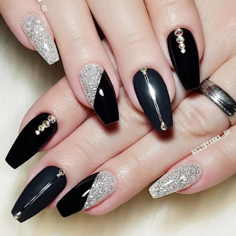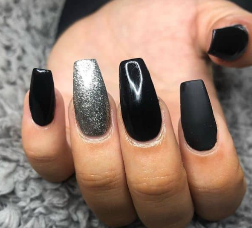 Черный дизайн ногтей с серебром на разную длину ногтей