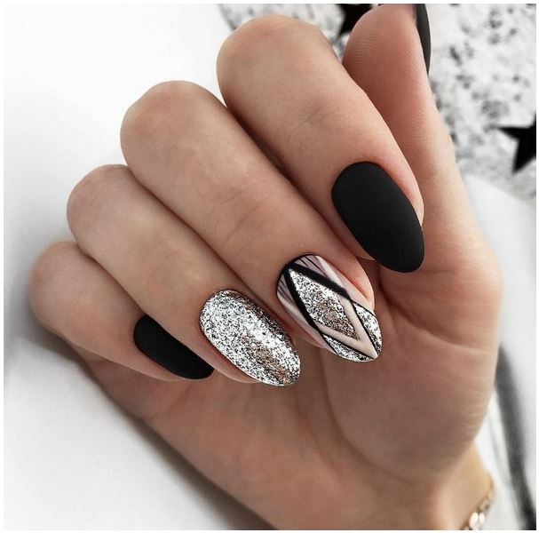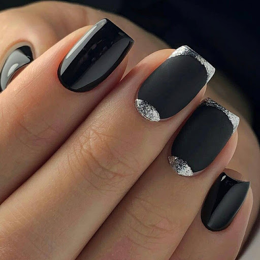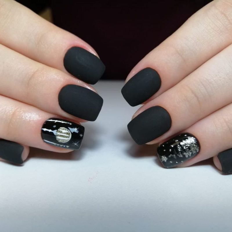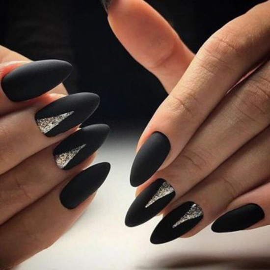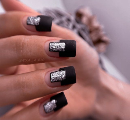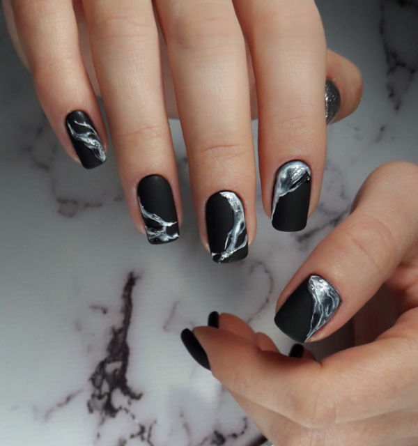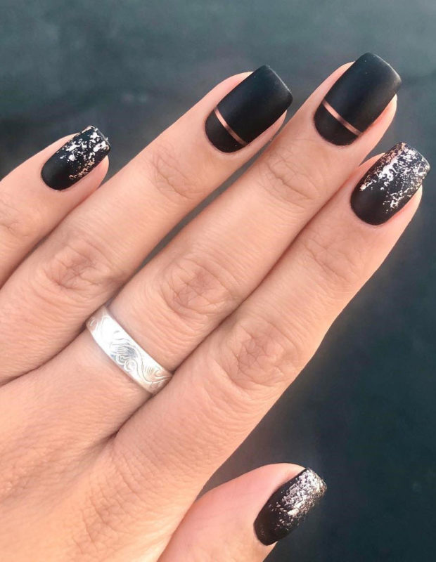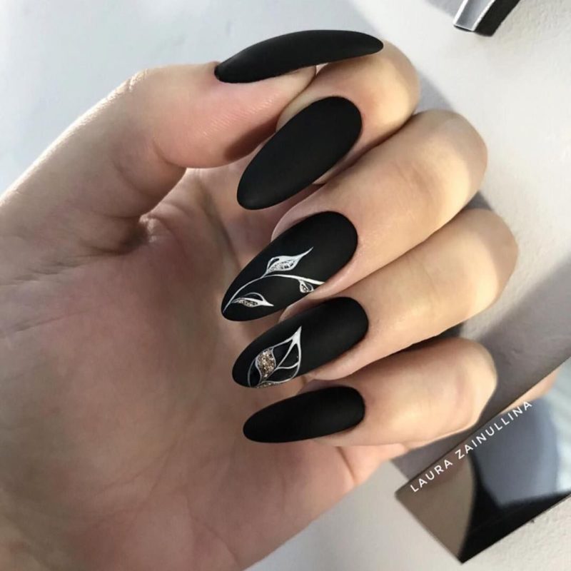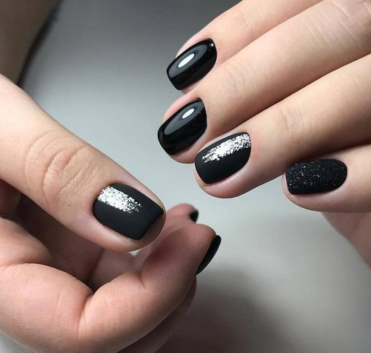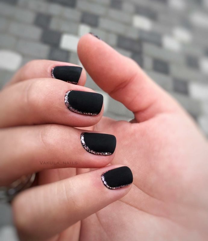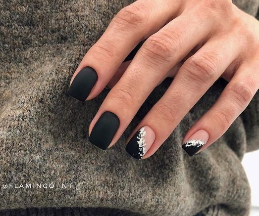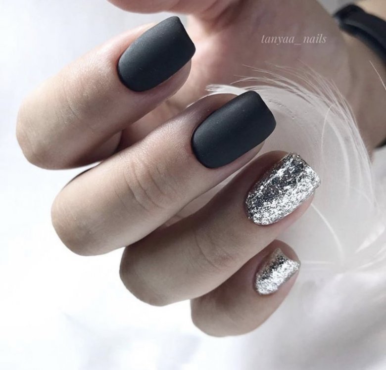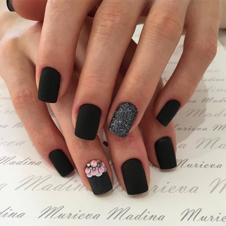 Матовый эффект разнообразит классическое глянцевое черное покрытие. Красивые серебристые элементы в маникюре добавят яркости ногтям. Матовое черное покрытие довольно сдержанное, поэтому маникюр часто дополняют блестками и стразами. Часто этот дизайн сочетают с бархатным эффектом на нескольких ноготках.