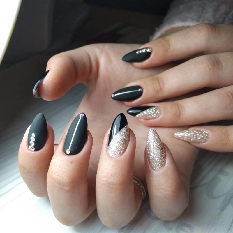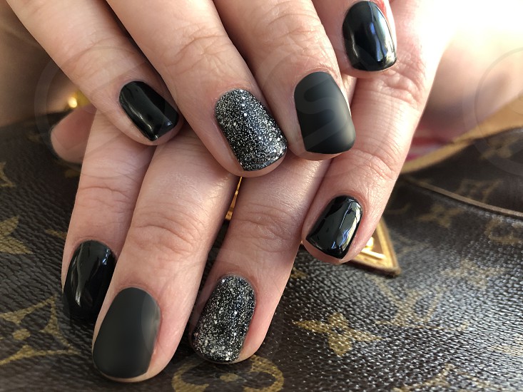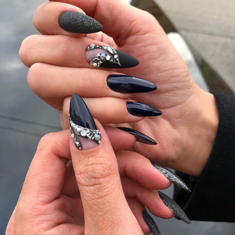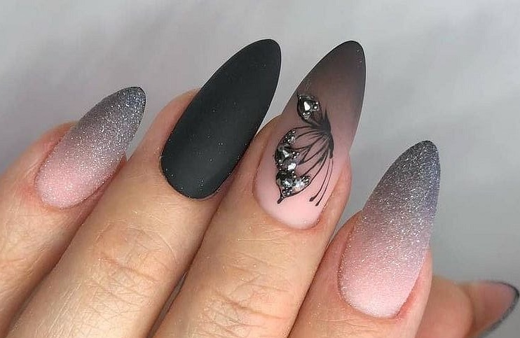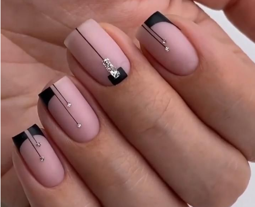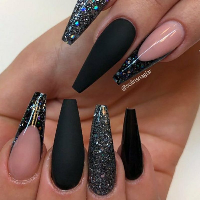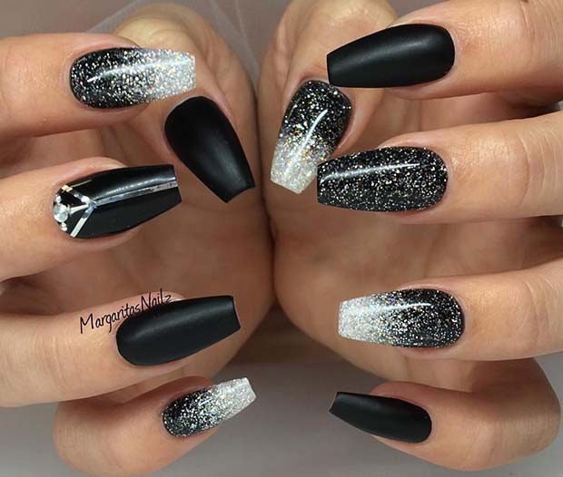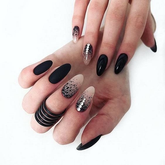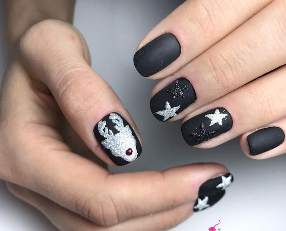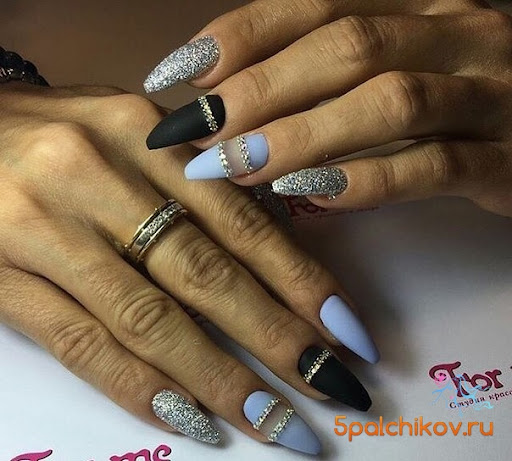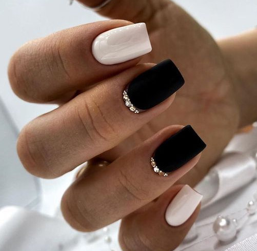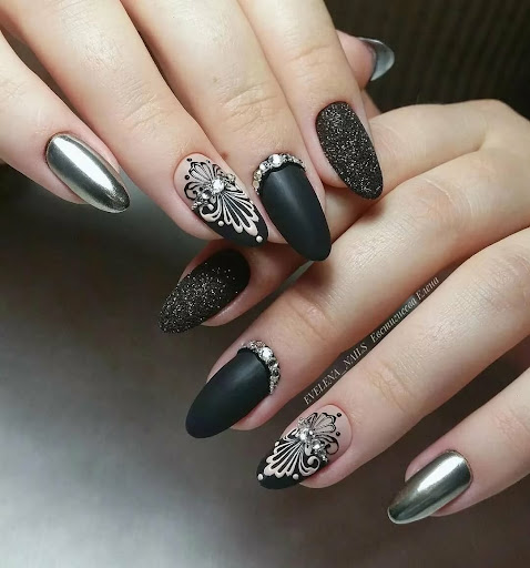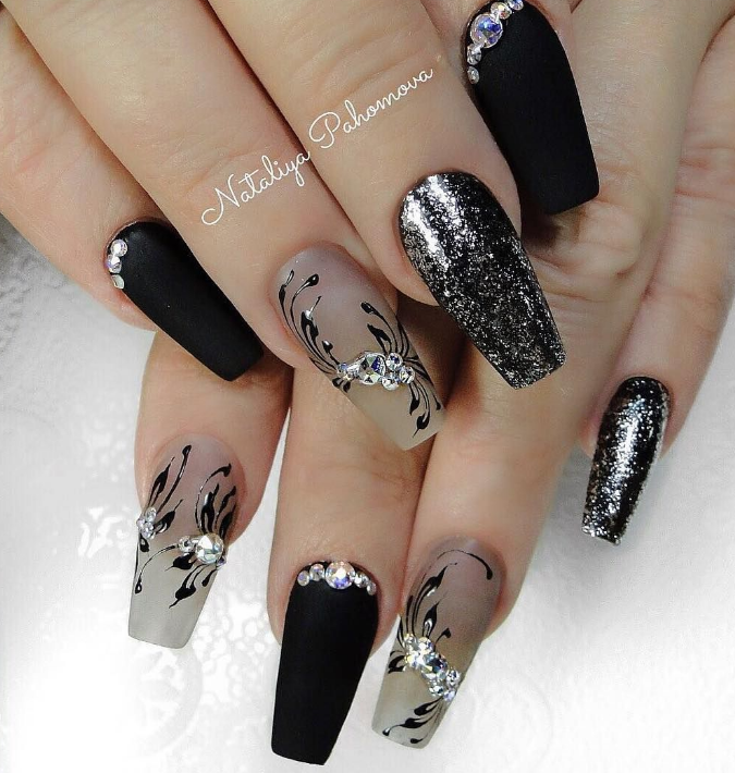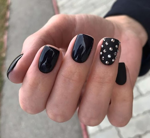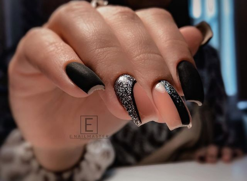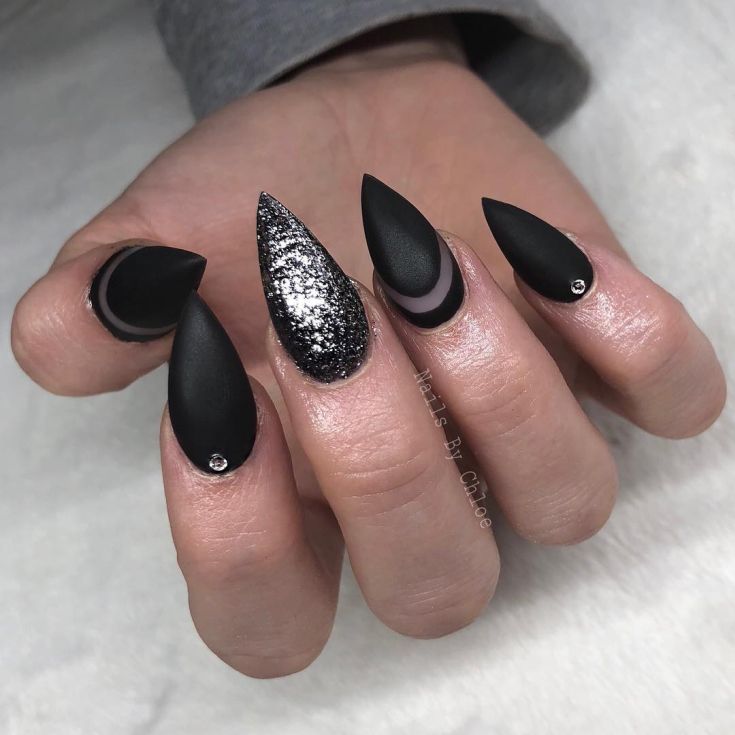 Матовый эффект разнообразит классическое глянцевое черное покрытие. Красивые серебристые элементы в маникюре добавят яркости ногтям. Матовое черное покрытие довольно сдержанное, поэтому маникюр часто дополняют блестками и стразами. Часто этот дизайн сочетают с бархатным эффектом на нескольких ноготках.
