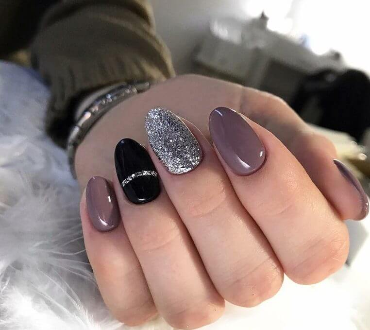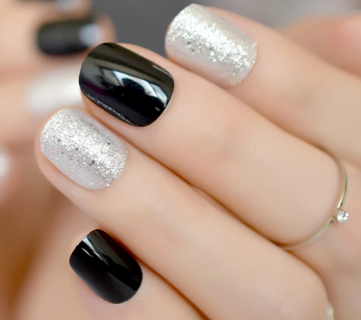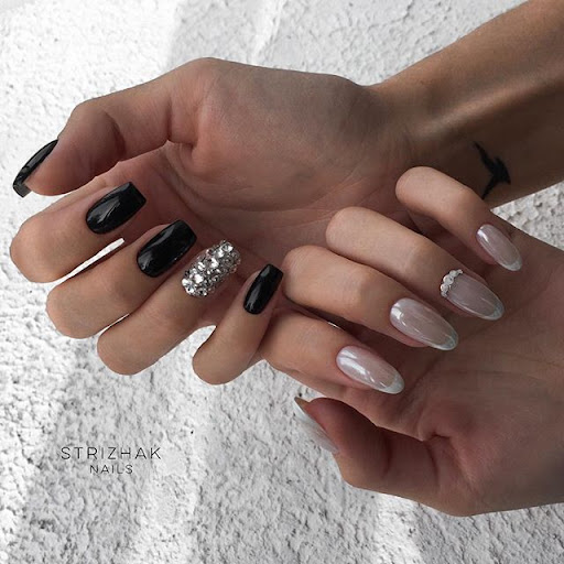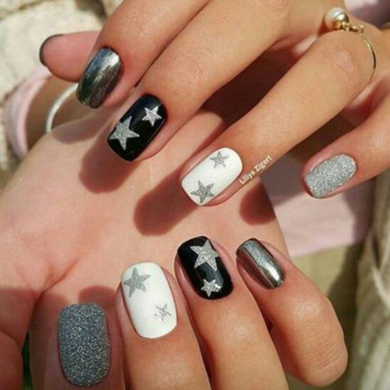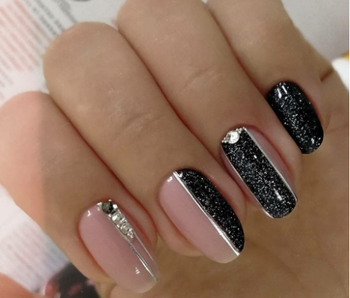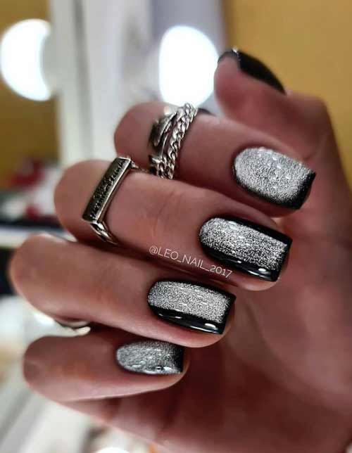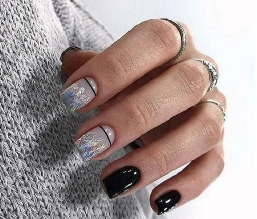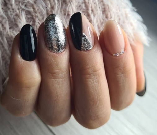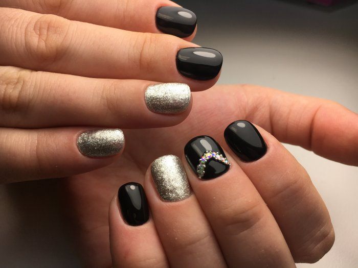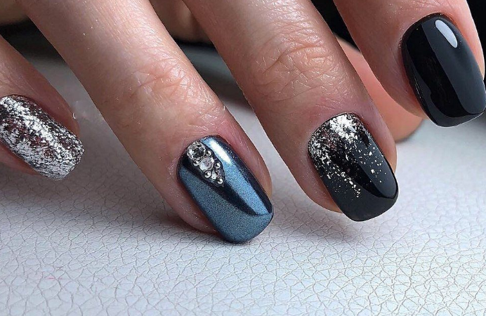 Некоторые девушки часто не могут выбрать один цвет покрытия, мастеру приходится искать компромисс. Отличным решением для такой незадачи станет дизайн «разные руки», где на одной руке будет нанесено черное покрытие, а на другой — серебристое. Такой стиль можно комбинировать с другими дизайнами, например, добавив немного серебристых блесток или страз.