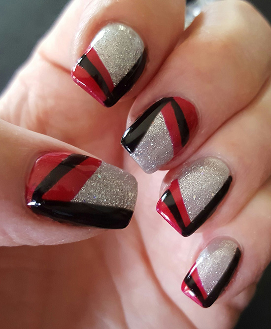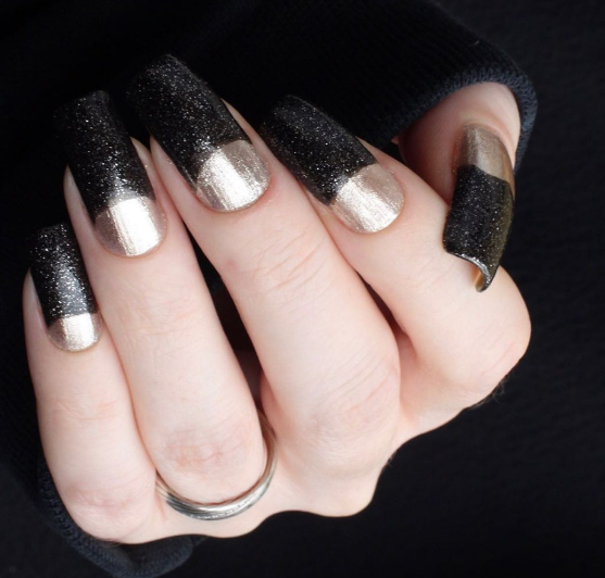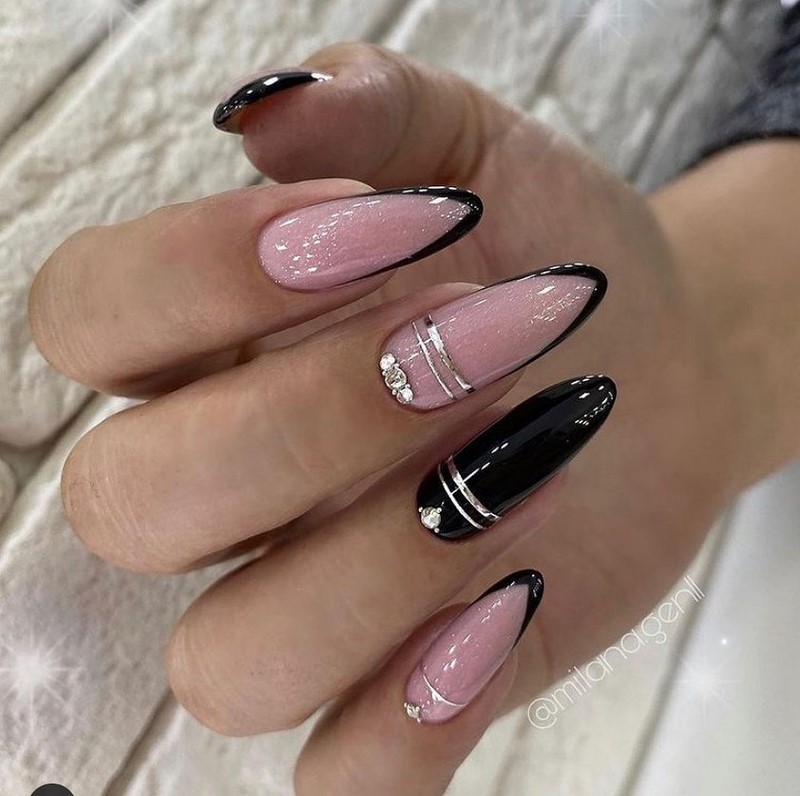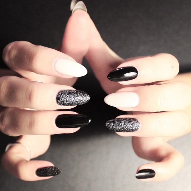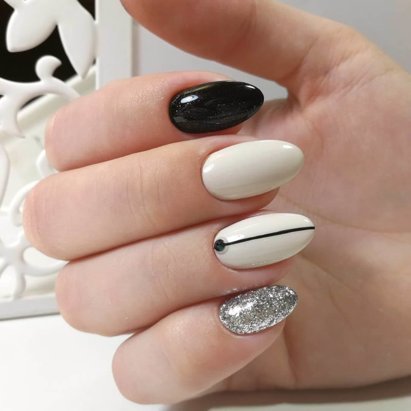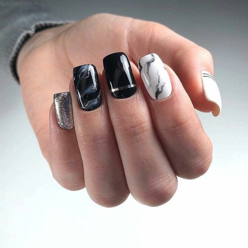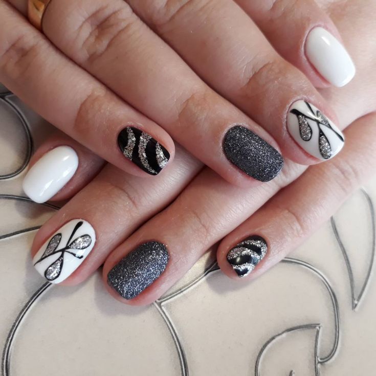 Некоторые девушки часто не могут выбрать один цвет покрытия, мастеру приходится искать компромисс. Отличным решением для такой незадачи станет дизайн «разные руки», где на одной руке будет нанесено черное покрытие, а на другой — серебристое. Такой стиль можно комбинировать с другими дизайнами, например, добавив немного серебристых блесток или страз.