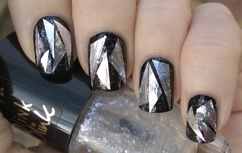 Для создания такого дизайна требуется подготовить ноготь, нанести черную базу, после полного высыхания базового покрытия втереть пигмент серебристого цвета. Закрепить топом.