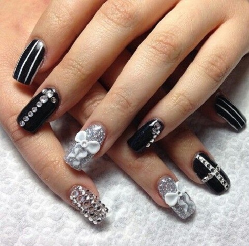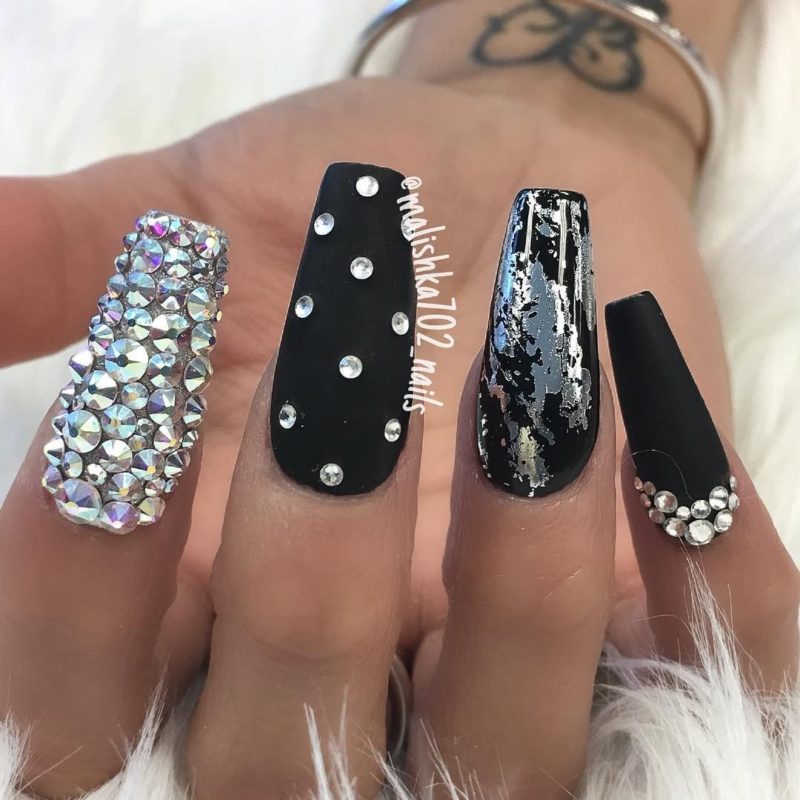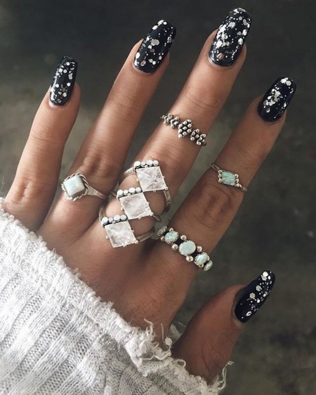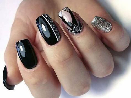 - Черный дизайн ногтей с серебром на разную длину ногтей