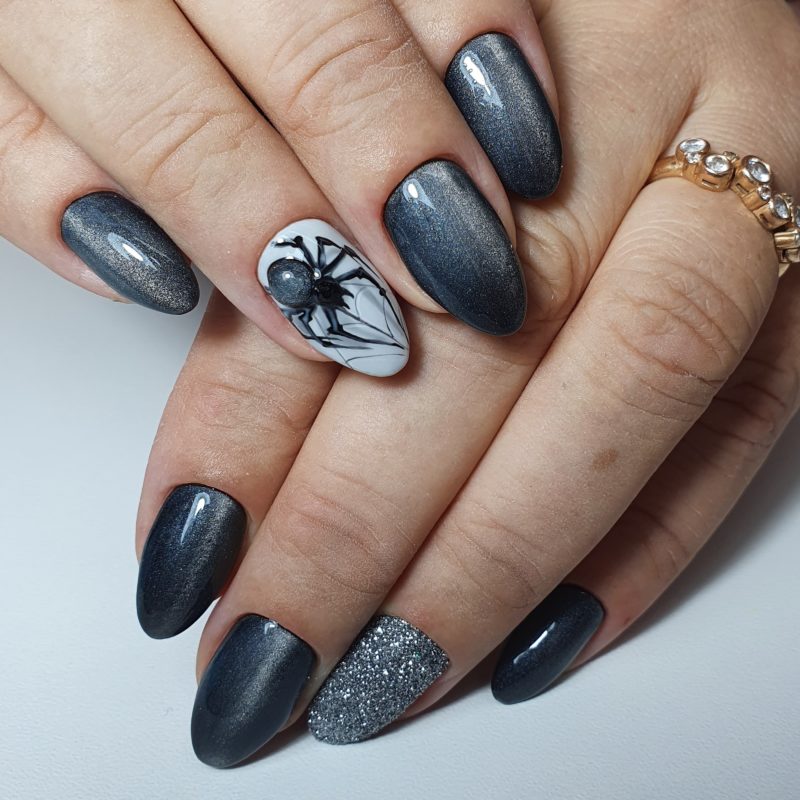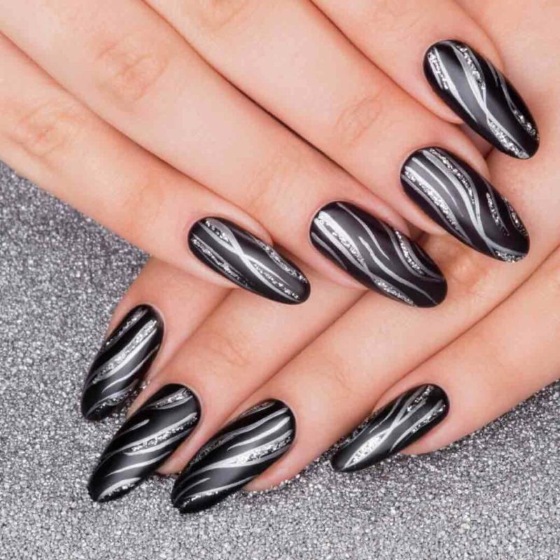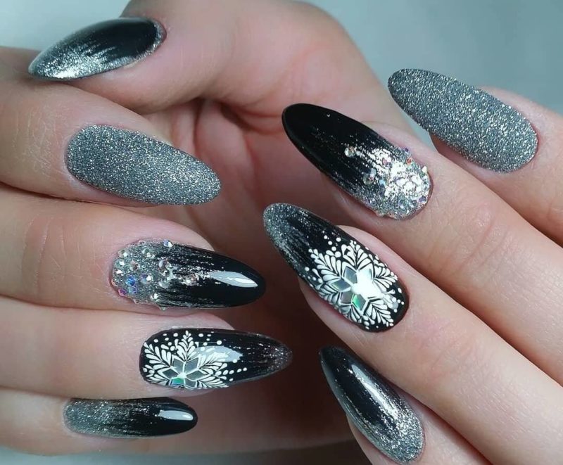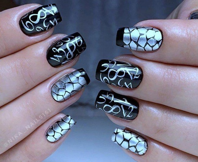 Черно-серебристое покрытие украшает ноготь любой формы и длины, подходит дамам любого возраста и подчеркивает индивидуальность каждой барышни.
