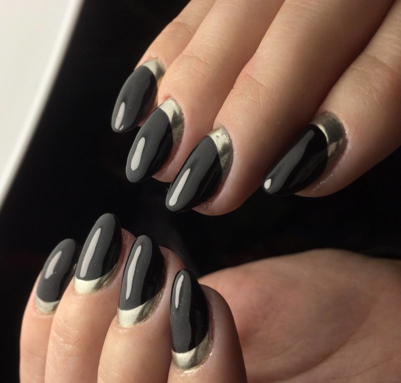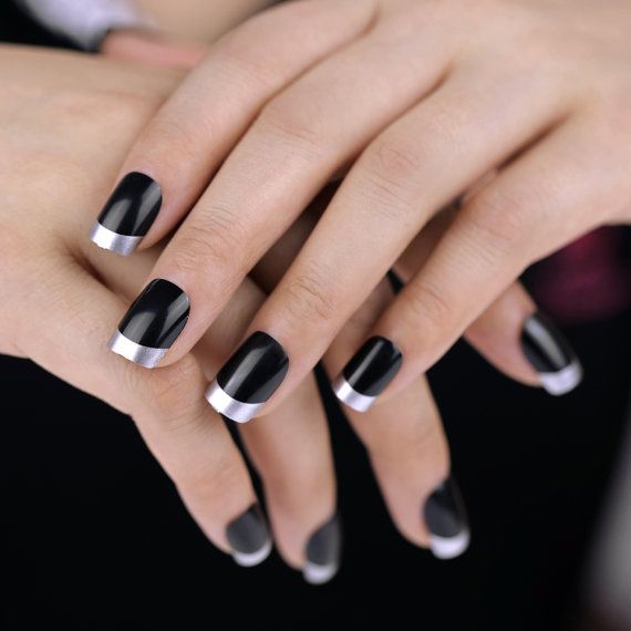 Френч считается классикой в маникюре. Для его выполнения требуются длинные или средние ногти. На коротких выполнить данный дизайн проблематично. Существуют различные вариации френча — можно черным и серебристым сделать край ноготка, а можно покрыть темным оттенком сам ноготь, сделав серебристый кончик.
