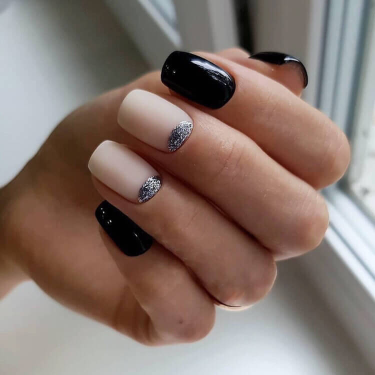 Если девушка не любят яркие ногти, но хотят разнообразия в маникюре, можно сделать маникюр в стиле «Negative space». Кроме черного и серебристого цвета в дизайне будет участвовать телесный оттенок, который придаст аккуратный внешний вид ноготкам. Лаконичный дизайн подойдет, если яркие ногти не позволяет сделать рабочий дресс-код.