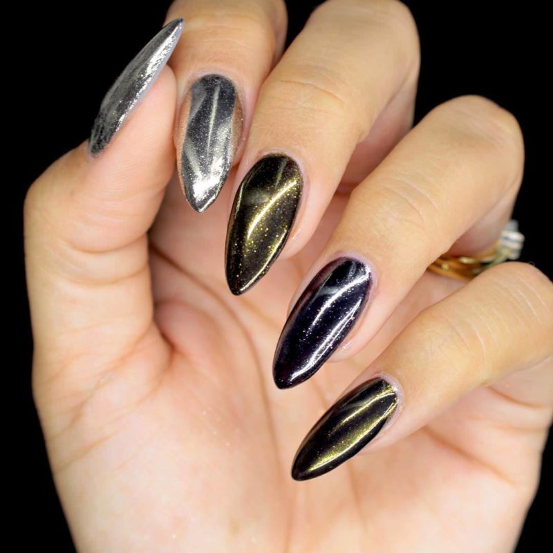 В 2020 году в моду вошли так называемые втирки — пигменты, которые создают металлический эффект на ногтях. Особенно ярко смотрятся на черной базе.