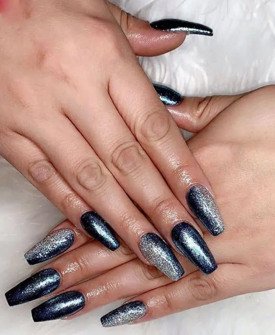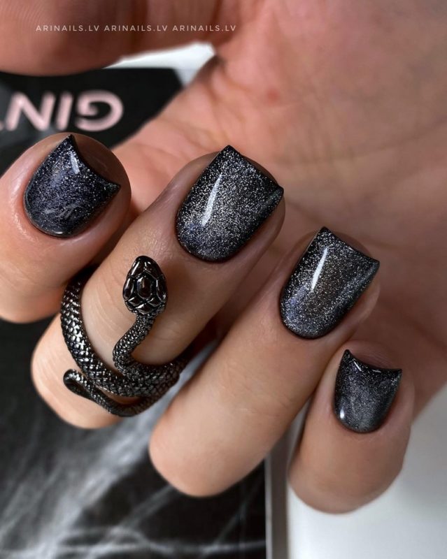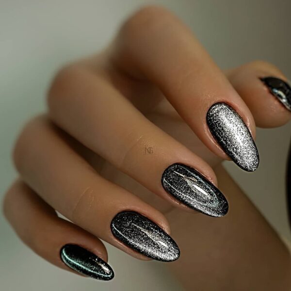 Один из самых простых дизайнов. Можно выбрать силу эффекта «кошачий глаз», поэтому каждый маникюр с этим дизайном — уникальный и неповторимый. Сверкающие серебристые частицы могут заполнять всю черную подложку, а могут покрывать лишь часть ногтя.