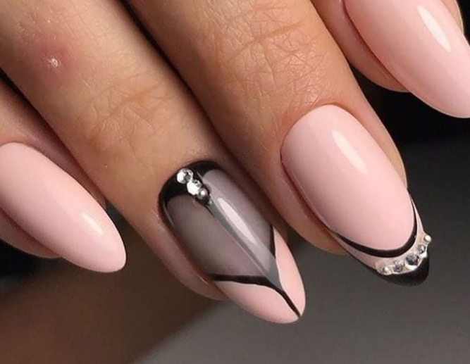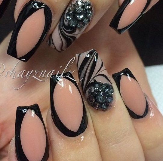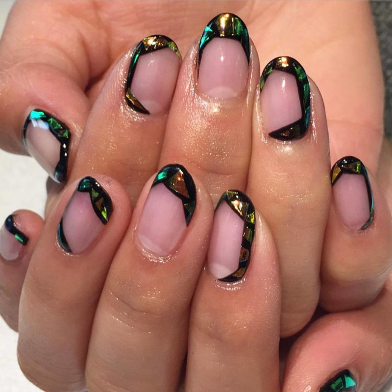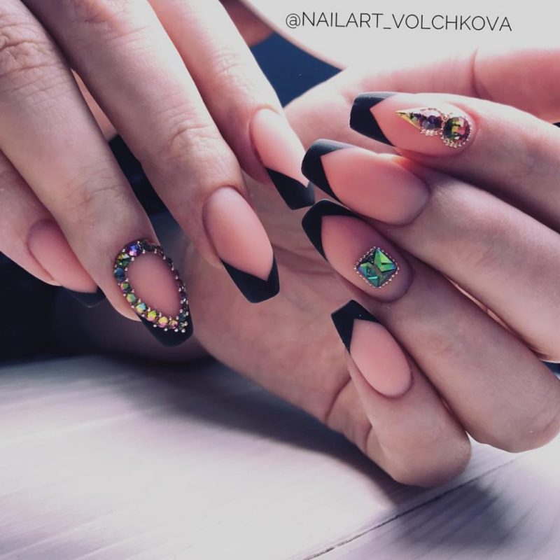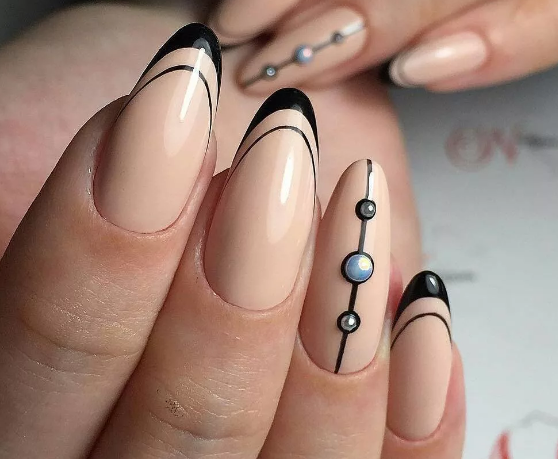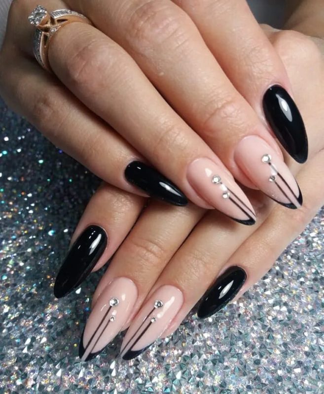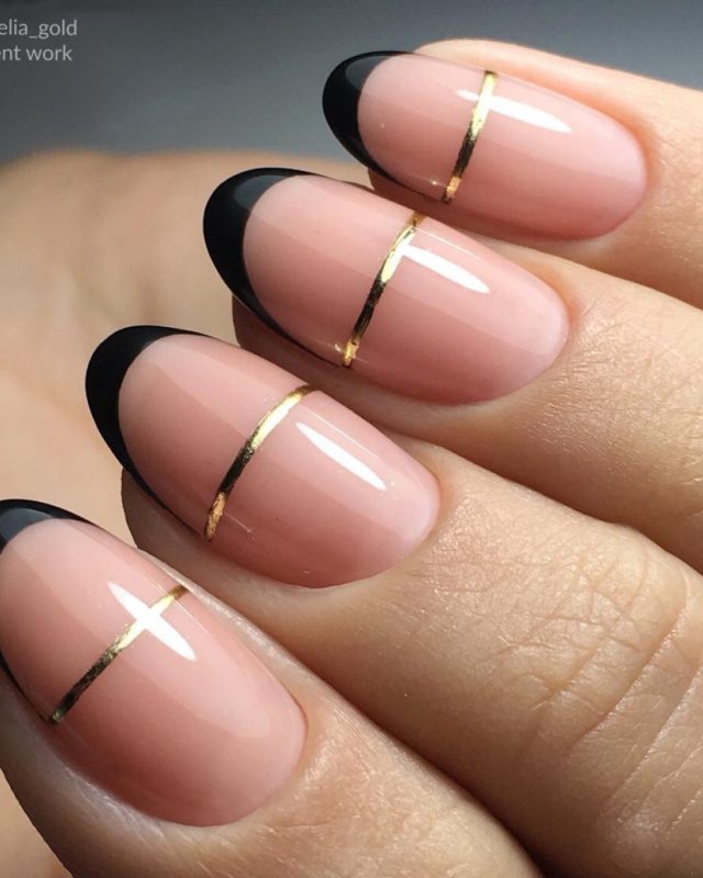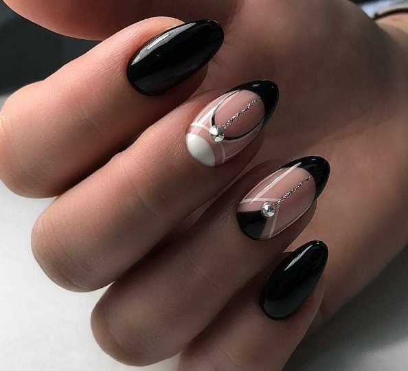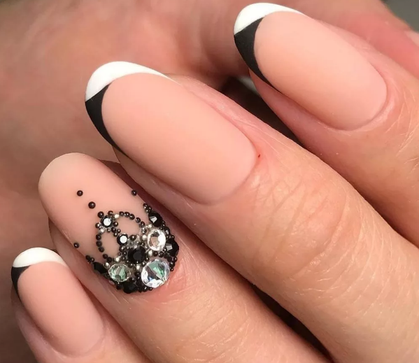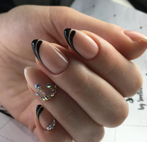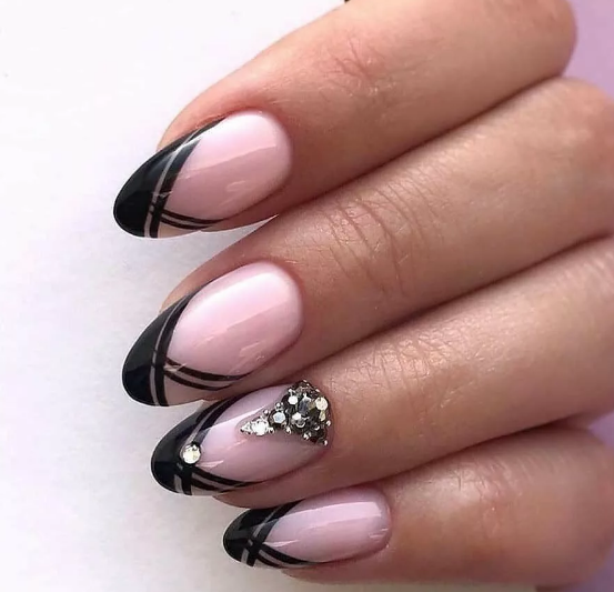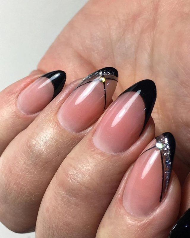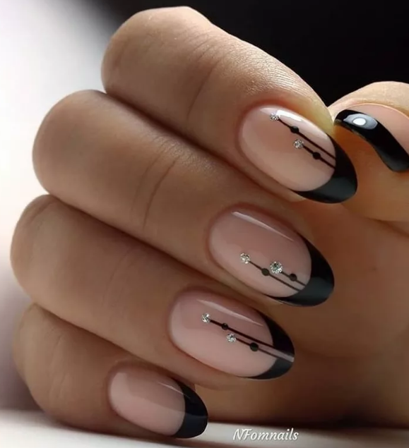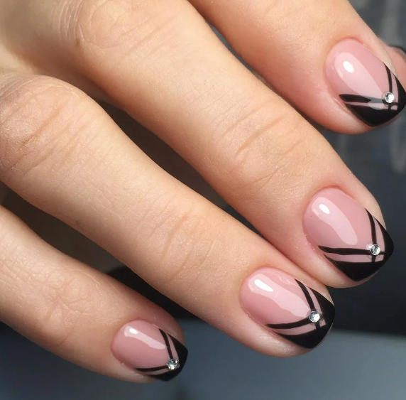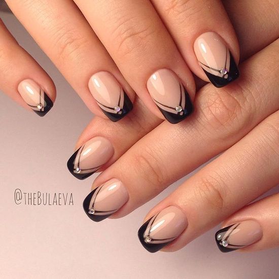 Если вы немного устали от моно маникюра в темном оттенке, выбирайте черный френч, дополняя его дизайном — от минималистичных полосок до обилия блесток и стразов.
