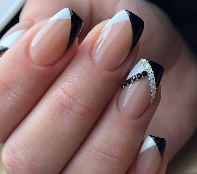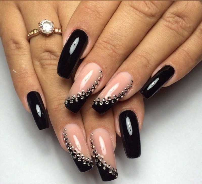 Лучше всего стразы на черном french смотрятся на кайме или лунке. Еще один вариант — продольная полоска из мелких камней.