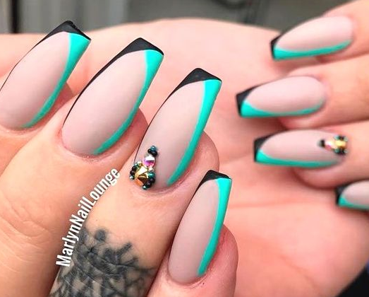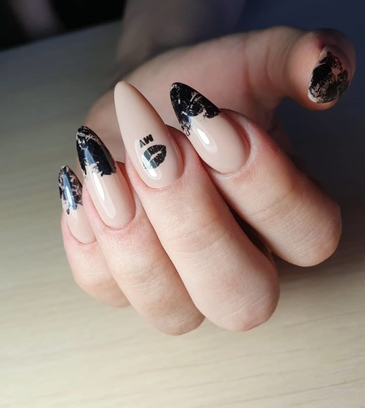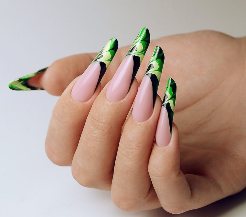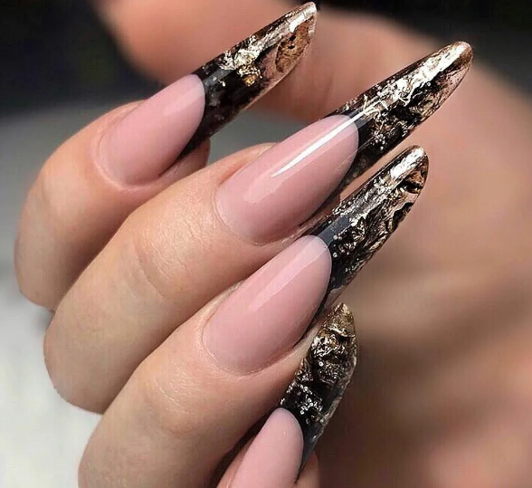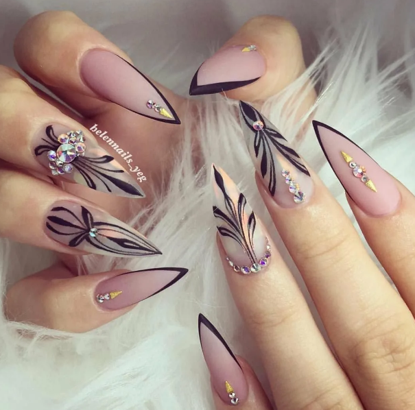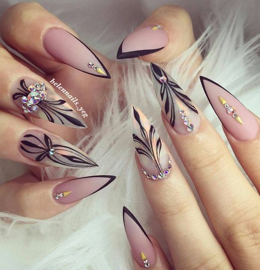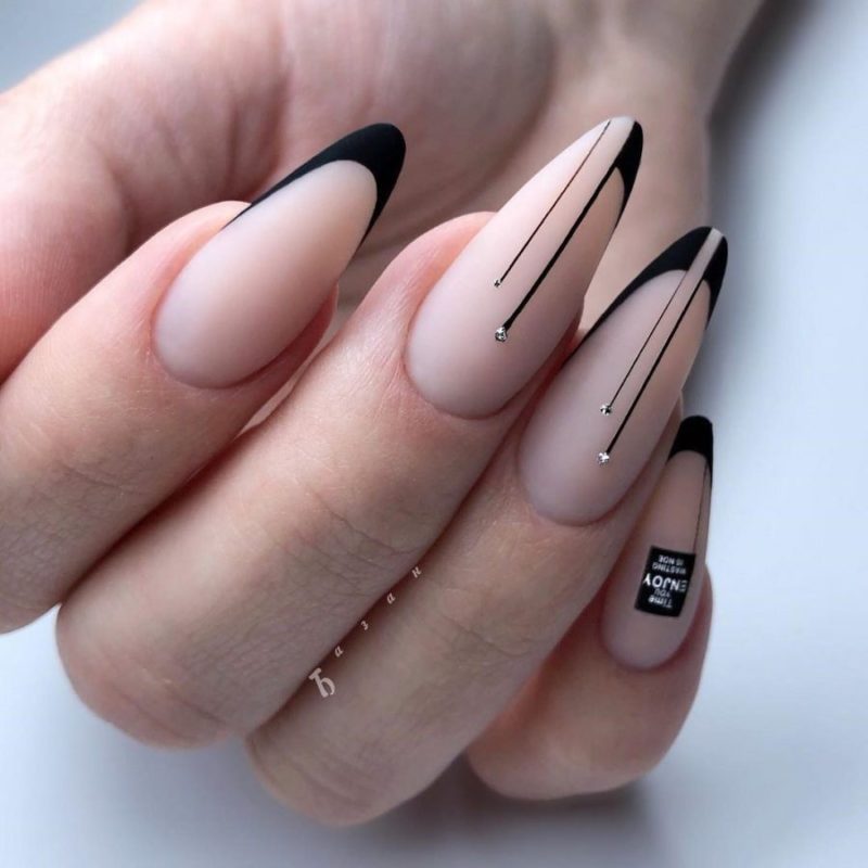 Острые ногти привлекают внимание даже в том случае, если покрыты нюдовым камуфляжем без дополнительного декора. Рекомендуется выбирать дизайн с осторожностью, чтобы он не был вульгарным. Актуален обычный классический вариант френча с темной — глянцевой или матовой — каймой.