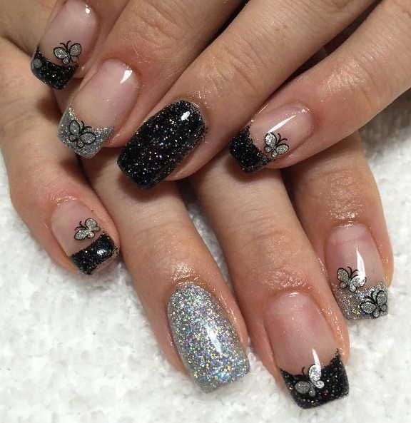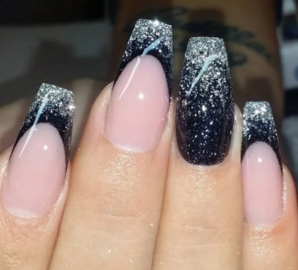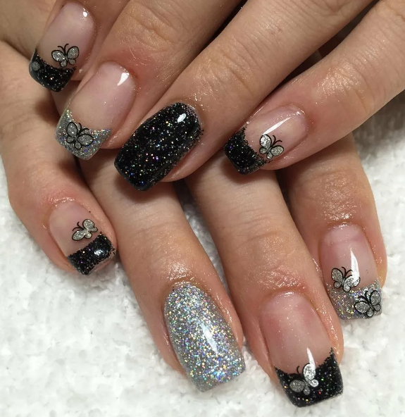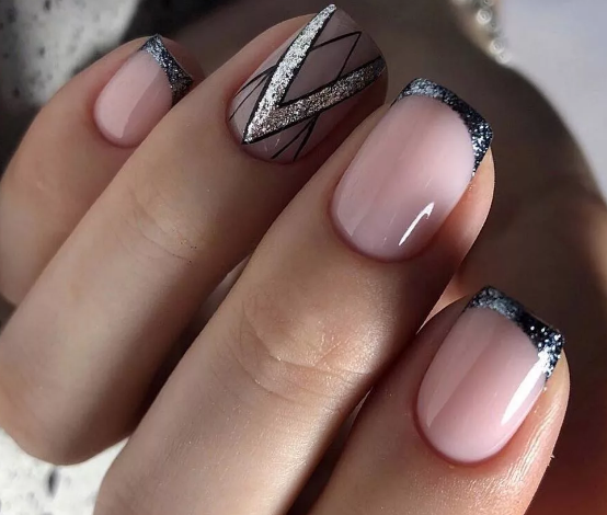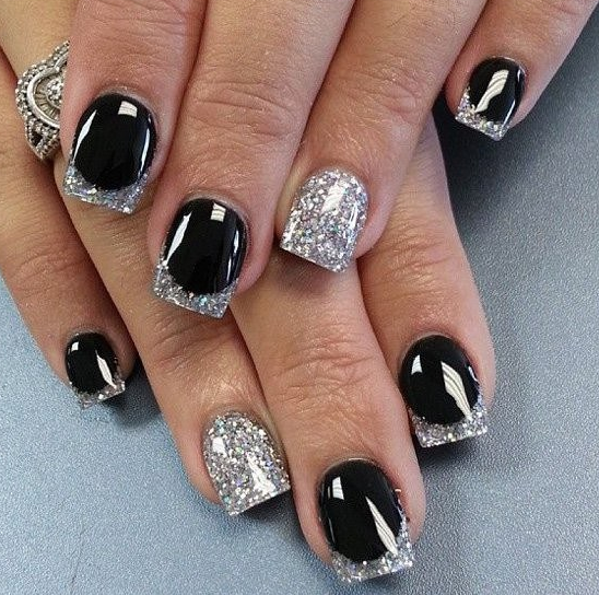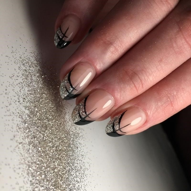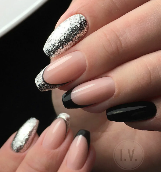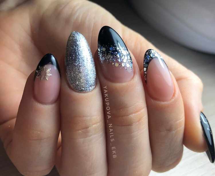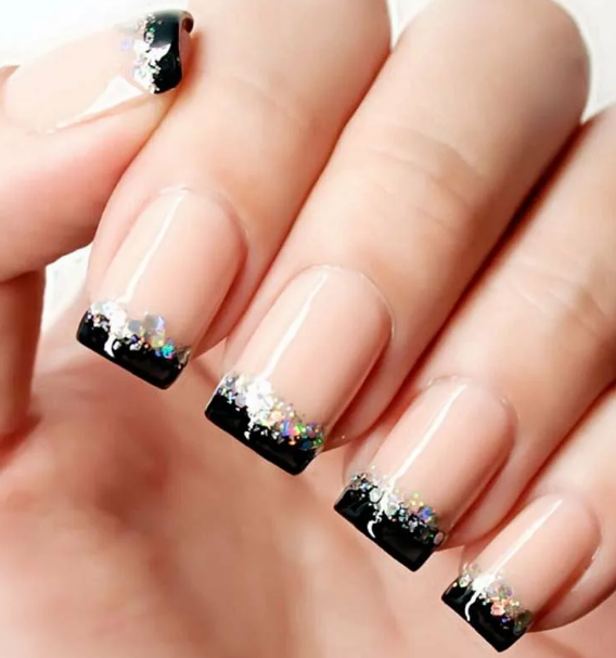 Блестки — легкий и простой способ сделать маникюр с темной каймой более праздничным и стильным. Блестки можно нанести на улыбку французского маникюра, выделить ими отдельный ноготок или покрыть все пластины без исключения.