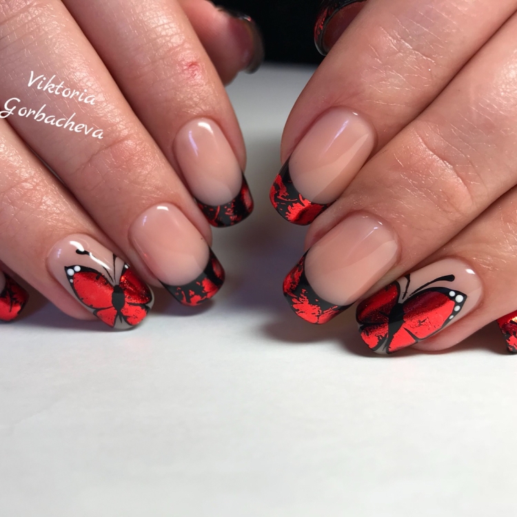 Техника ногтевого дизайна, позволяющая удлинить пластину и сформировать более аккуратную и широкую линию улыбки. Специальный гель позволяет сформировать любую форму пластины, а затем ее уже декорируют лаком темных оттенков.