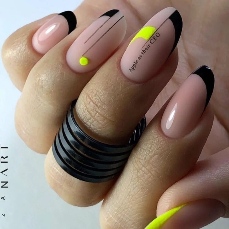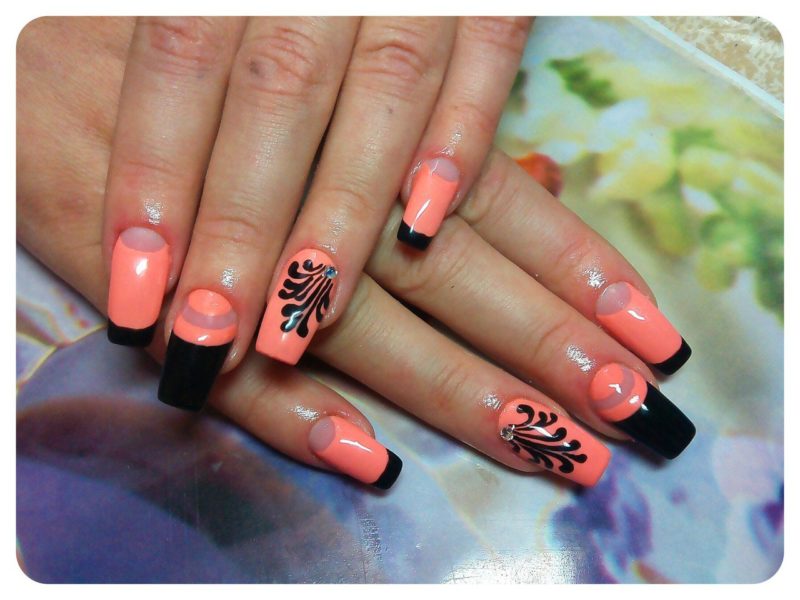 Во французском маникюре нет ограничений. Черный можно смело сочетать с оранжевым солнечным оттенком лака. Только обязательно продумайте как и с чем вы будете “носить” такой дизайн. Оранжевый — достаточно активный цвет для базы. И хотя он несколько уравновесится темным кончиком, все же останется доминирующим.