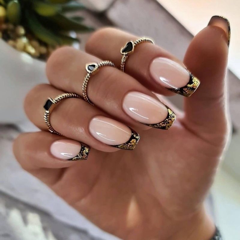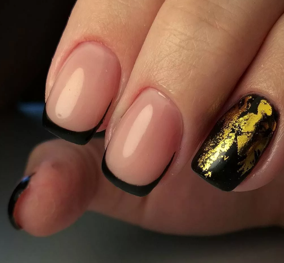 Фольга — простой, но очень интересный вариант декора для ногтей. Черный французский маникюр можно дополнить золотой, бронзовой, серебристой фольгой. оформить можно как всю пластину, только ее половину или кончик ногтя.