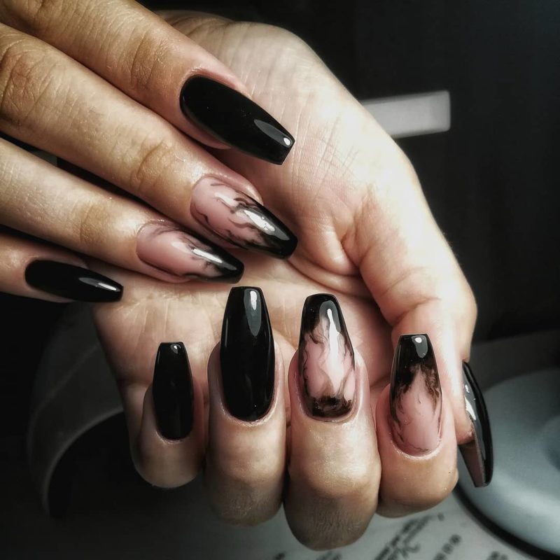 Асимметрия — это возможность сделать привычный маникюр с черной каймой более стильным и индивидуальным. Скошенная линия улыбки отлично вписывается в дизайн с геометрией или черно-белым мрамором.