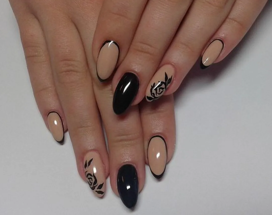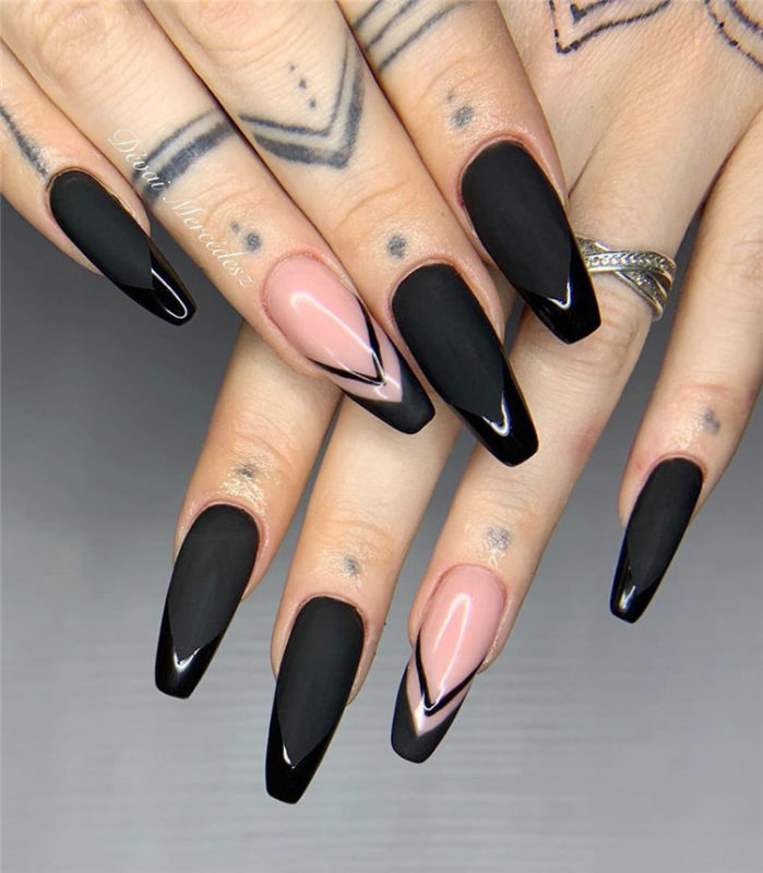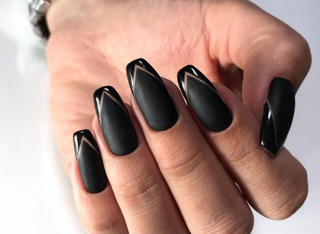 Совет: если хотите сделать полностью черный маникюр, можно покрыть ноготь глянцевым лаком, а затем выделить кайму тем же оттенком, но покрыть матовым топом.