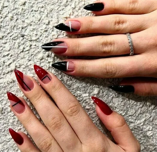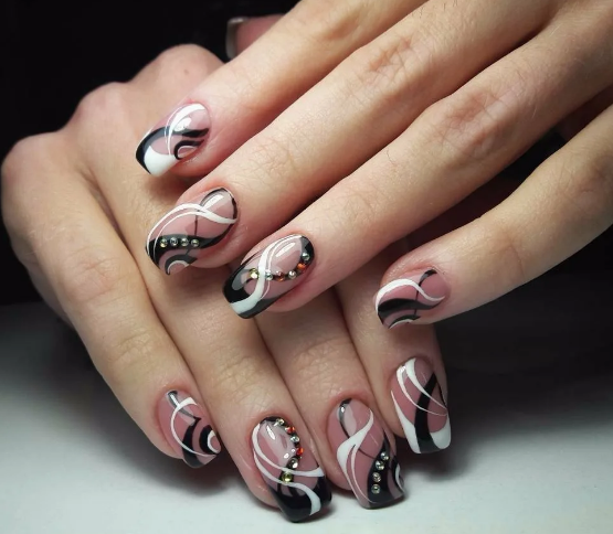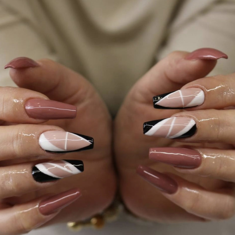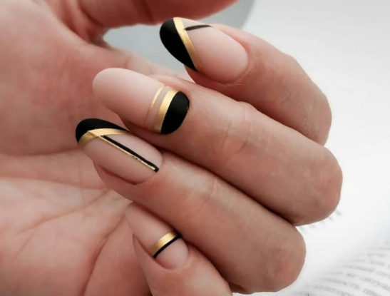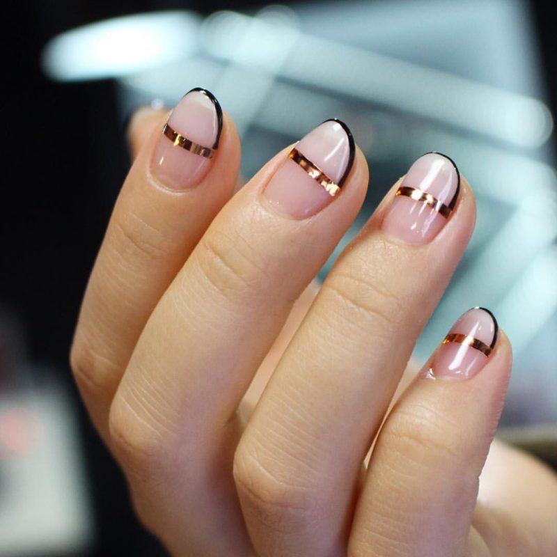 Сюда относят, например, твист френч. Для его создания используют не только черный, но еще один — контрастный — оттенок лака. Это может быть белая, серебристая, золотая, синяя и другие полоски. Они идут по направлению друг к другу и могут соединяться или идти параллельно.