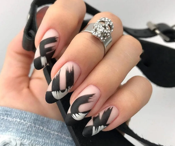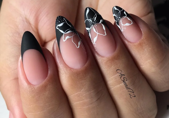 Матовая текстура уже не первый год находится на пике моды. Черный французский маникюр с матовым покрытием улыбки — это элегантно и необычно. Особенно он подходит для длинных миндалевидных ноготков.