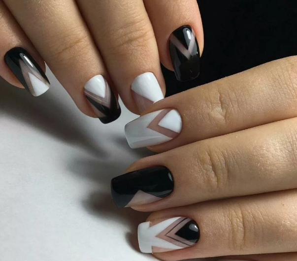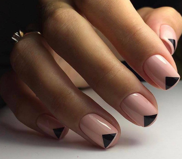 Для короткой длины подходит треугольный тип — две полоски на краю пластин, которые сходятся в середине под острым углом. Этот прием позволит визуально удлинить ноготь и сделать его более изящным.