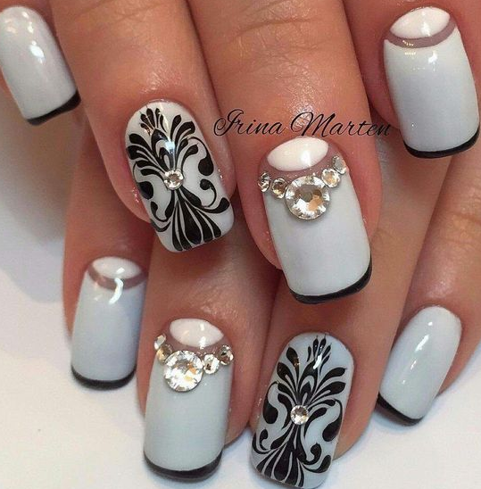Французский маникюр с темной улыбкой можно дополнить дизайном. Рекомендуется выбирать минималистичные рисунки, геометрию, наклейки, блестки. Стразы выбирают с осторожностью, они могут сильно перегрузить нейл арт и сделать его безвкусным. Для короткой длины больше подходят мелкие камушки — серебристого, белого и темных оттенков.