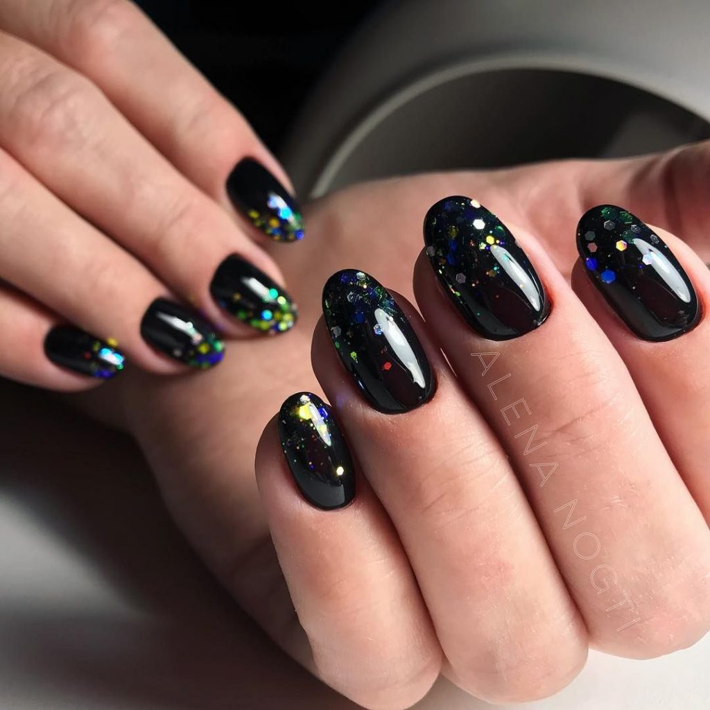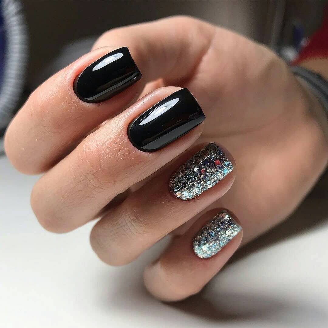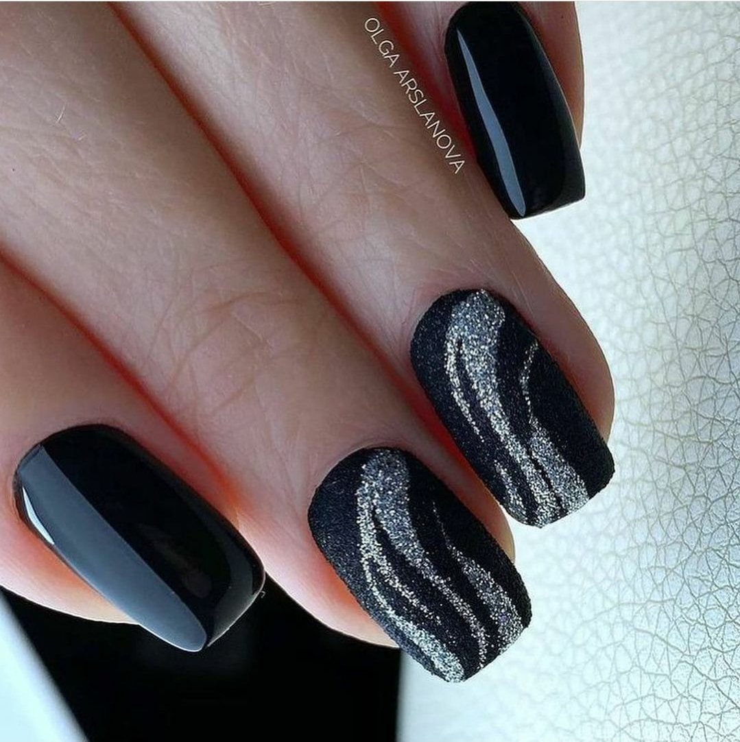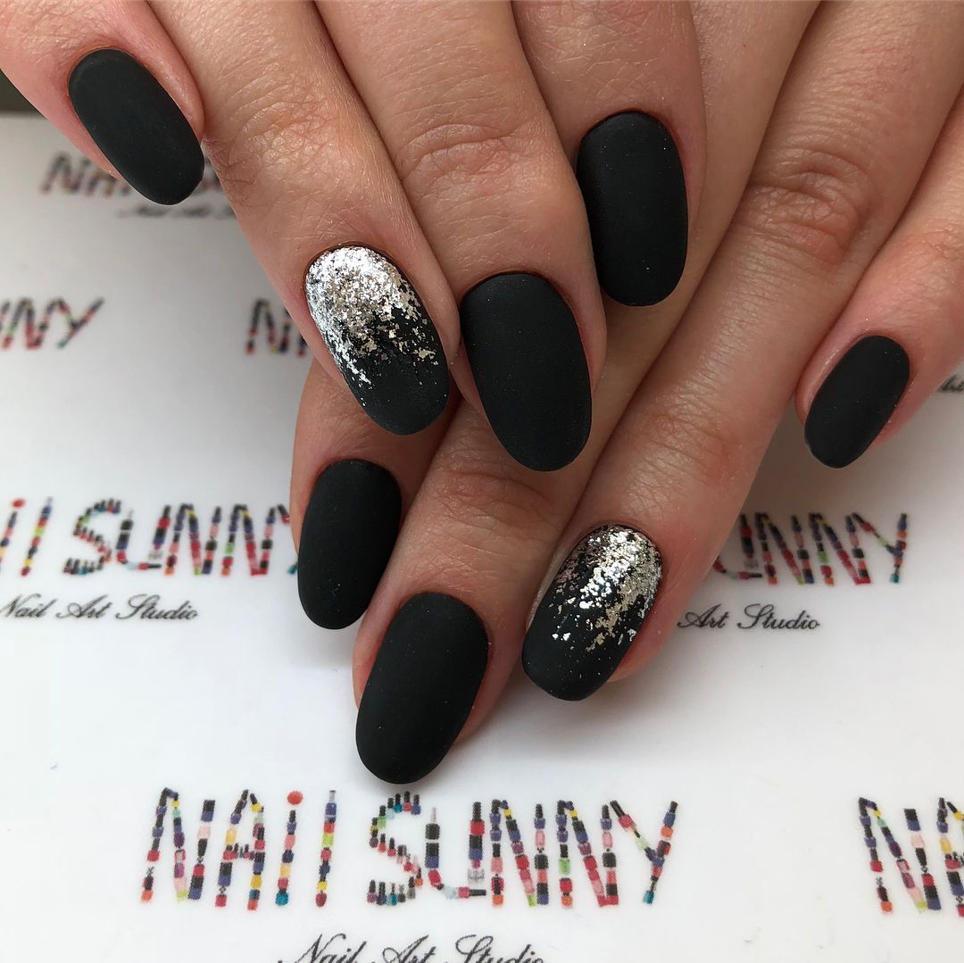 Добавить в черный маникюр немного блеска — отличная идея. Как вы разместите блестки на ногте и какими они будут (жидкие или сухие) — не важно. Обратите внимание на интересную технику — растяжка блестками. Вам понадобится кисточка и блестки. Если предпочитаете использовать сухие, предварительно их нужно будет смешать с топом. Техника проста в исполнении — сначала нужно будет нанести слой в пару миллиметров на ту часть ногтя, из которой вы планируете растягивать блестки. А затем уже с помощью кисти «тянуть» в нужную сторону до достижения нужного эффекта.