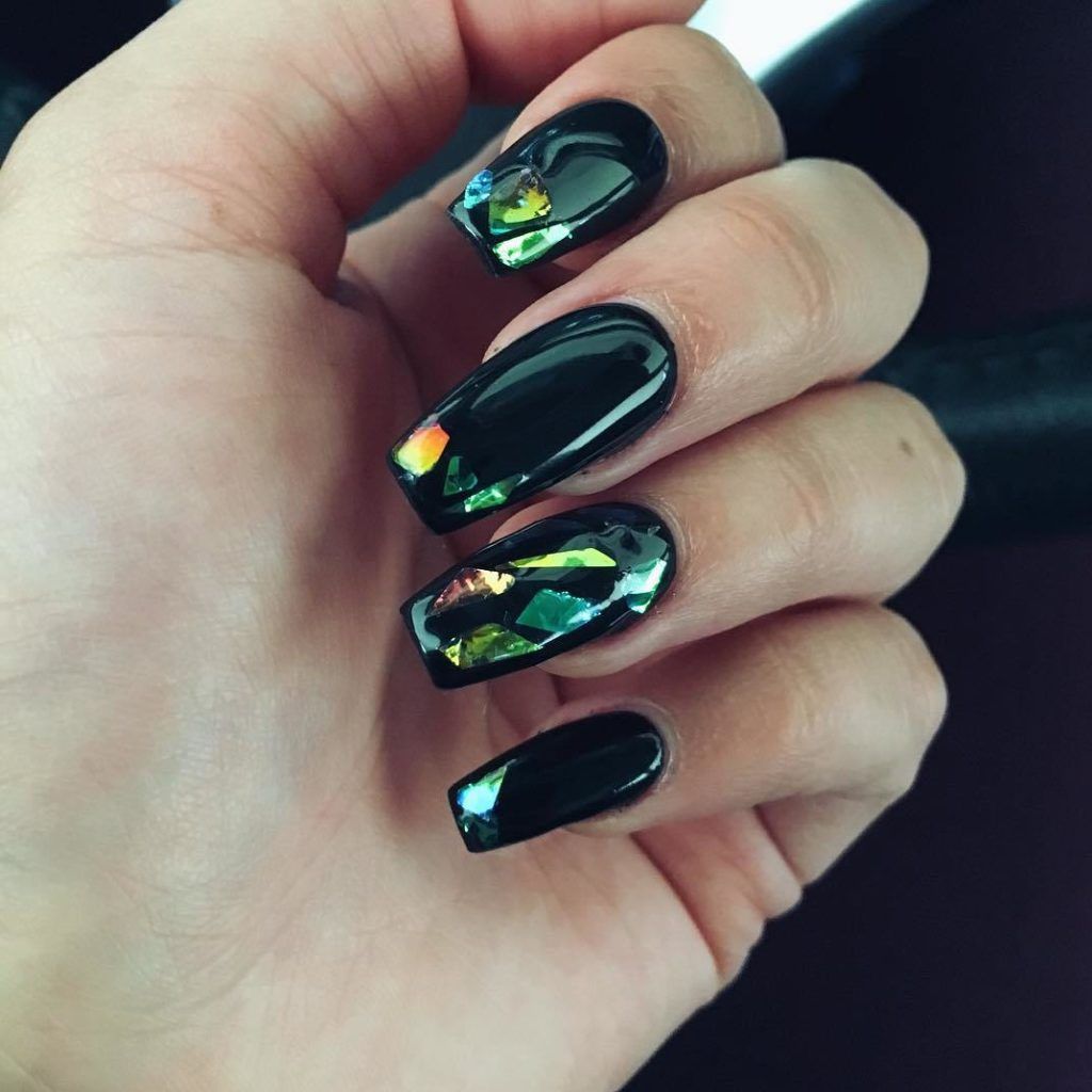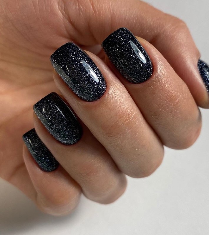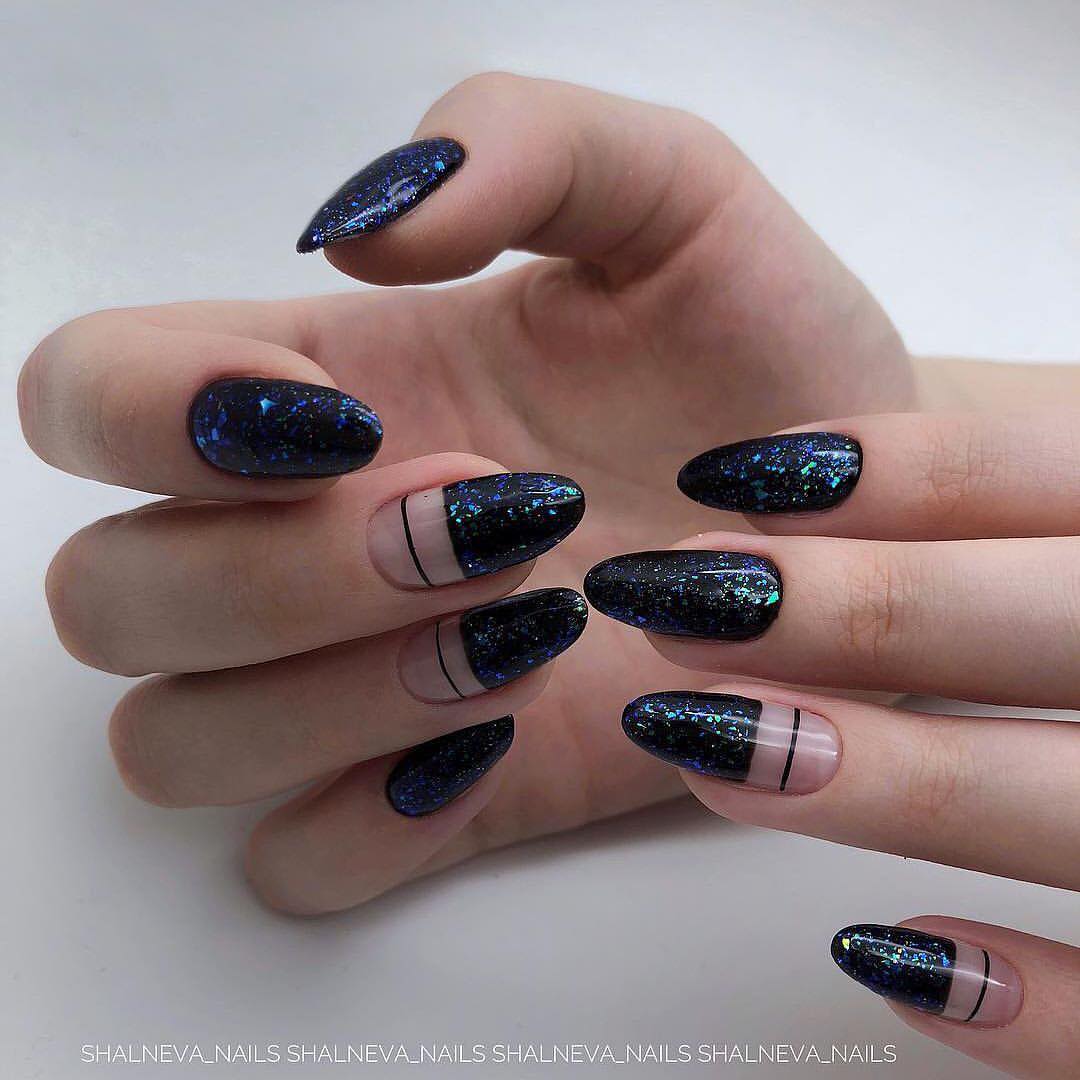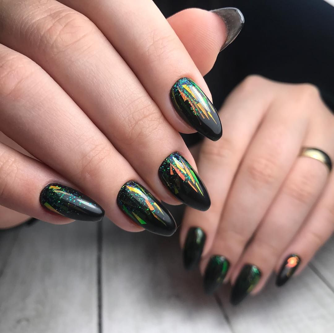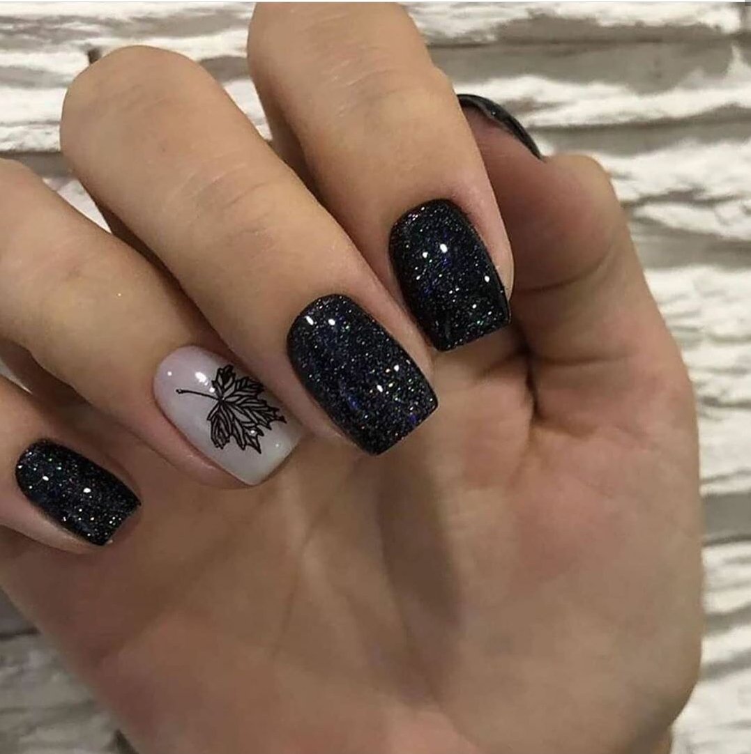 Добавить в черный маникюр немного блеска — отличная идея. Как вы разместите блестки на ногте и какими они будут (жидкие или сухие) — не важно. Обратите внимание на интересную технику — растяжка блестками. Вам понадобится кисточка и блестки. Если предпочитаете использовать сухие, предварительно их нужно будет смешать с топом. Техника проста в исполнении — сначала нужно будет нанести слой в пару миллиметров на ту часть ногтя, из которой вы планируете растягивать блестки. А затем уже с помощью кисти «тянуть» в нужную сторону до достижения нужного эффекта.
