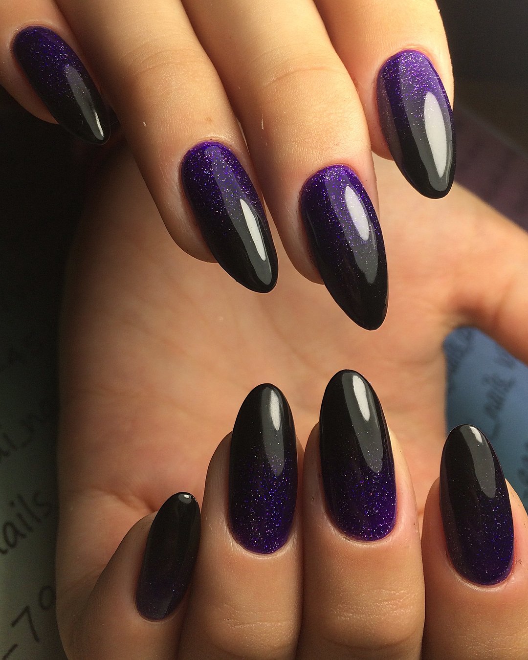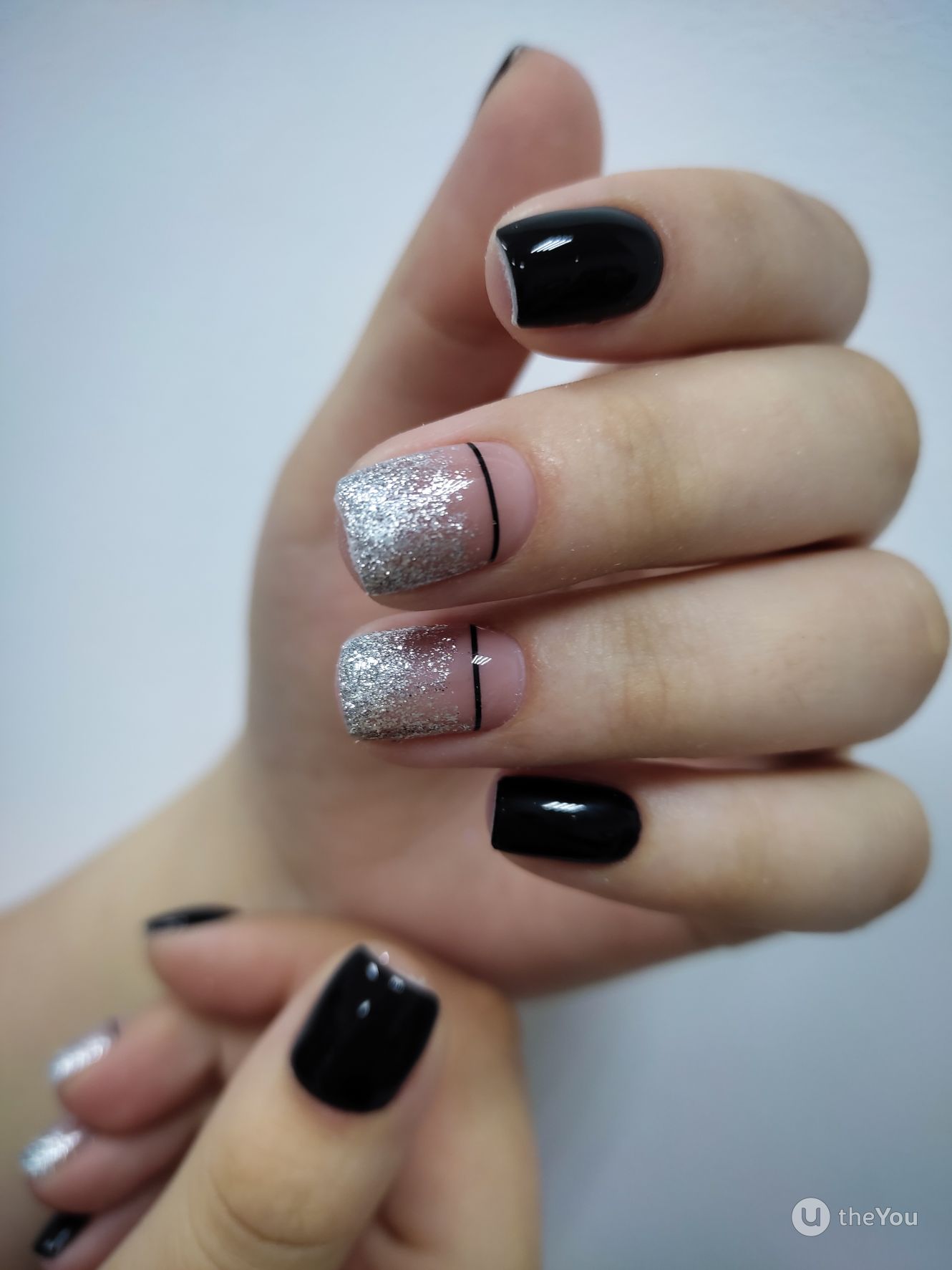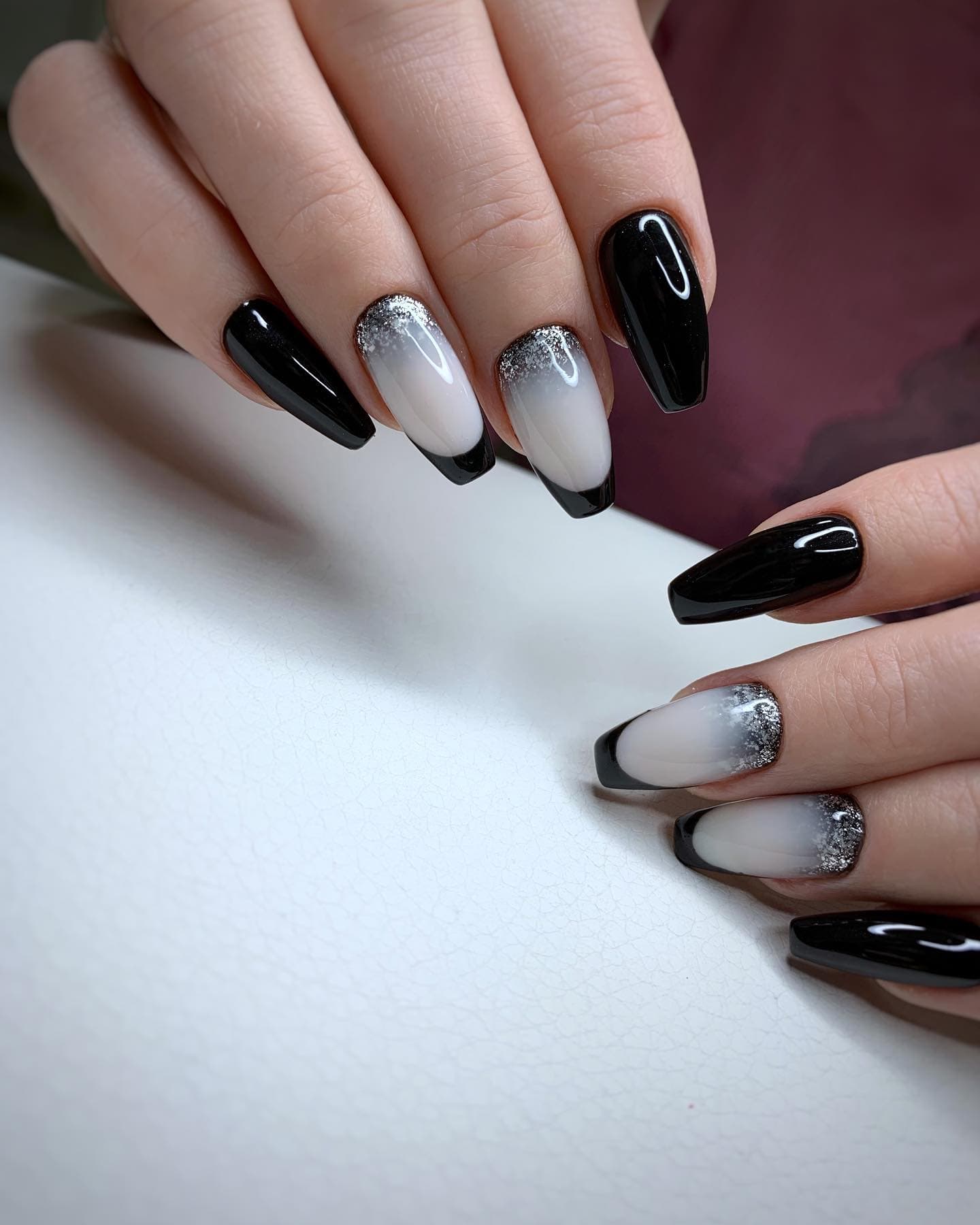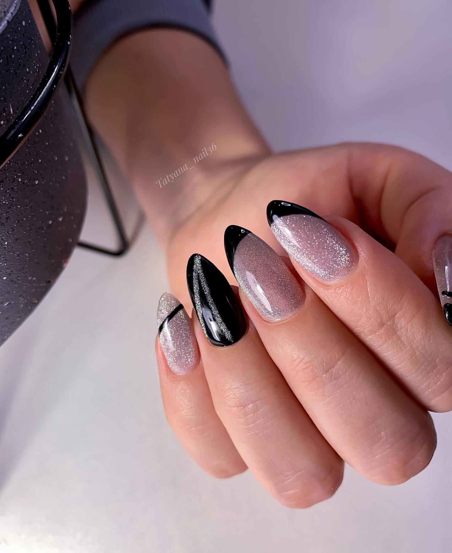 Добавить в черный маникюр немного блеска — отличная идея. Как вы разместите блестки на ногте и какими они будут (жидкие или сухие) — не важно. Обратите внимание на интересную технику — растяжка блестками. Вам понадобится кисточка и блестки. Если предпочитаете использовать сухие, предварительно их нужно будет смешать с топом. Техника проста в исполнении — сначала нужно будет нанести слой в пару миллиметров на ту часть ногтя, из которой вы планируете растягивать блестки. А затем уже с помощью кисти «тянуть» в нужную сторону до достижения нужного эффекта.