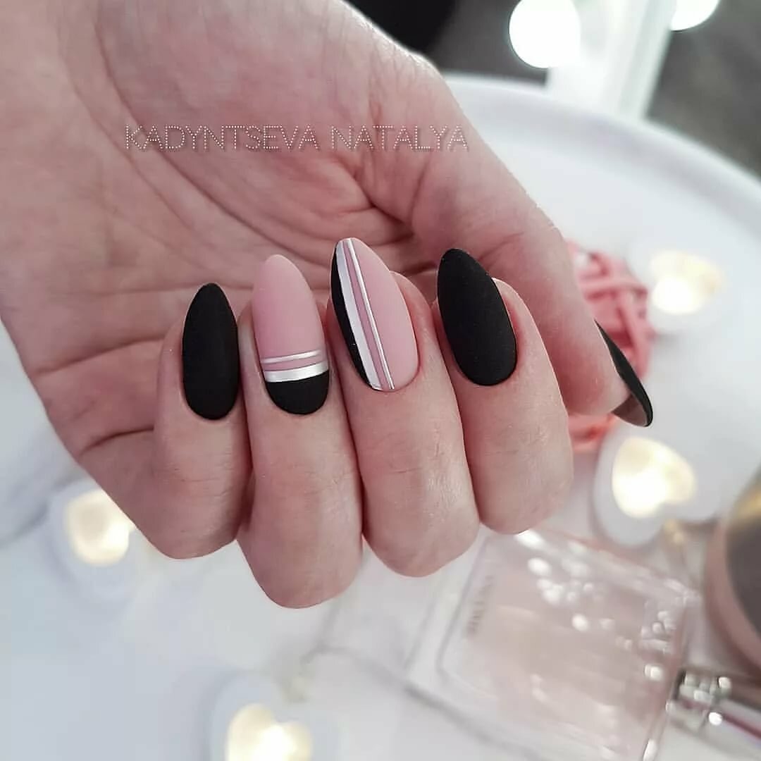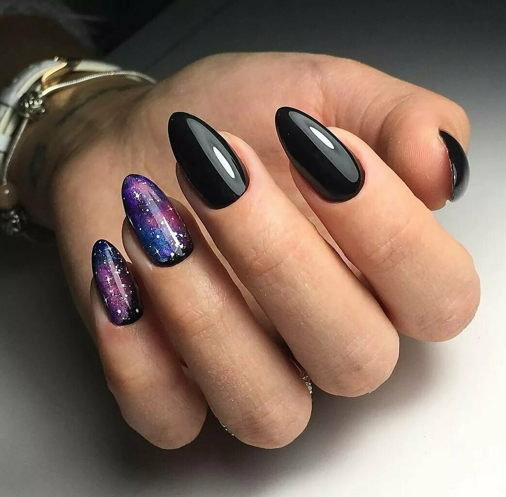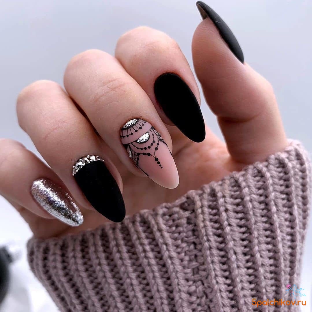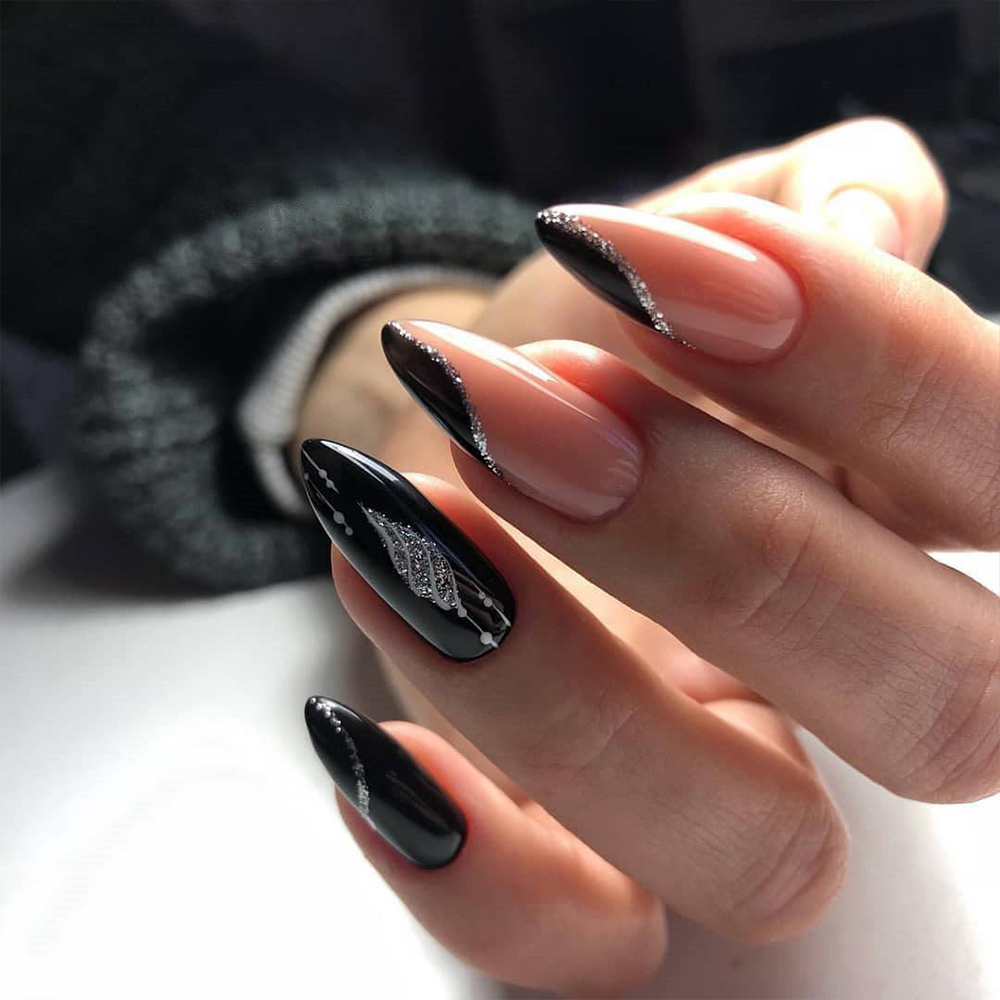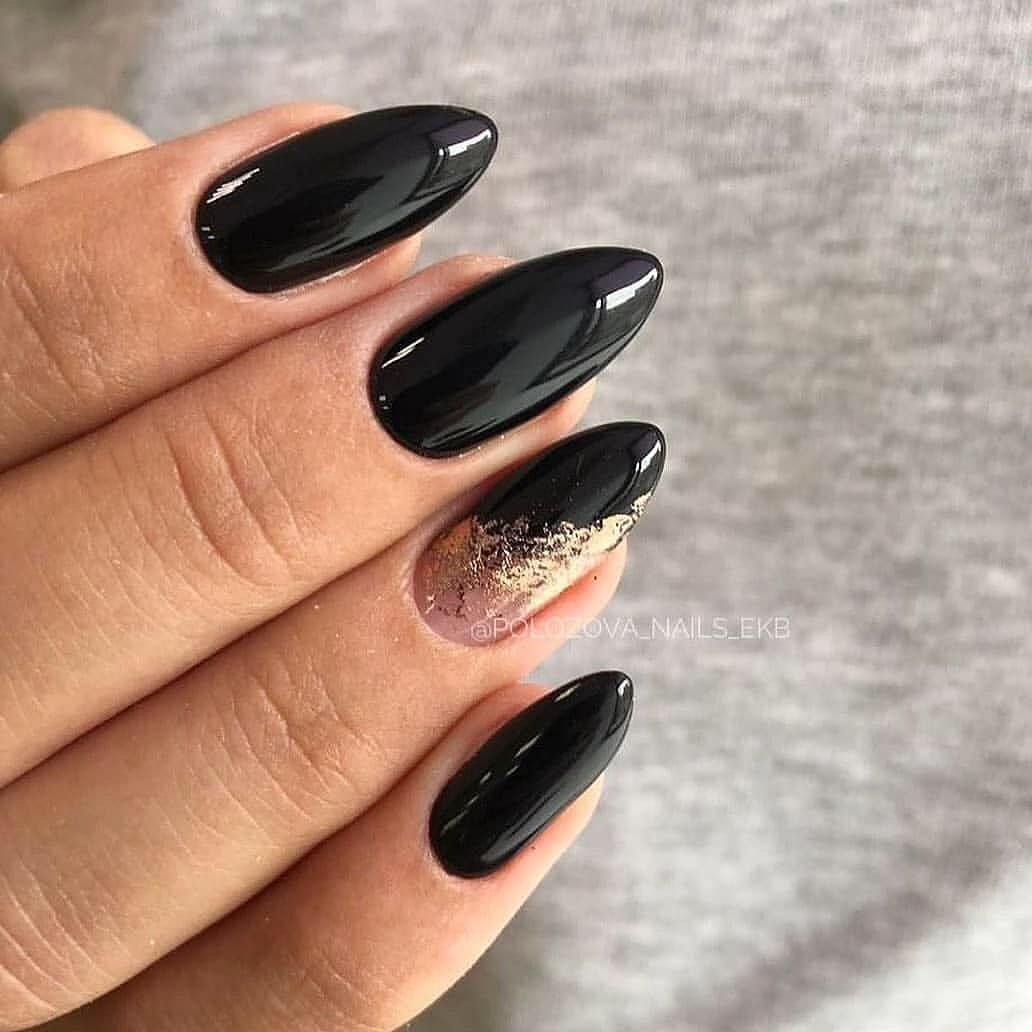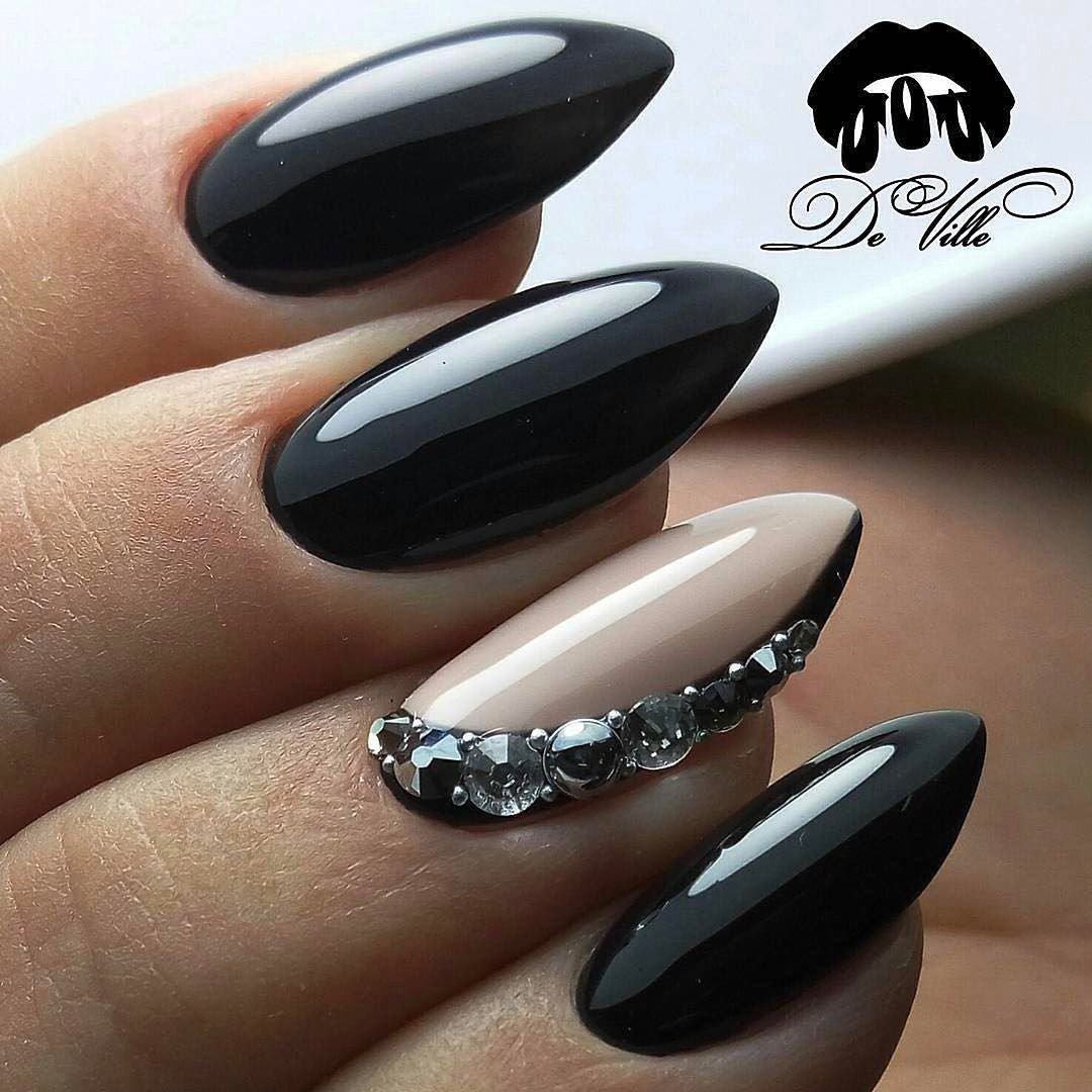 Миндалевидные ноготки — женственно и романтично. Многим кажется, что для такой формы не очень подходит мрачный лак черного оттенка. Это не так. Но если вы сторонница такого мнения, просто используйте различные сочетания цветов. Например, классическое — черный с белым, черный с красным, розовым, голубым, серебром или золотом. Несомненный плюс черного лака в его универсальности. Это цвет-база, который может сочетаться с самыми смелыми и необычными цветами. И от этого маникюр только выигрывает.