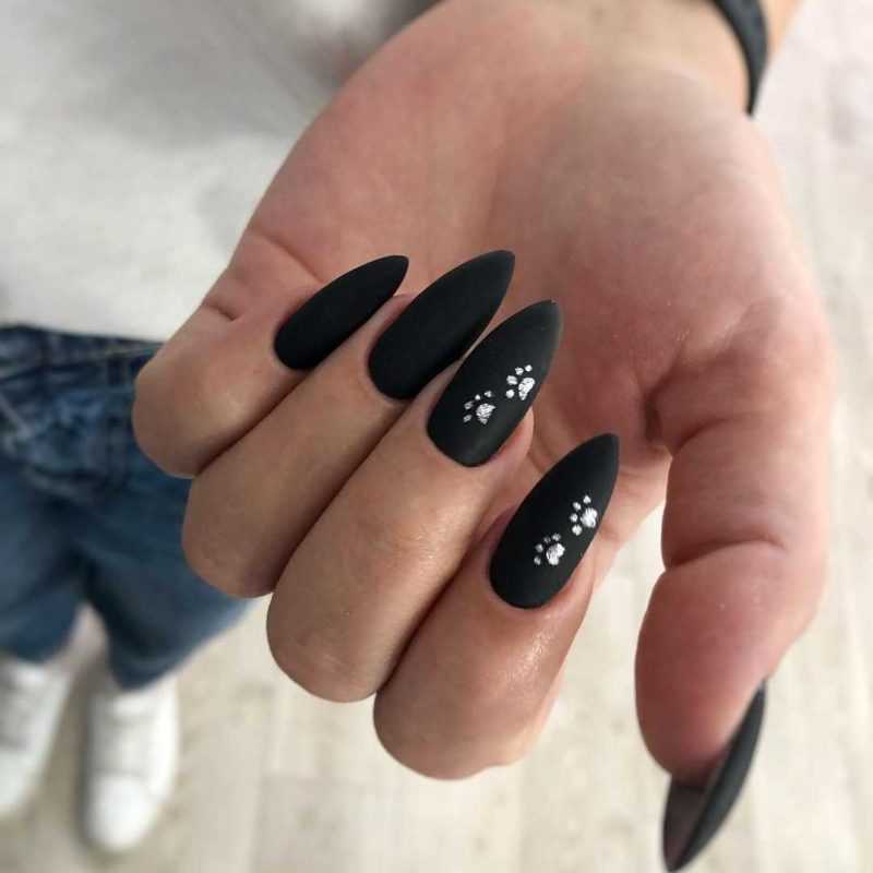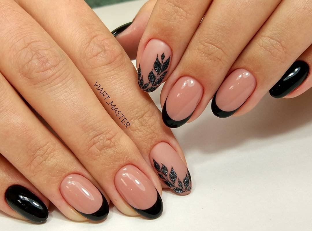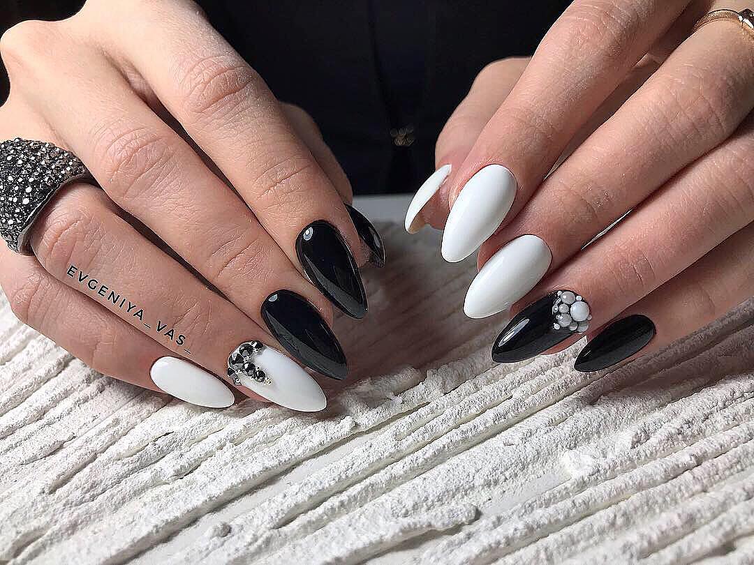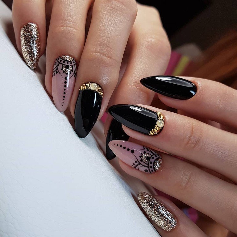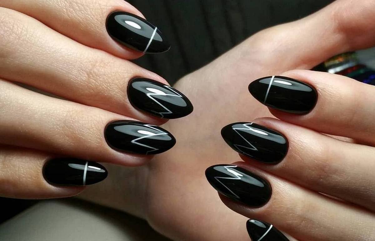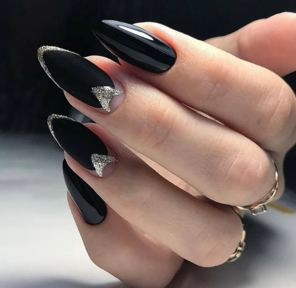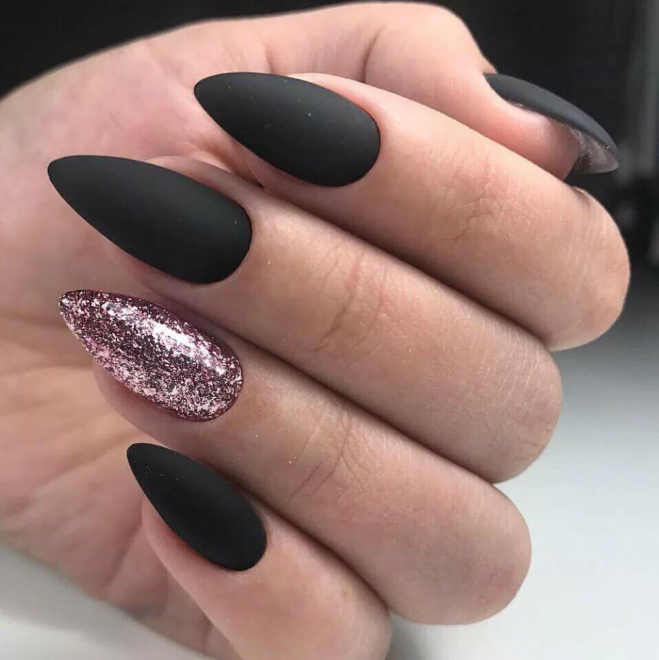 Миндалевидные ноготки — женственно и романтично. Многим кажется, что для такой формы не очень подходит мрачный лак черного оттенка. Это не так. Но если вы сторонница такого мнения, просто используйте различные сочетания цветов. Например, классическое — черный с белым, черный с красным, розовым, голубым, серебром или золотом. Несомненный плюс черного лака в его универсальности. Это цвет-база, который может сочетаться с самыми смелыми и необычными цветами. И от этого маникюр только выигрывает.