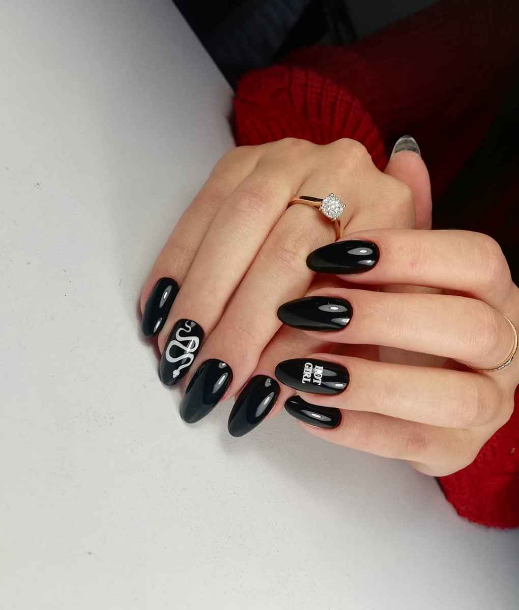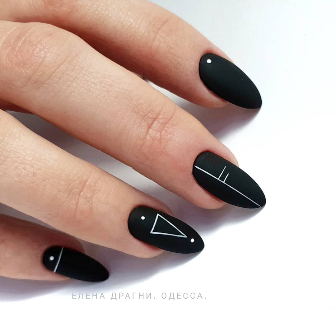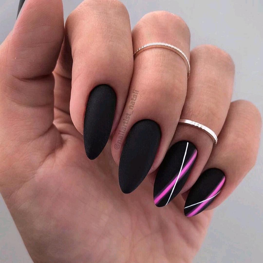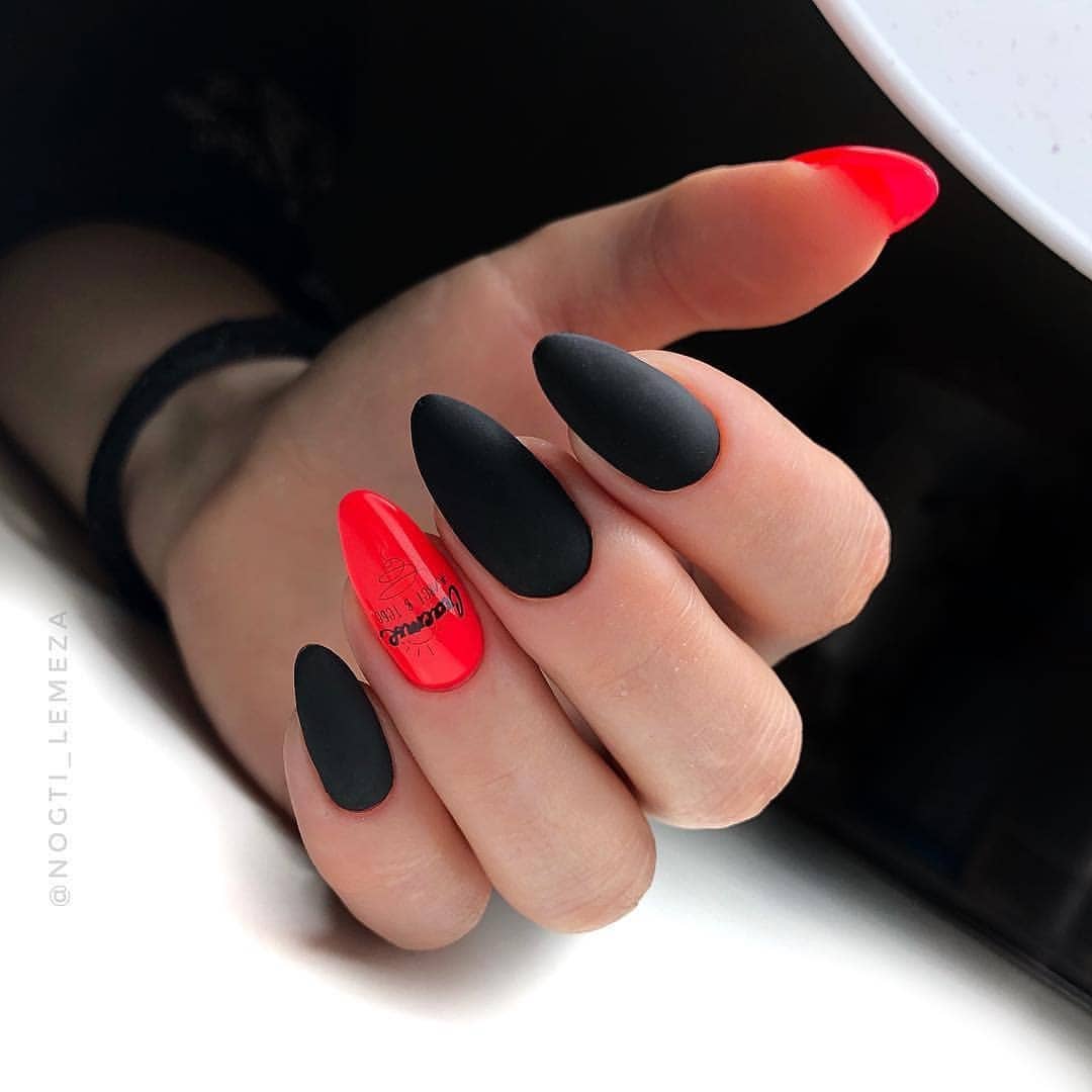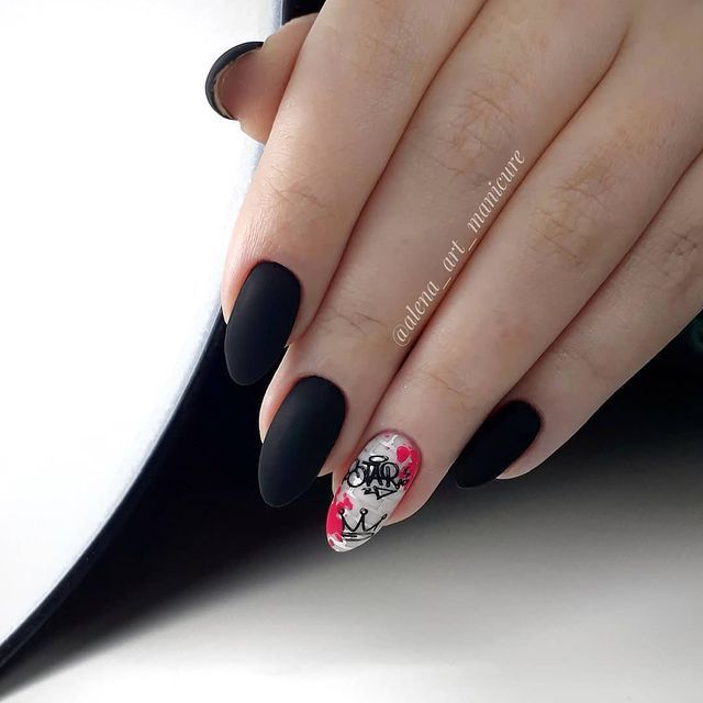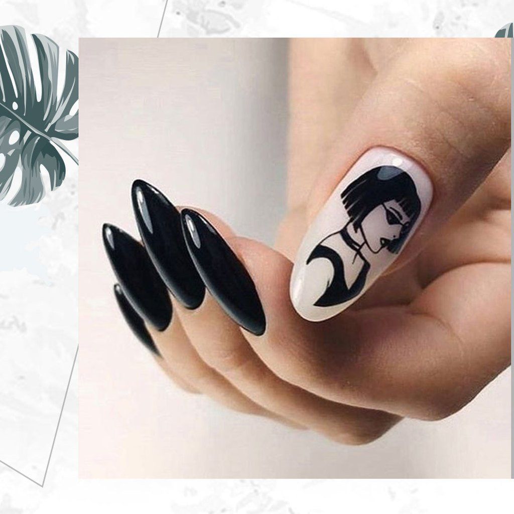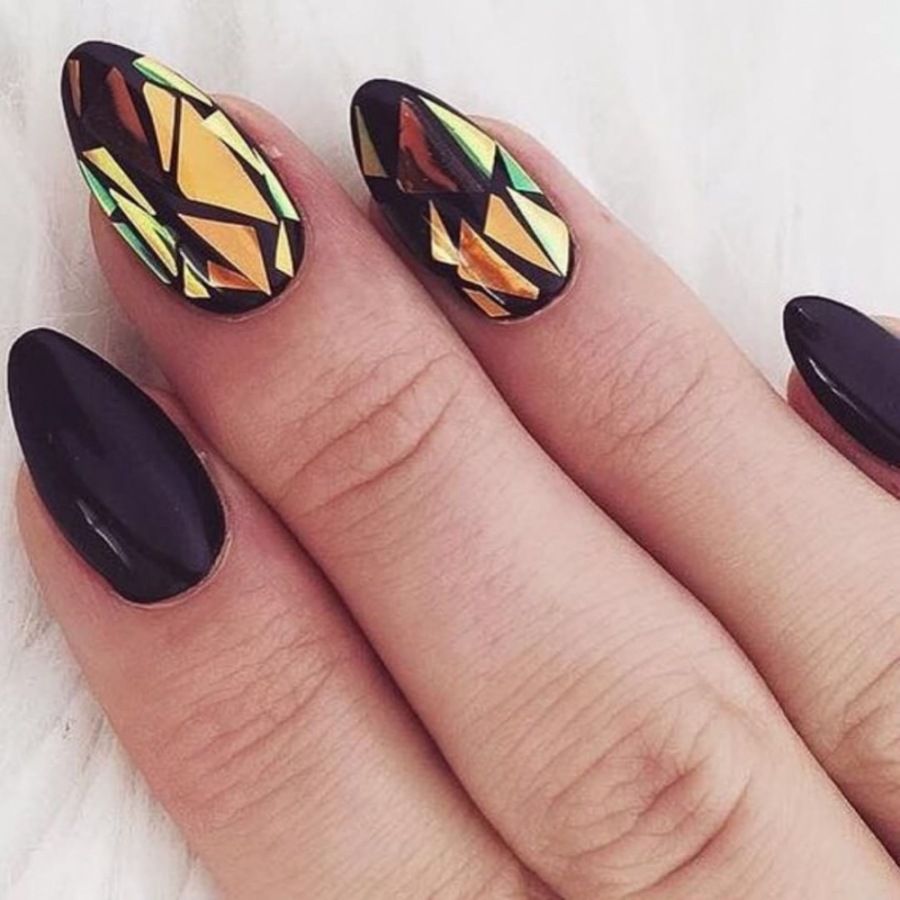 Миндалевидные ноготки — женственно и романтично. Многим кажется, что для такой формы не очень подходит мрачный лак черного оттенка. Это не так. Но если вы сторонница такого мнения, просто используйте различные сочетания цветов. Например, классическое — черный с белым, черный с красным, розовым, голубым, серебром или золотом. Несомненный плюс черного лака в его универсальности. Это цвет-база, который может сочетаться с самыми смелыми и необычными цветами. И от этого маникюр только выигрывает.