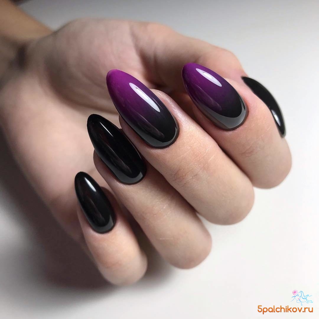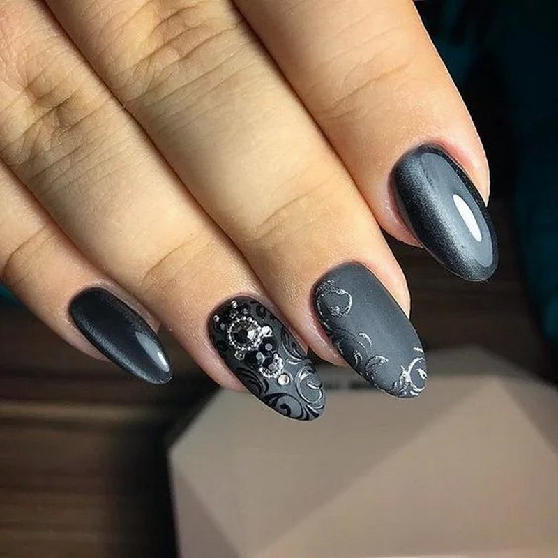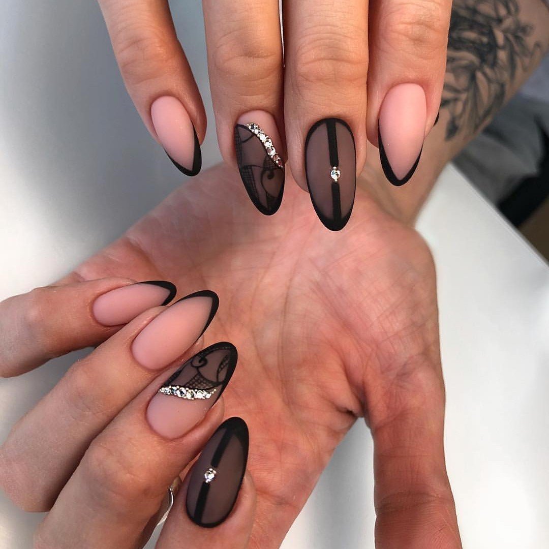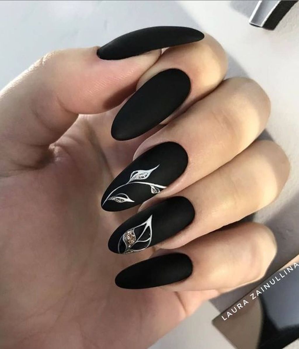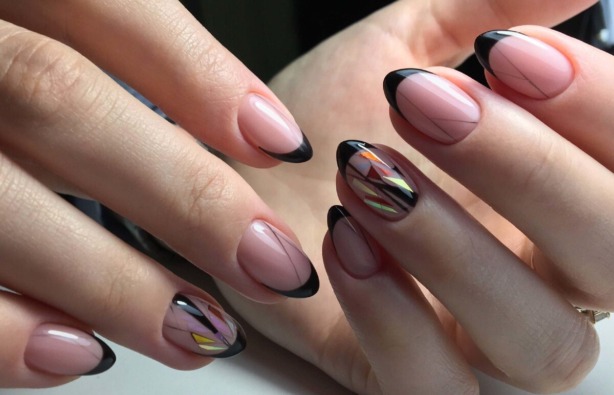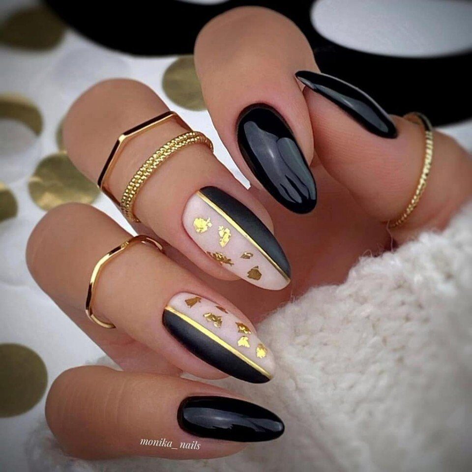 Миндалевидные ноготки — женственно и романтично. Многим кажется, что для такой формы не очень подходит мрачный лак черного оттенка. Это не так. Но если вы сторонница такого мнения, просто используйте различные сочетания цветов. Например, классическое — черный с белым, черный с красным, розовым, голубым, серебром или золотом. Несомненный плюс черного лака в его универсальности. Это цвет-база, который может сочетаться с самыми смелыми и необычными цветами. И от этого маникюр только выигрывает.