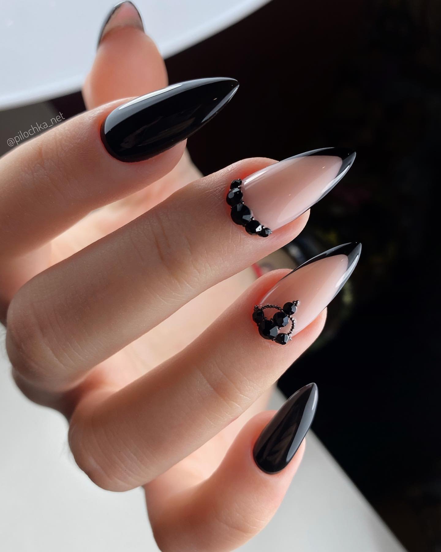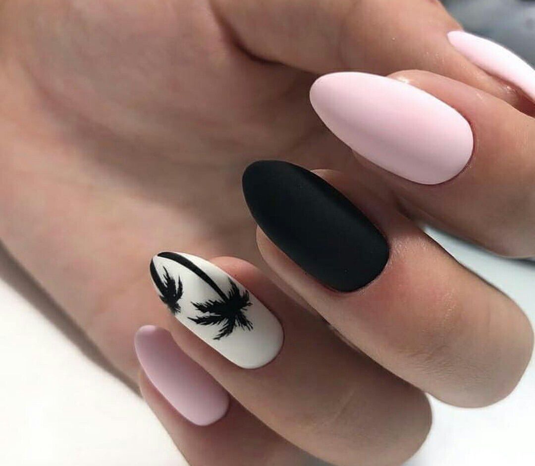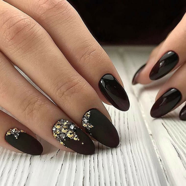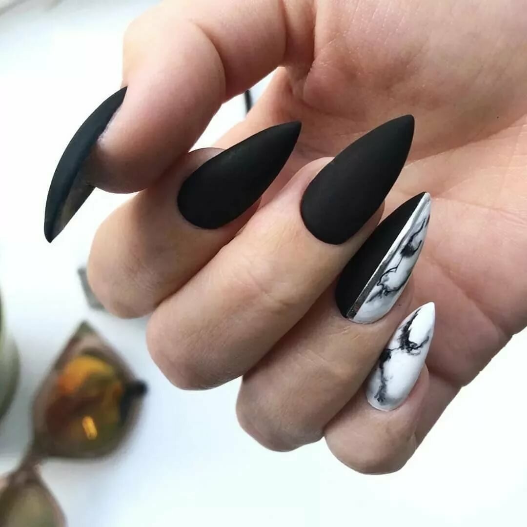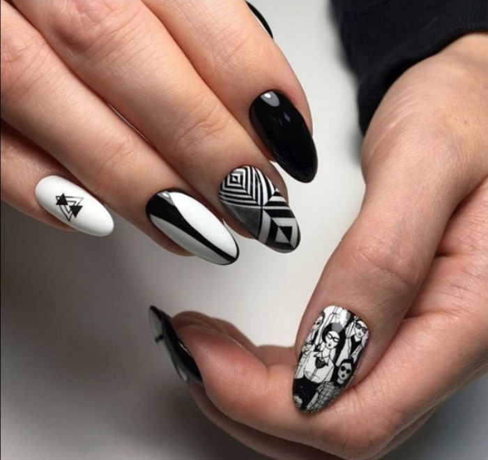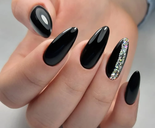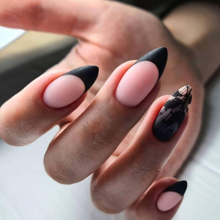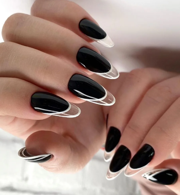 Миндалевидные ноготки — женственно и романтично. Многим кажется, что для такой формы не очень подходит мрачный лак черного оттенка. Это не так. Но если вы сторонница такого мнения, просто используйте различные сочетания цветов. Например, классическое — черный с белым, черный с красным, розовым, голубым, серебром или золотом. Несомненный плюс черного лака в его универсальности. Это цвет-база, который может сочетаться с самыми смелыми и необычными цветами. И от этого маникюр только выигрывает.