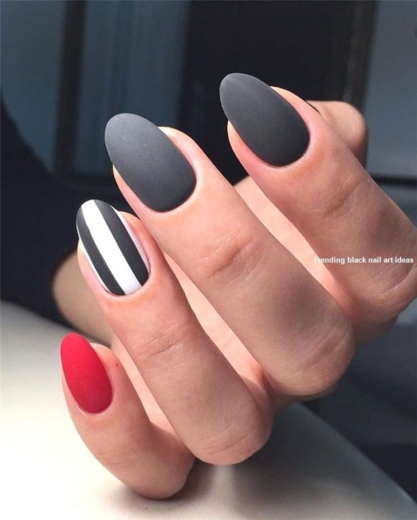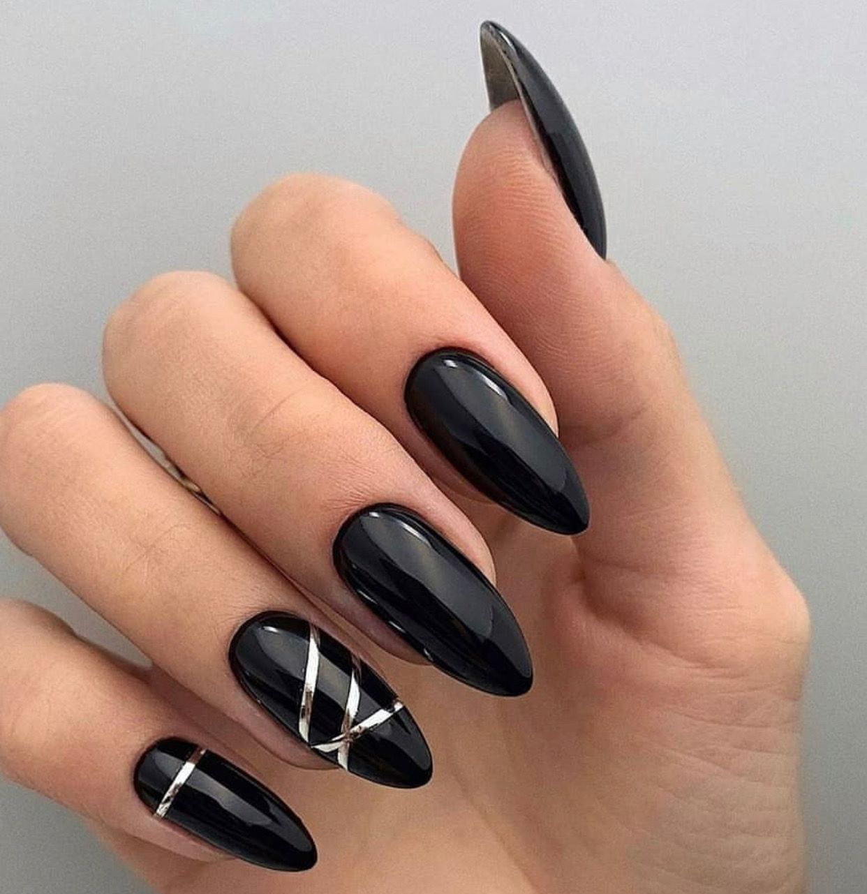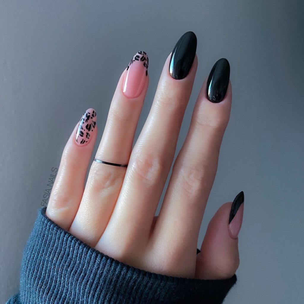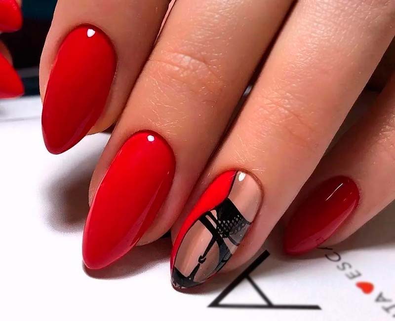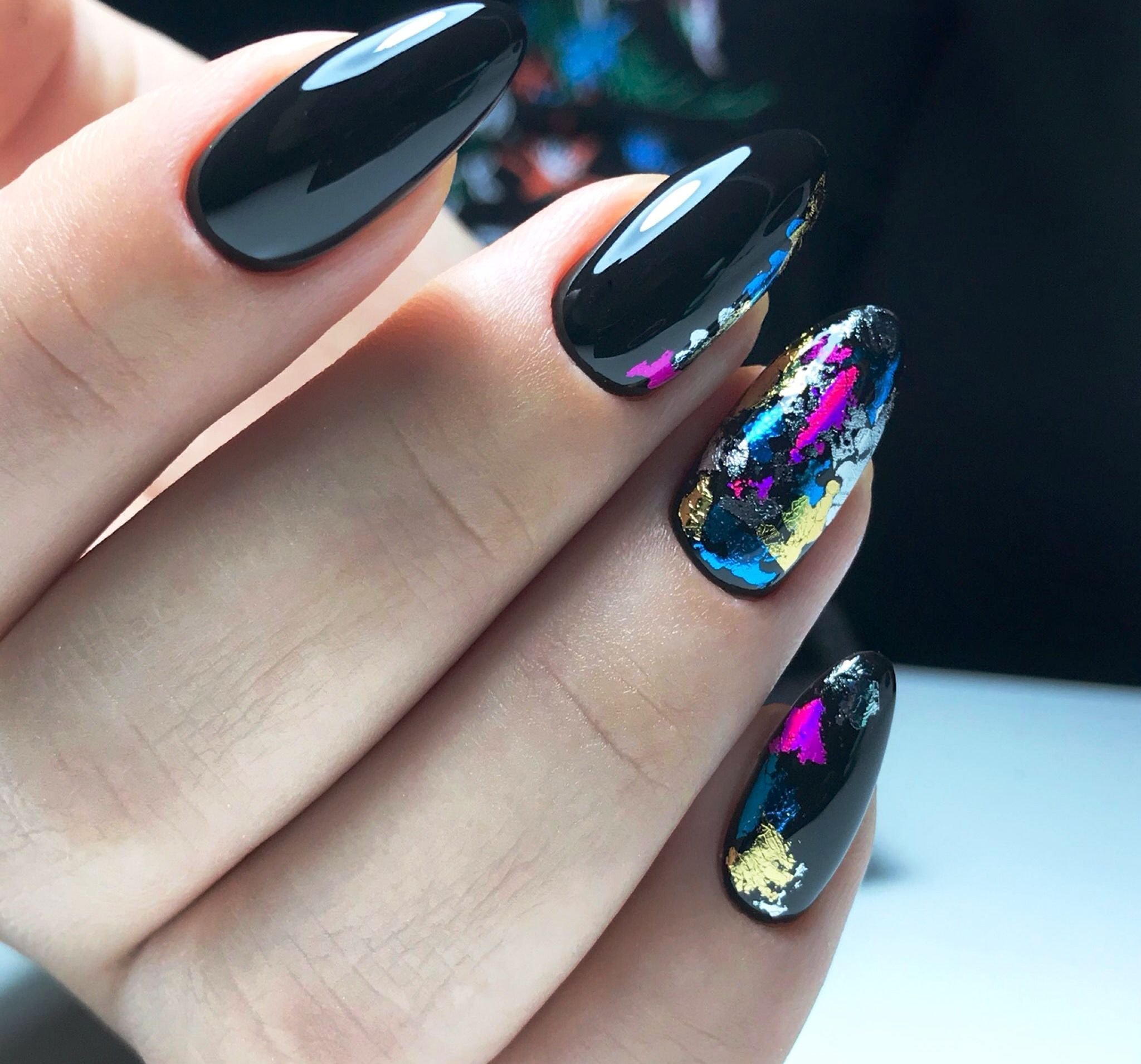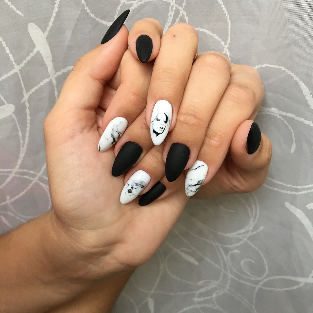 Миндалевидные ноготки — женственно и романтично. Многим кажется, что для такой формы не очень подходит мрачный лак черного оттенка. Это не так. Но если вы сторонница такого мнения, просто используйте различные сочетания цветов. Например, классическое — черный с белым, черный с красным, розовым, голубым, серебром или золотом. Несомненный плюс черного лака в его универсальности. Это цвет-база, который может сочетаться с самыми смелыми и необычными цветами. И от этого маникюр только выигрывает.
