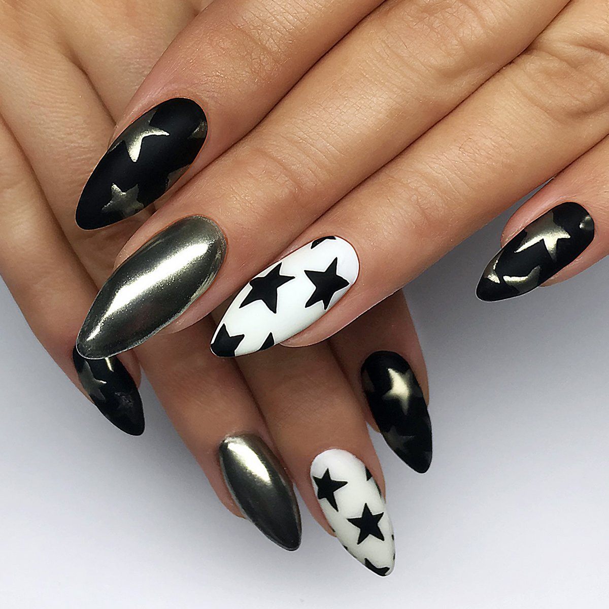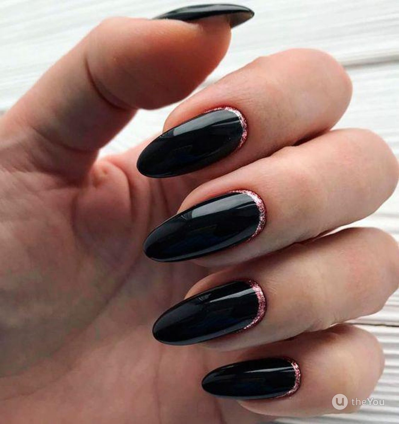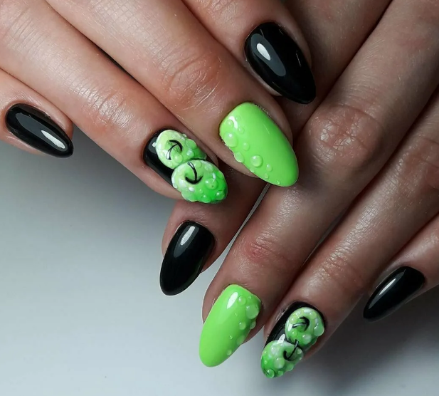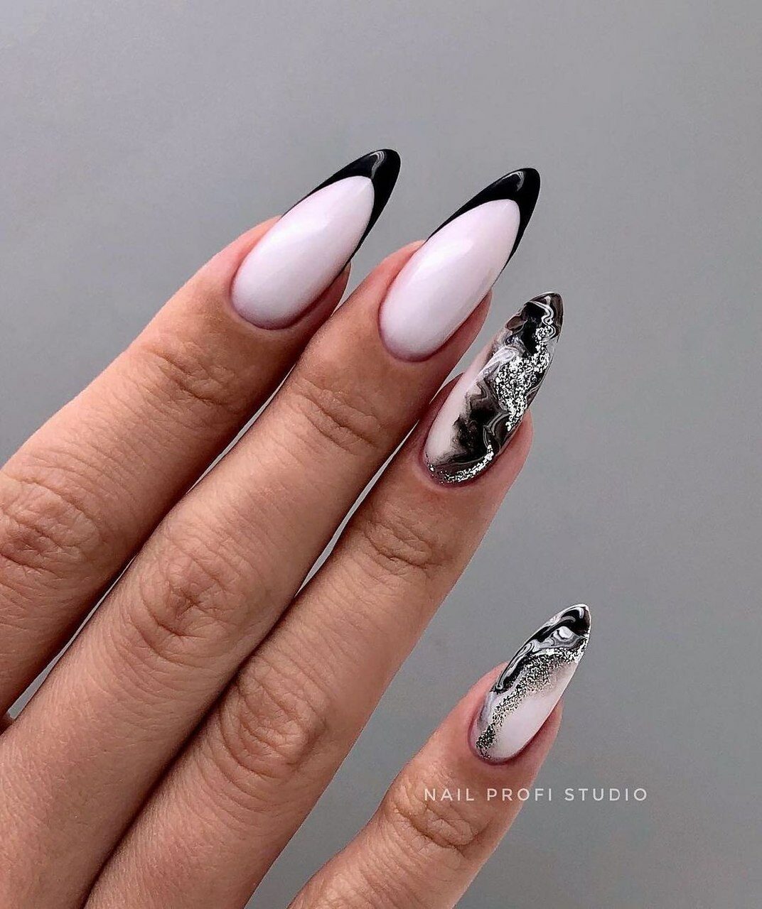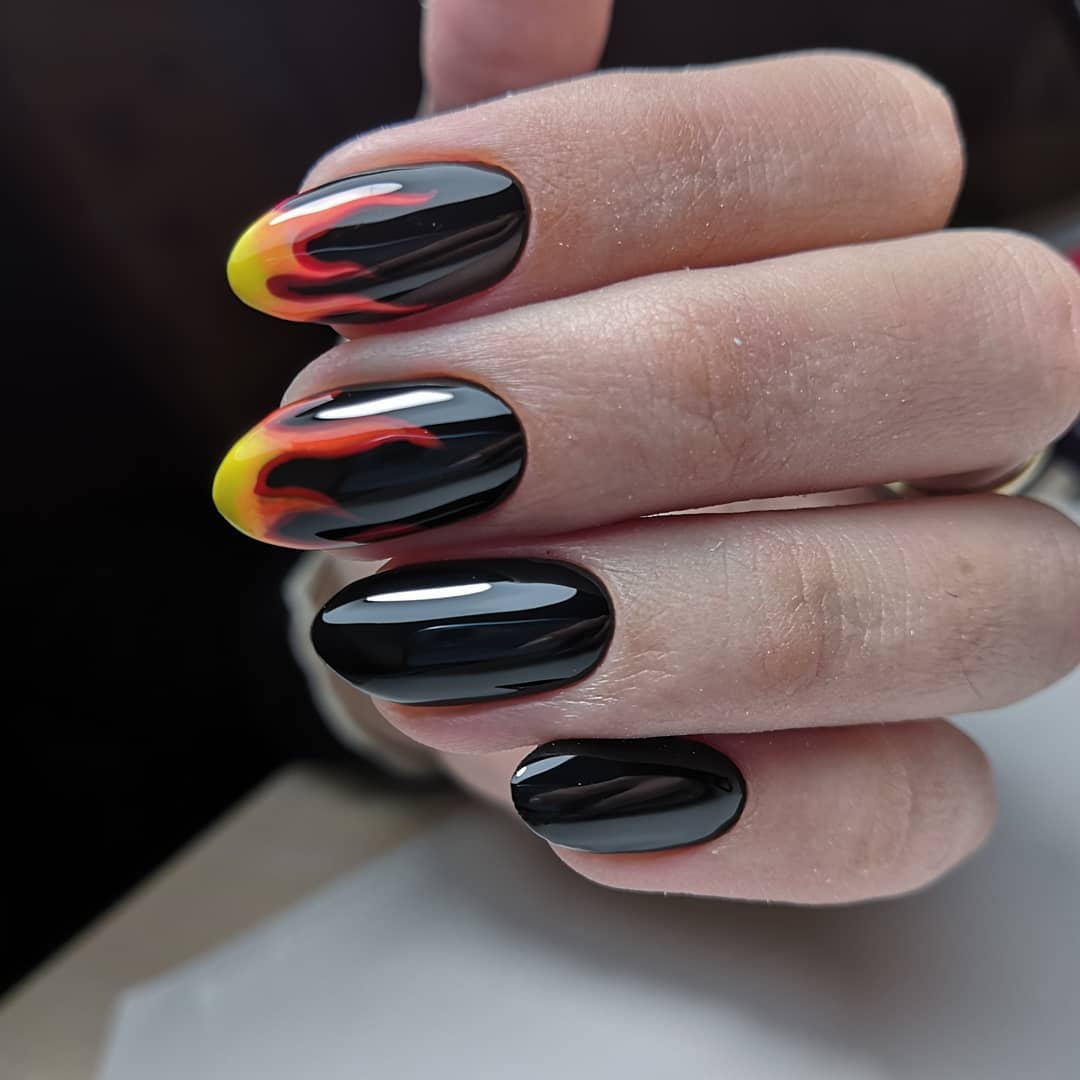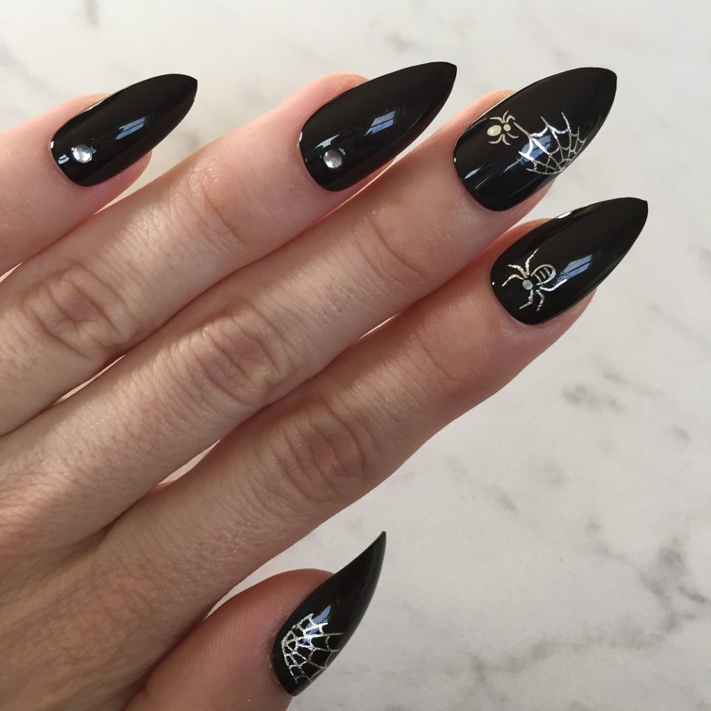 Миндалевидные ноготки — женственно и романтично. Многим кажется, что для такой формы не очень подходит мрачный лак черного оттенка. Это не так. Но если вы сторонница такого мнения, просто используйте различные сочетания цветов. Например, классическое — черный с белым, черный с красным, розовым, голубым, серебром или золотом. Несомненный плюс черного лака в его универсальности. Это цвет-база, который может сочетаться с самыми смелыми и необычными цветами. И от этого маникюр только выигрывает.
