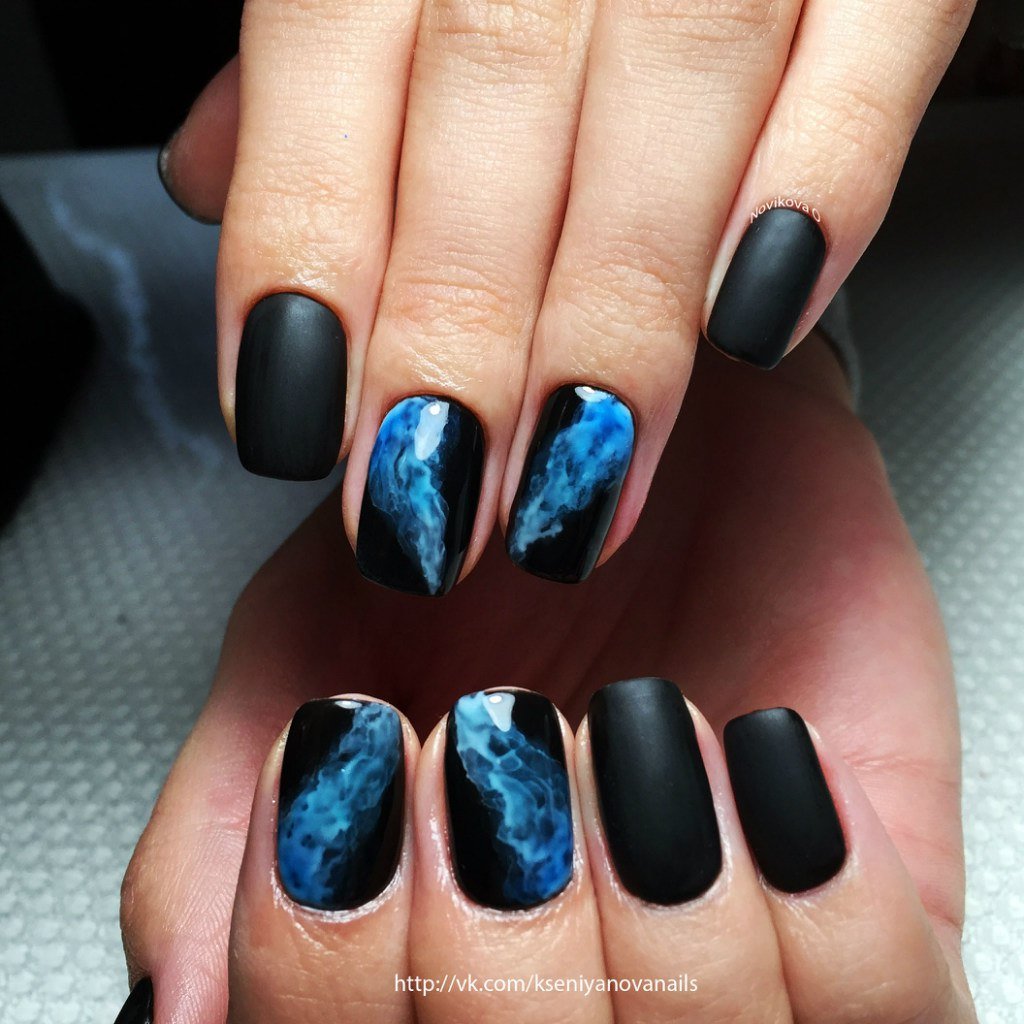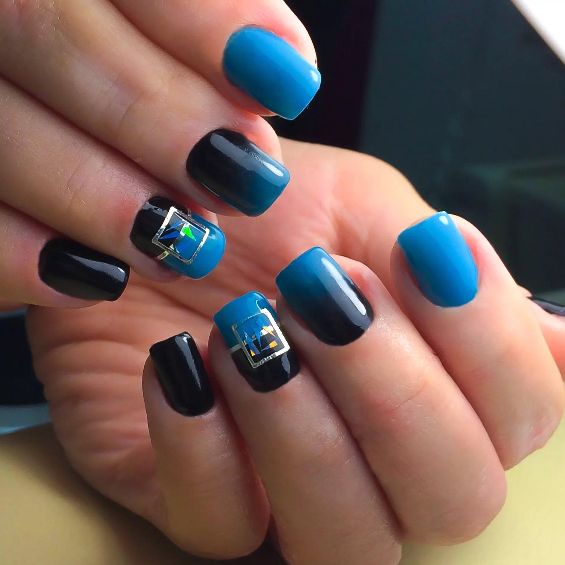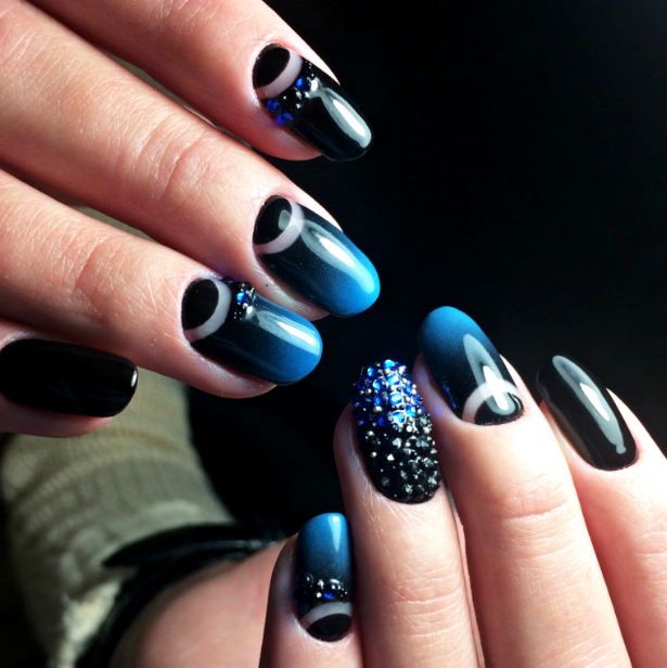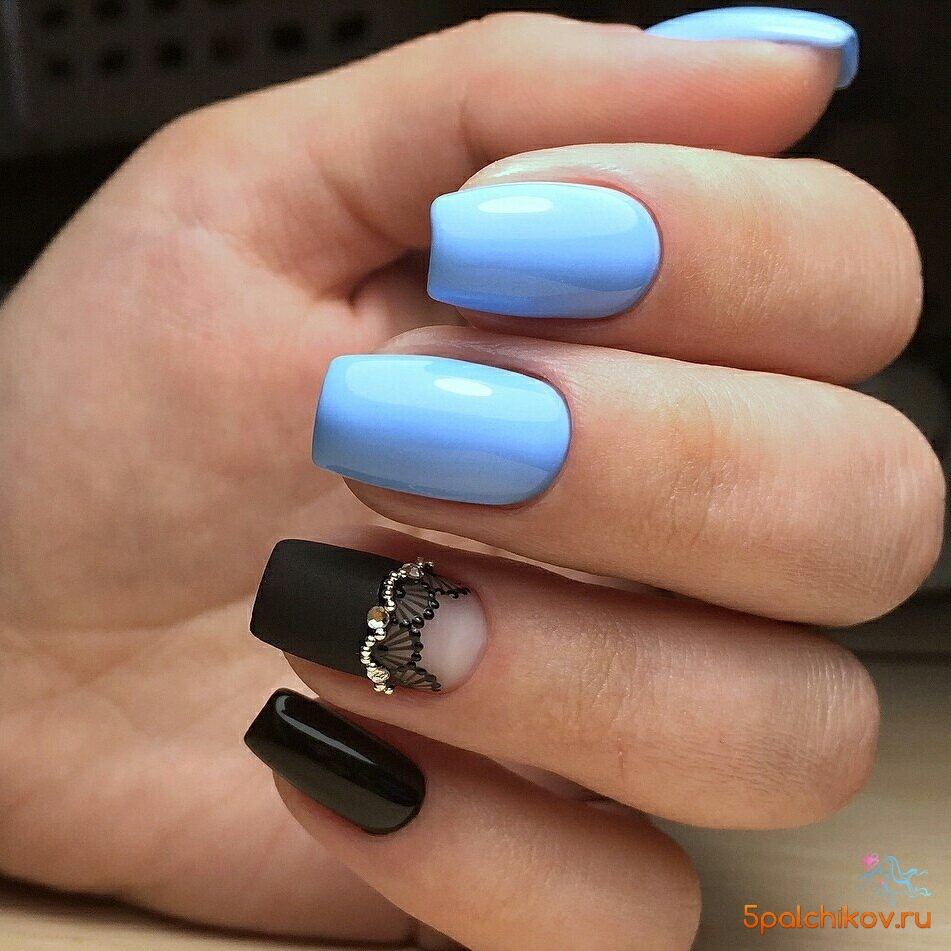 Если вы решите добавить в черный маникюр оттенок из синей палитры, выбирайте светлые тона. Иначе ваш дизайн будет слишком мрачным. обратите внимание на свой цветотип и оттенок кожи. Правильный оттенок голубого будет удачно гармонировать с кожей и сделает руки более изящными.